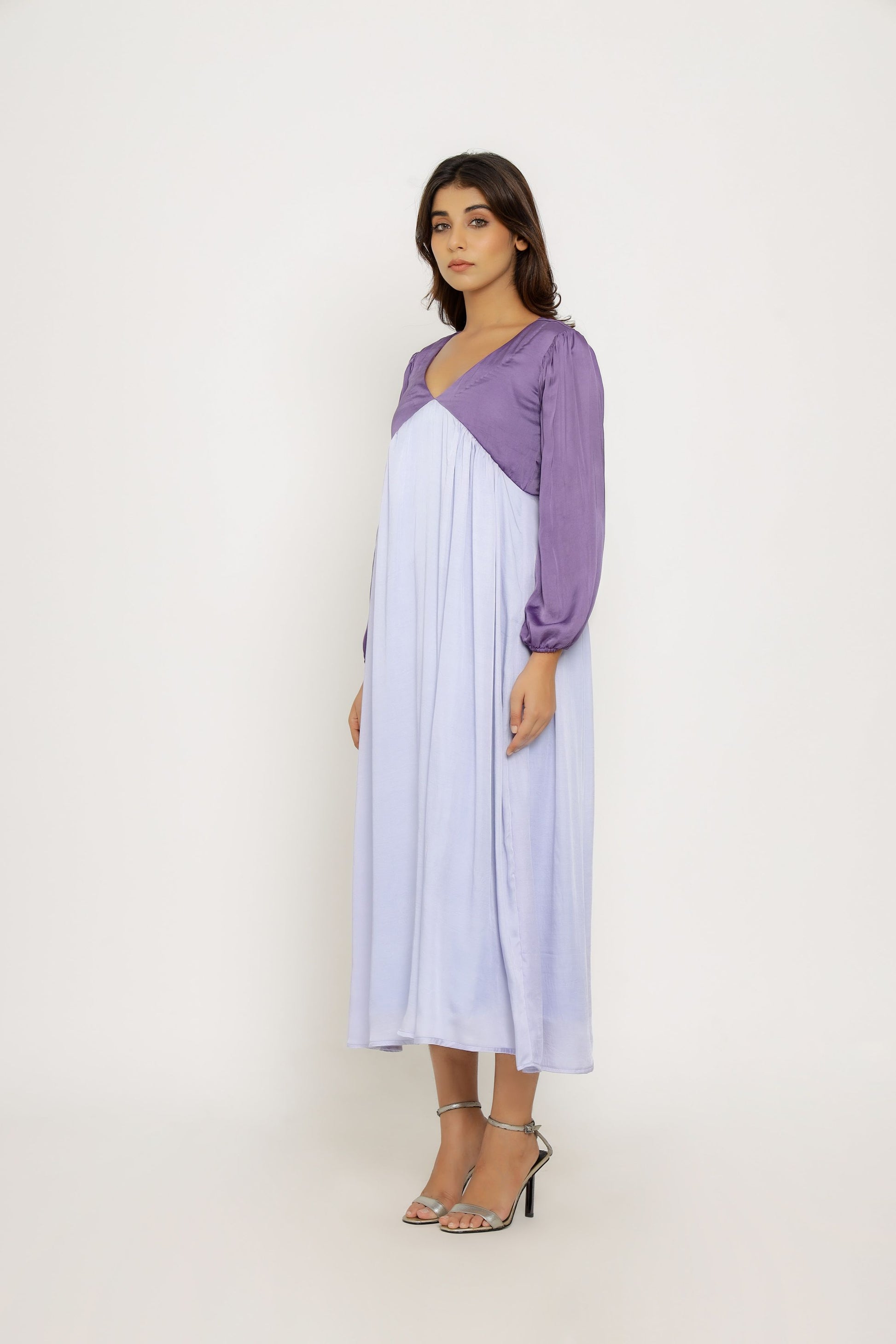 Purple-Lilac Full Length Dress with Bishop Sleeves and Gathers