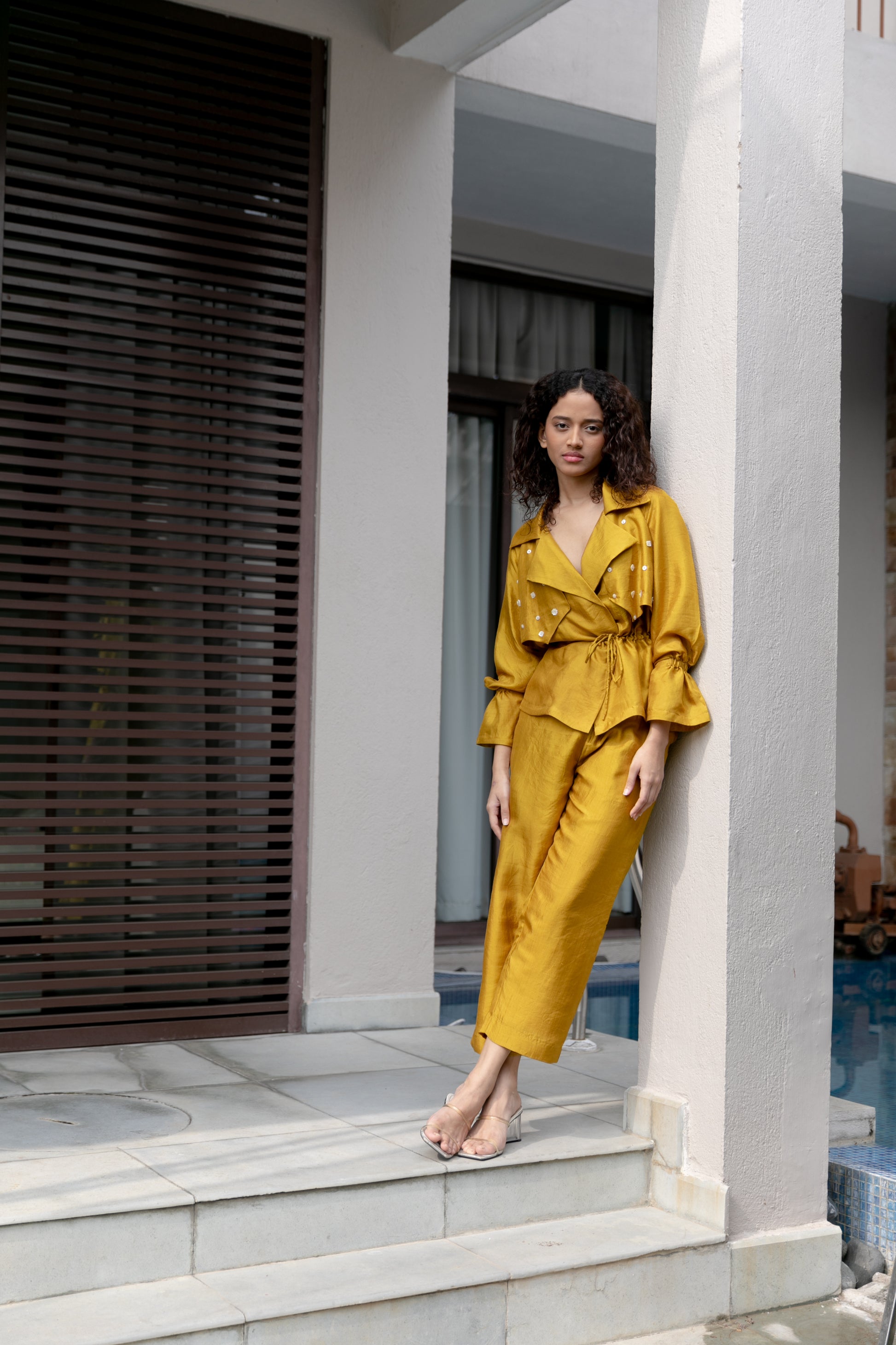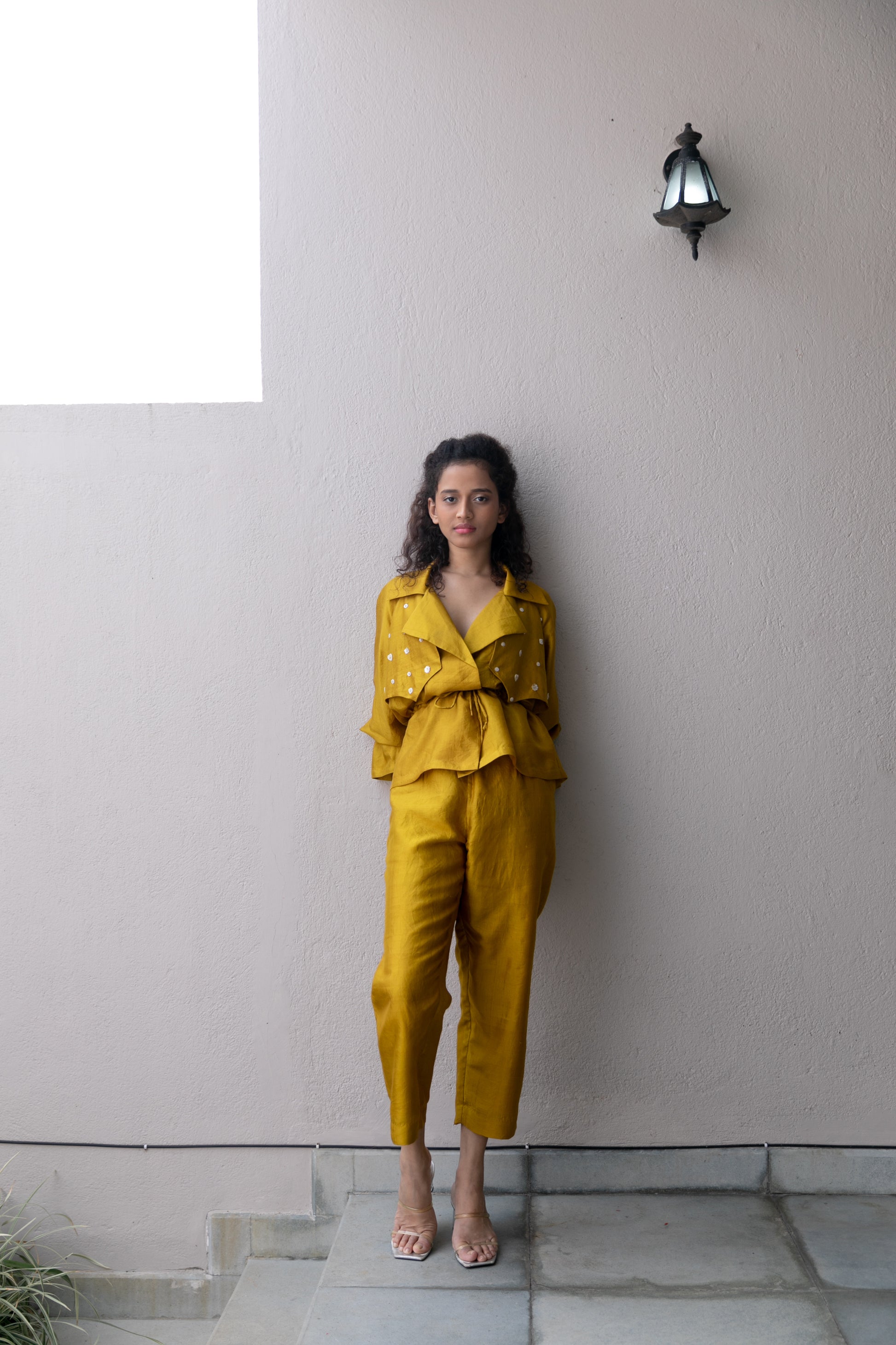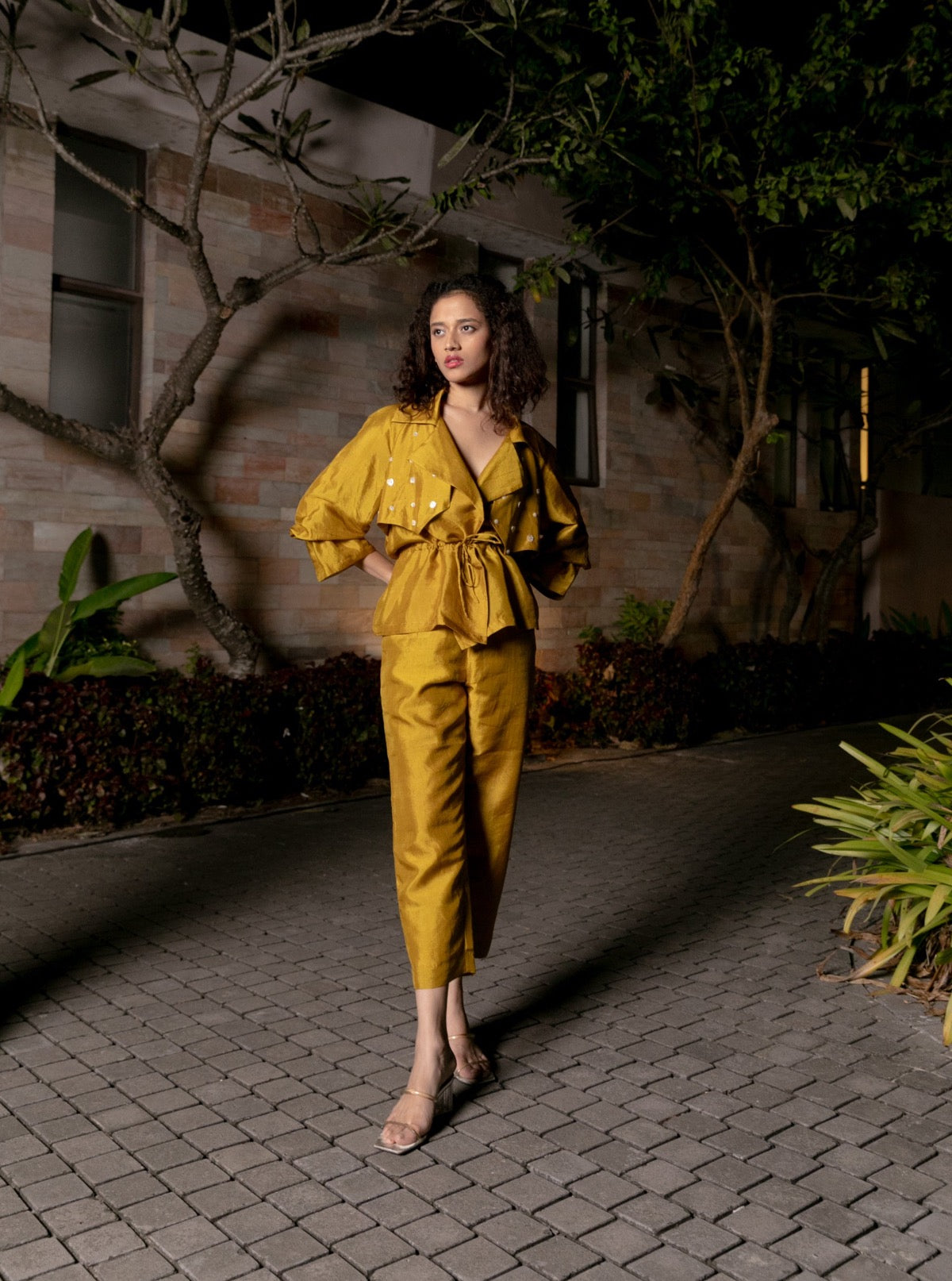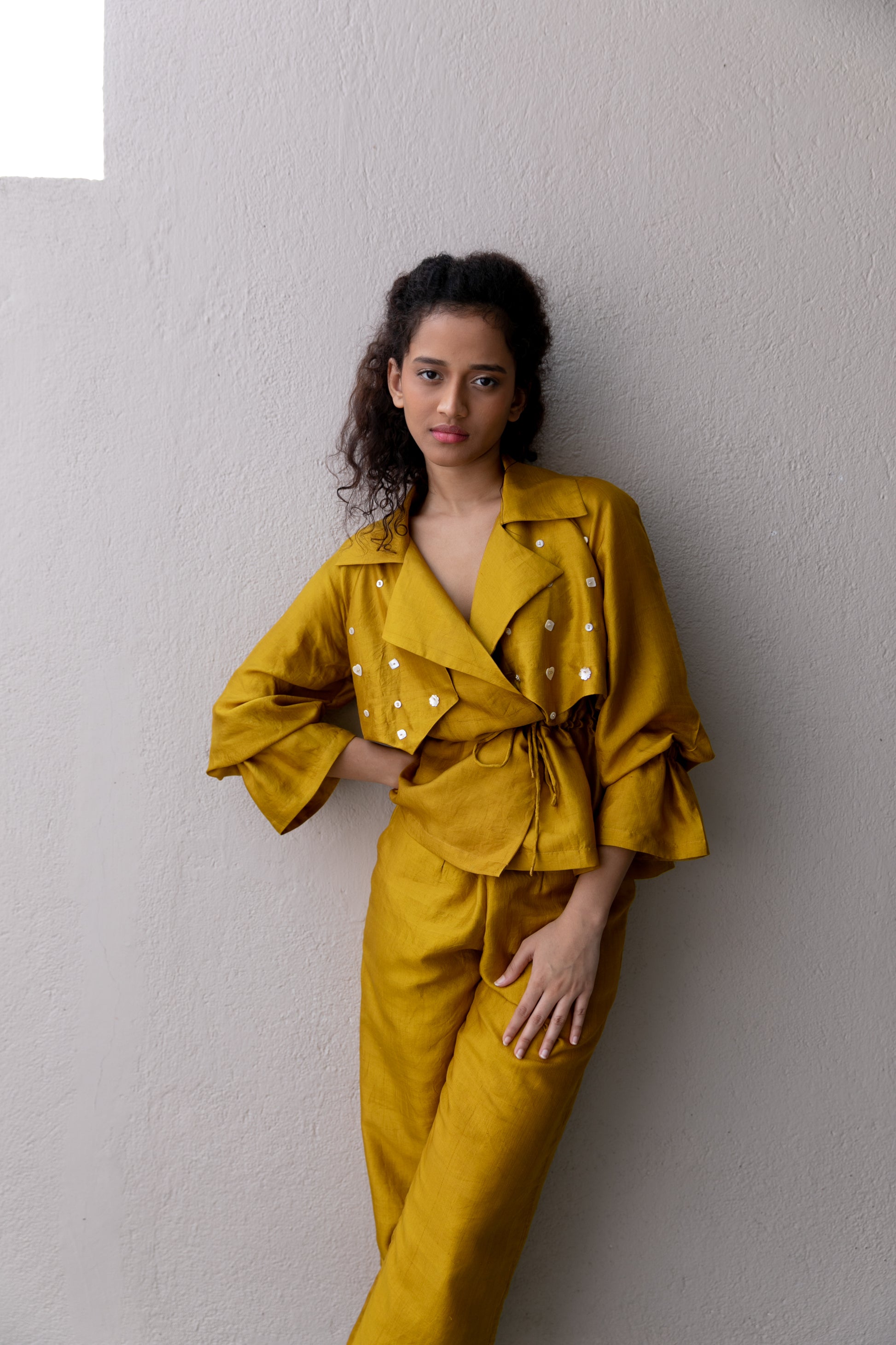 Handwoven Mulberry Silk Jacket style tie-up Co-ord Set with Mother of Pearl shell button embroidery