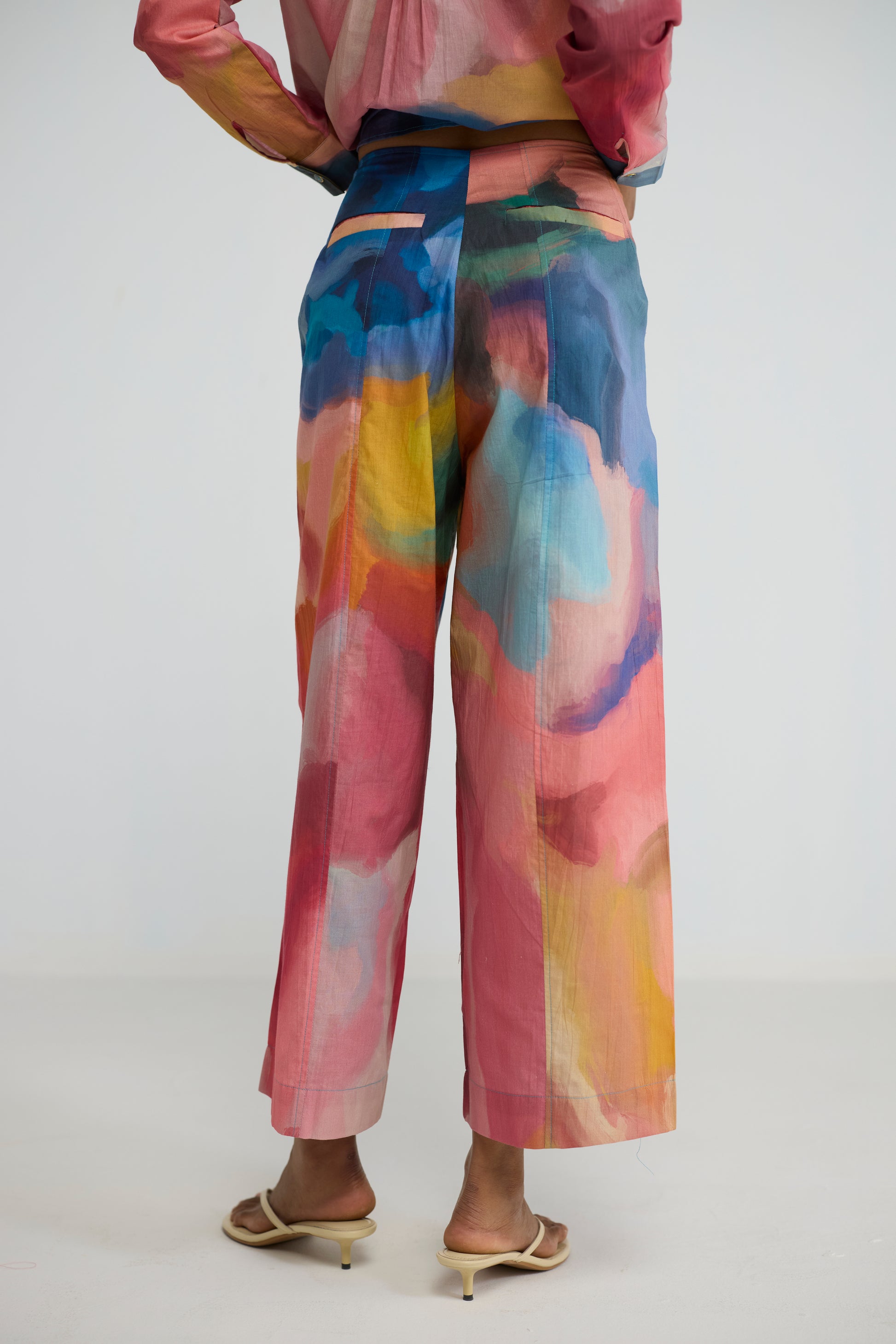 The co-ord set features an abstract, painterly print inspired by fluid brushstrokes and watercolor washes. A harmonious blend of coral pinks, soft peaches, oceanic blues, and muted earthy tones creates a dreamy, artistic canvas. The organic placement of colors gives each piece a unique, handcrafted feel, evoking modern art with a soft, summery vibrance. The seamless flow of hues across the shirt and pants enhances the visual continuity, making it effortlessly statement yet sophisticated.
