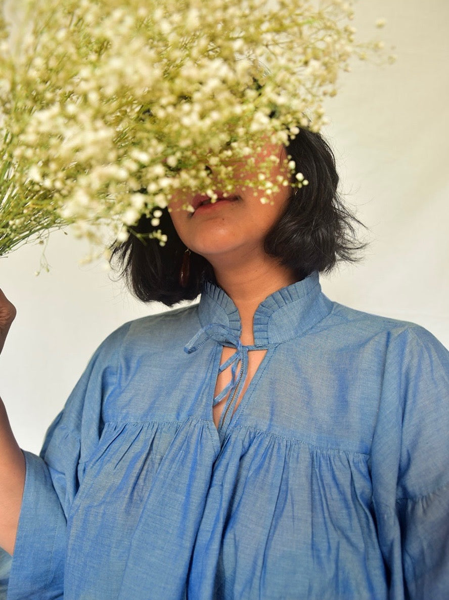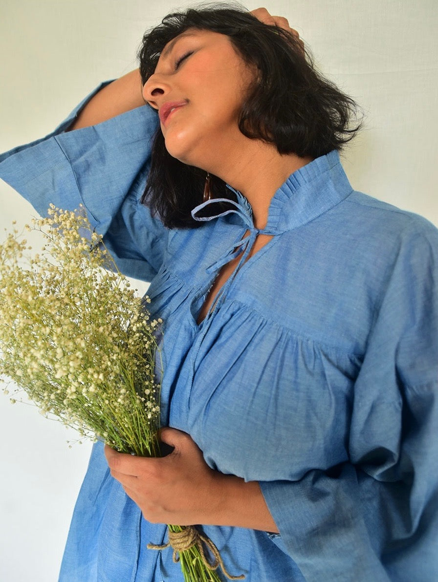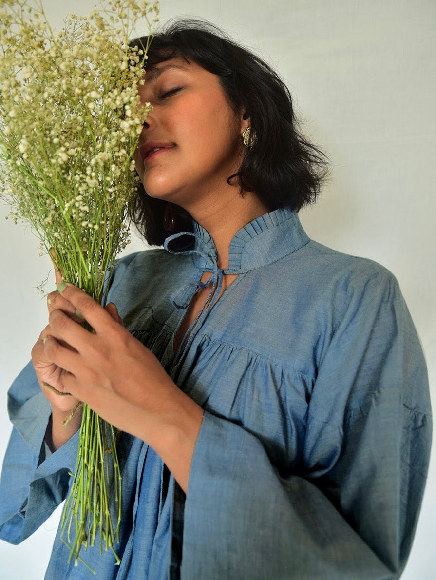 Breathable organic cotton in a muted denim blue for your board meetings, weekend errands and everything in between! The top has a close collar with pleated detailing and a tie. The sleeves are loose and pleated, with peats on the bodice as well. These soft, organic cotton pants are cut in muted denim blue, keeping you comfortable all day long!