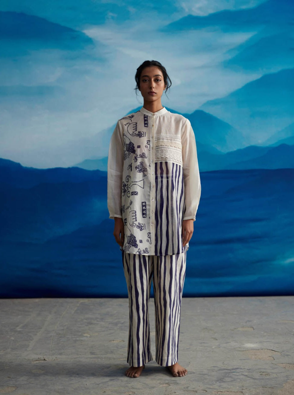 The enduring mandarin collar shirt, with hand-screen printed patterns and lace details, embodies a modern reinterpretation of the traditional long shirt. The harmonious blend of diverse textures dispels any monotony, infusing a versatile and contemporary allure into this essential wardrobe piece. Its timeless nature renders it an ideal option to enhance the charm of any casual ensemble.