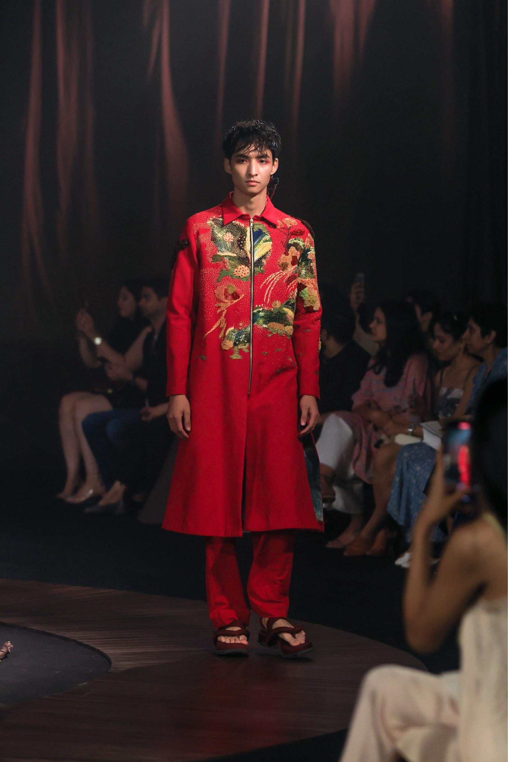 This embroidered long jacket set made in handspun cotton features breathtaking textures created from hand embroidered thread work finished with a front open zipper. It is paired with red hand dyed tailored trouser.