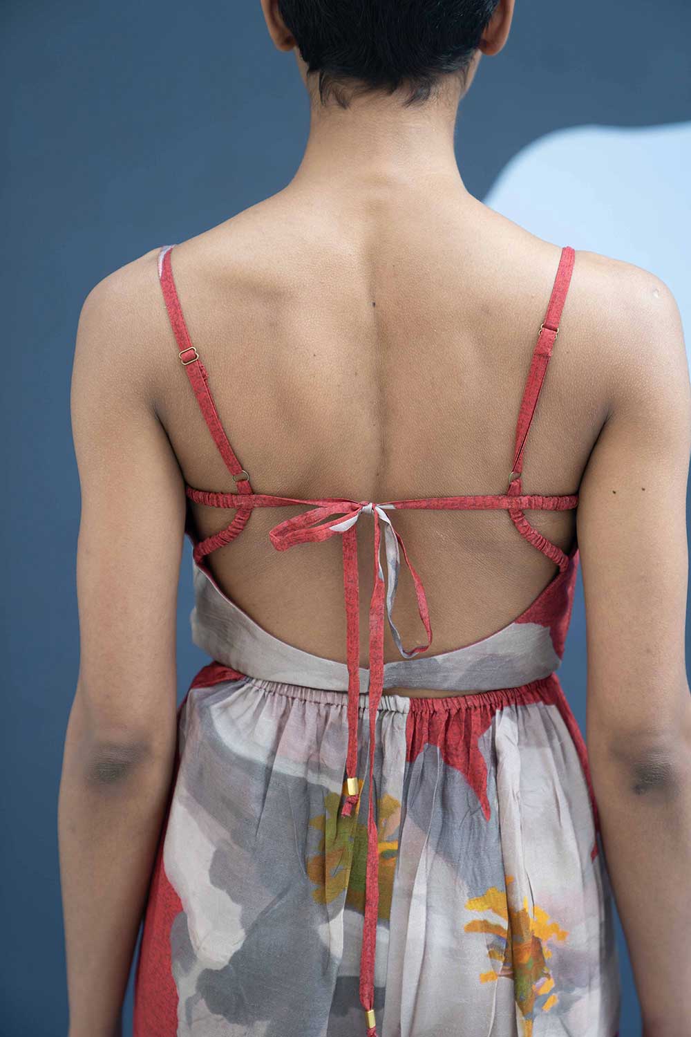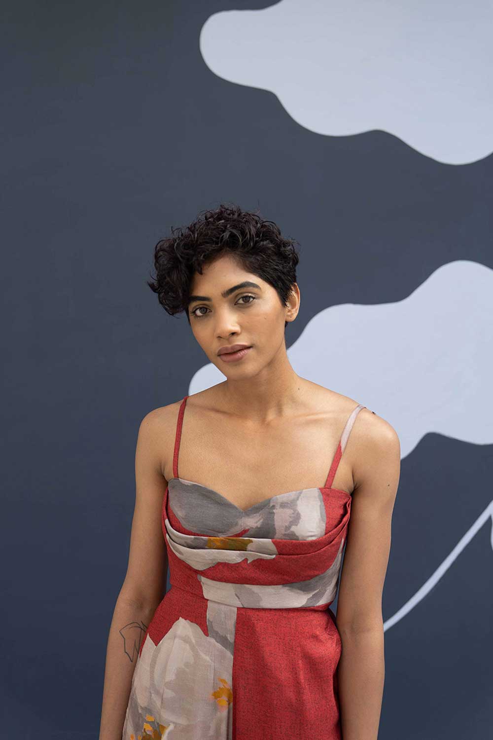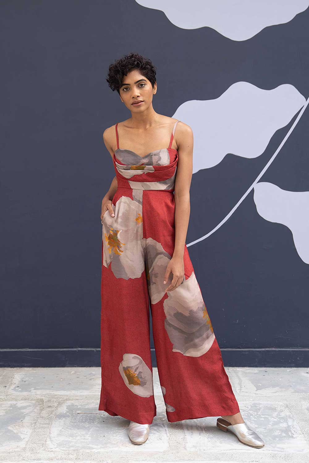 The jumpsuit is crafted in a unique red color with massive white poppies carefully printed on Dora silk.