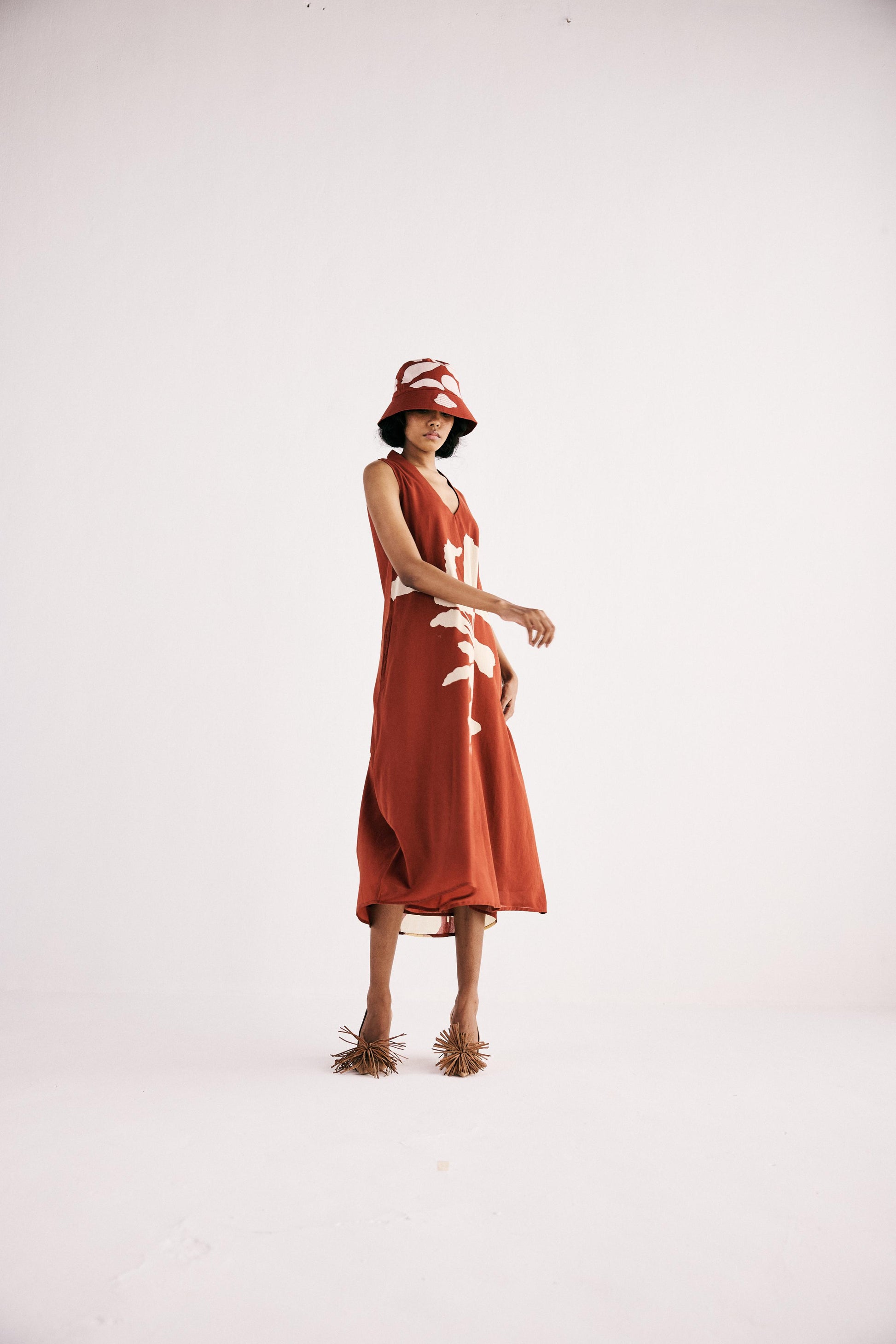 A classic brick red A line midi dress, featuring a v neckline crafted from breathable soft cotton mul fabric. adorned with a statement print.
