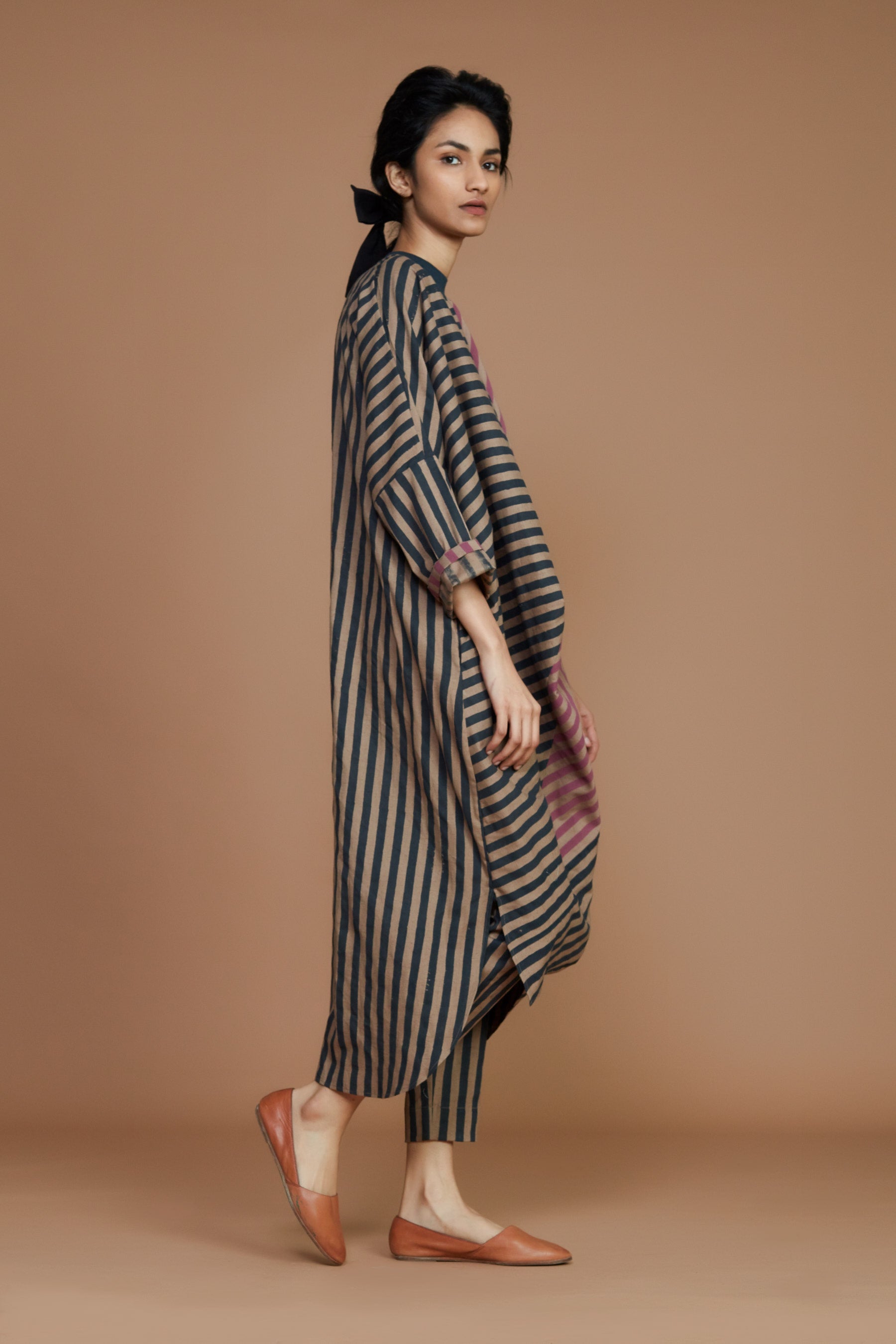 Ribbed Cowl Tunic Striped Brown Co-Ord Set of 2