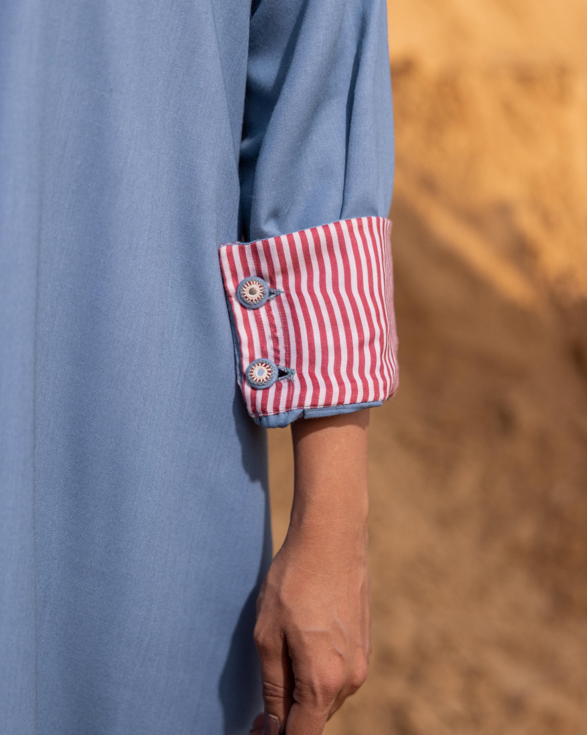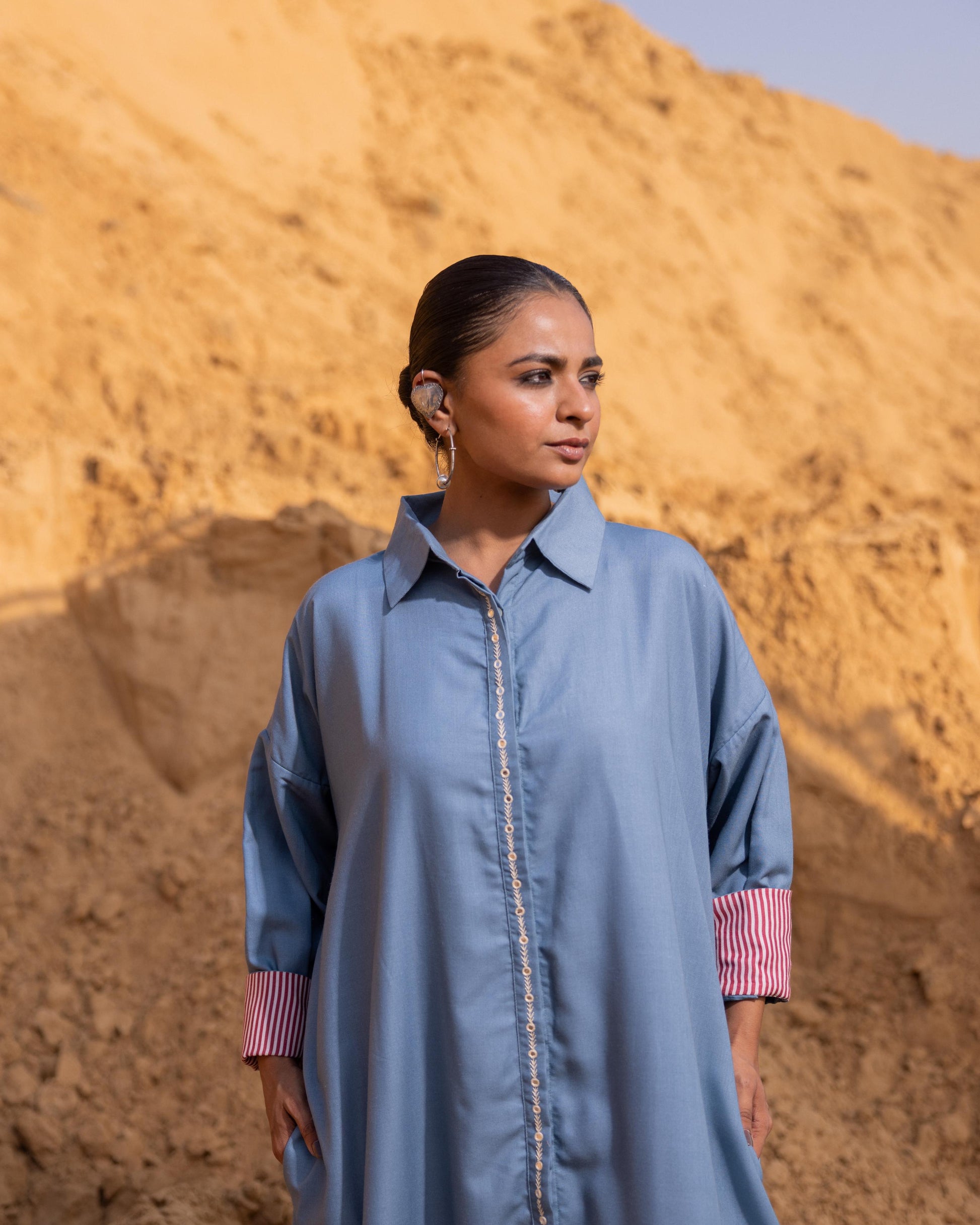 A long shirt-style dress designed with a playful back slit for effortless movement. Subtle detailing on the cuffs and back yoke adds a refined touch, creating a stylish and contemporary look that is both elegant and versatile.