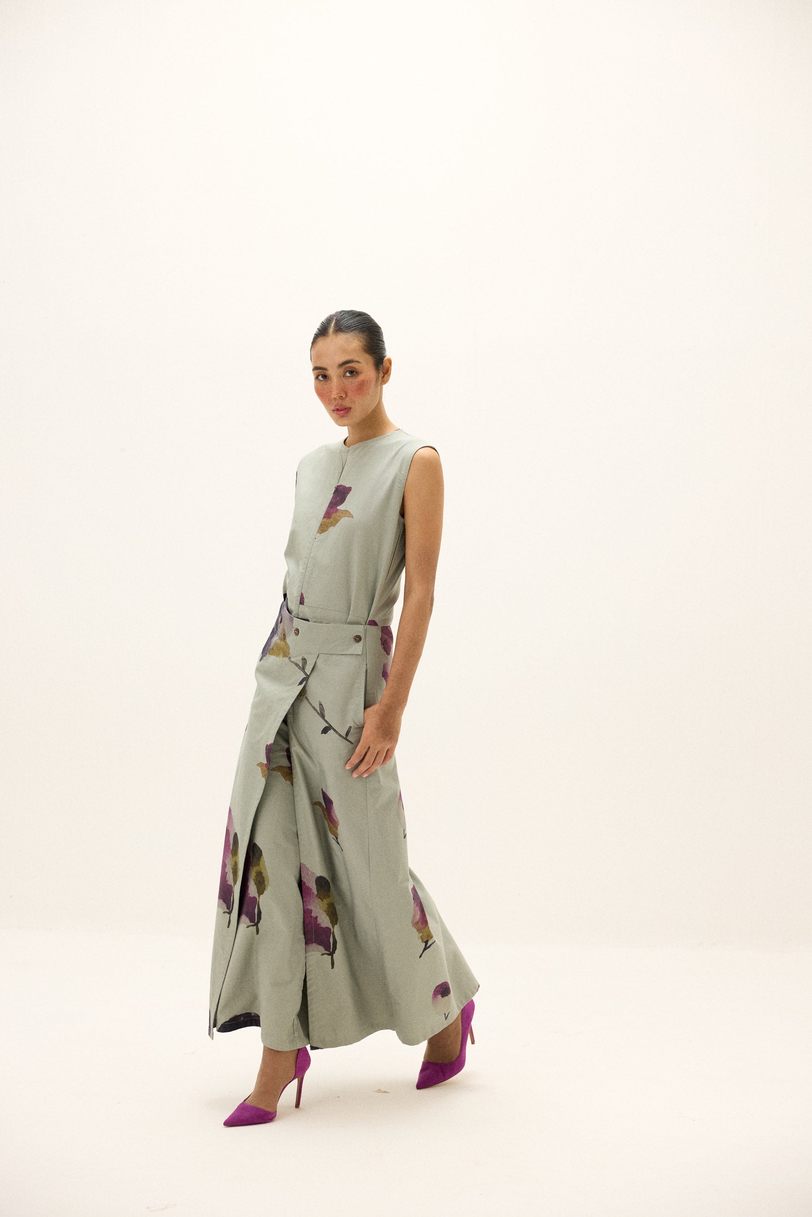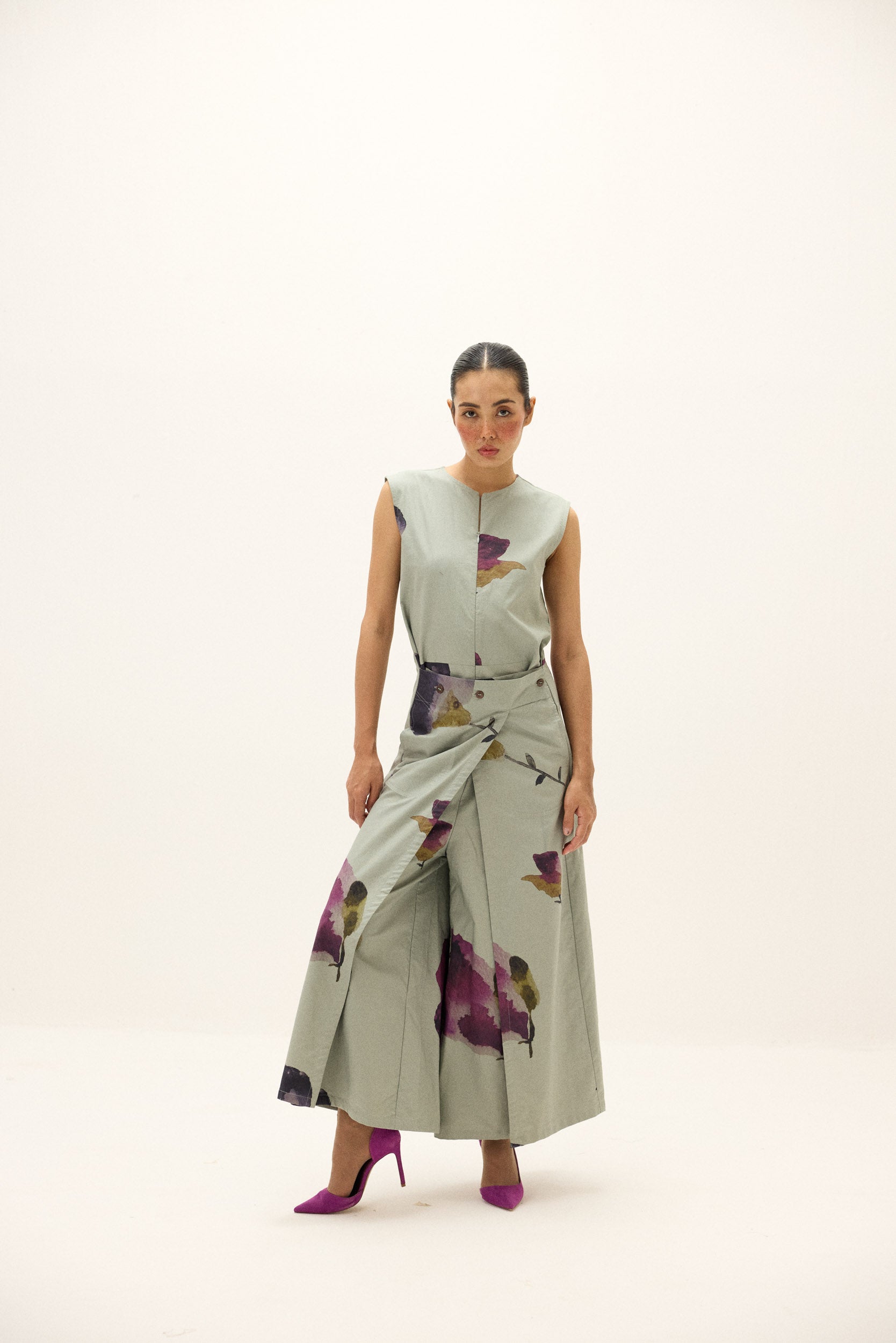 A sleeveless, wide-leg jumpsuit in soft Oxford cotton, featuring painterly florals in deep plum and ochre. The front overlap detail adds structure, balanced by a relaxed, fluid drape. Finished with side pockets and a concealed placket for a clean, modern look.