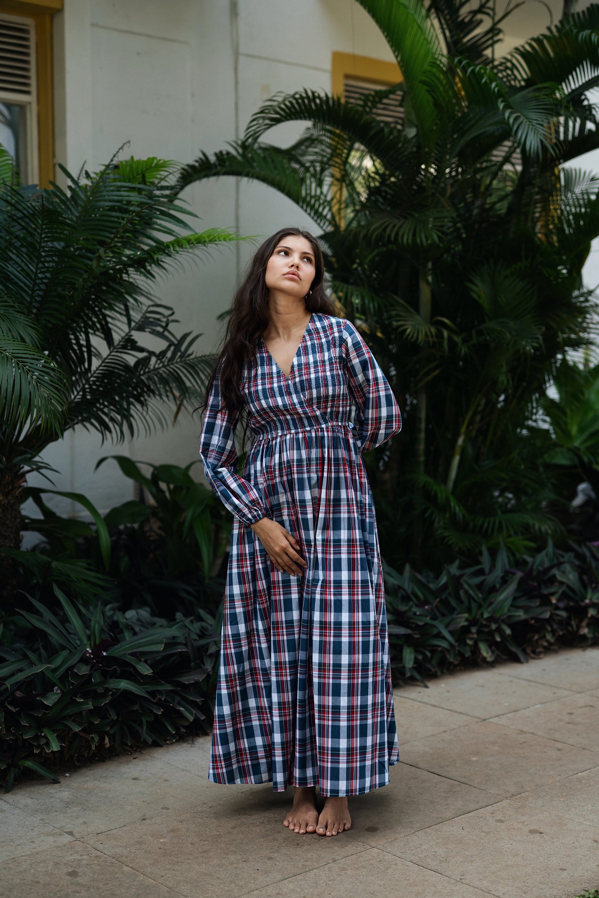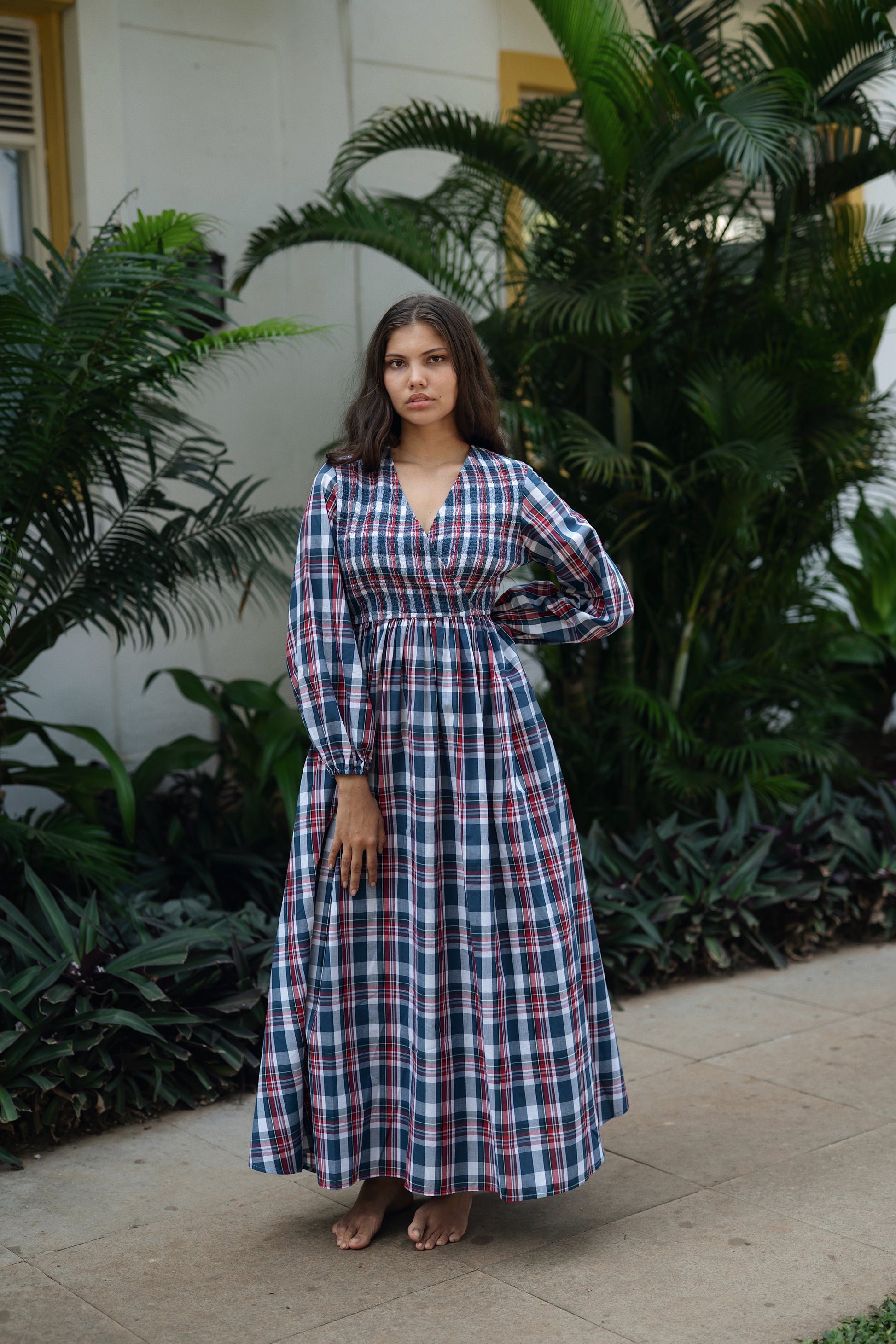 The Roosh dress is made from our madras checks fabrication. It has smocking detailing on the upper body with gathers under the bust to give a good shape.