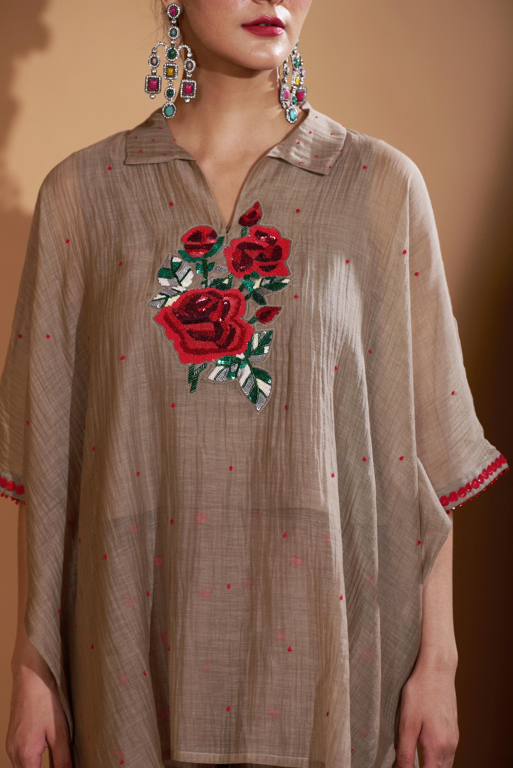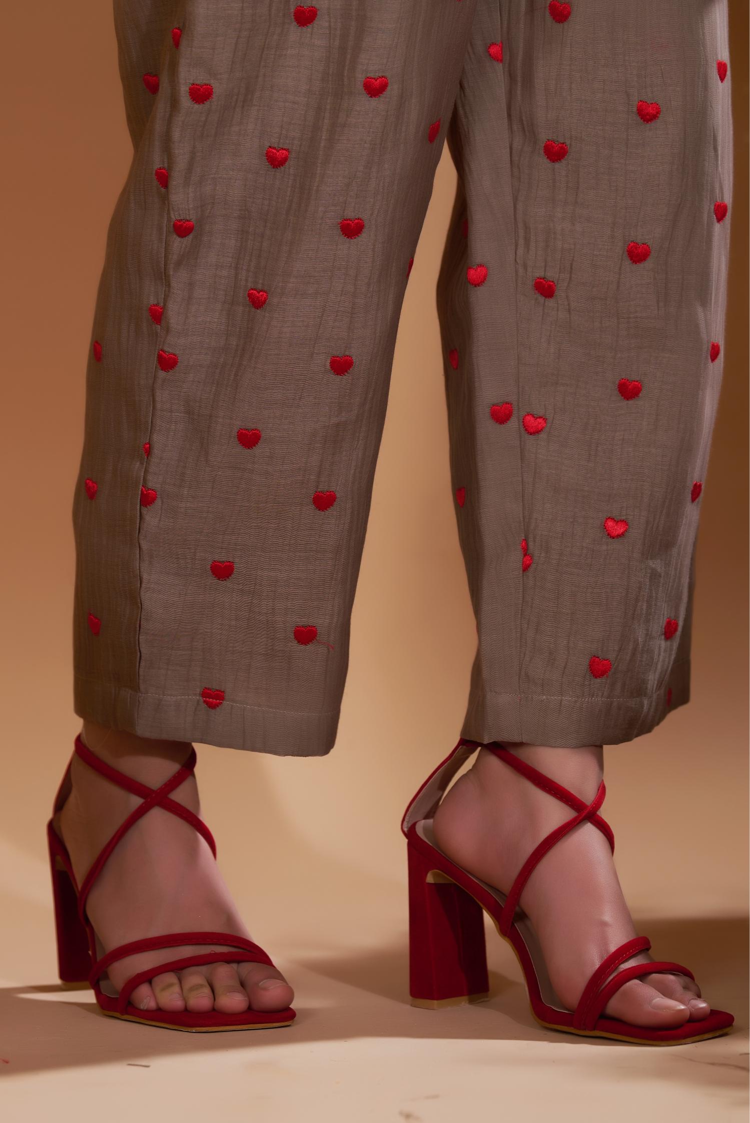 A unique mix of statement and comfort, relaxed kaftan style co-ord with beautiful hand embroidered rose with sequins work all over. The set is featured with heart embroidered pant paired with sleeveless short slip