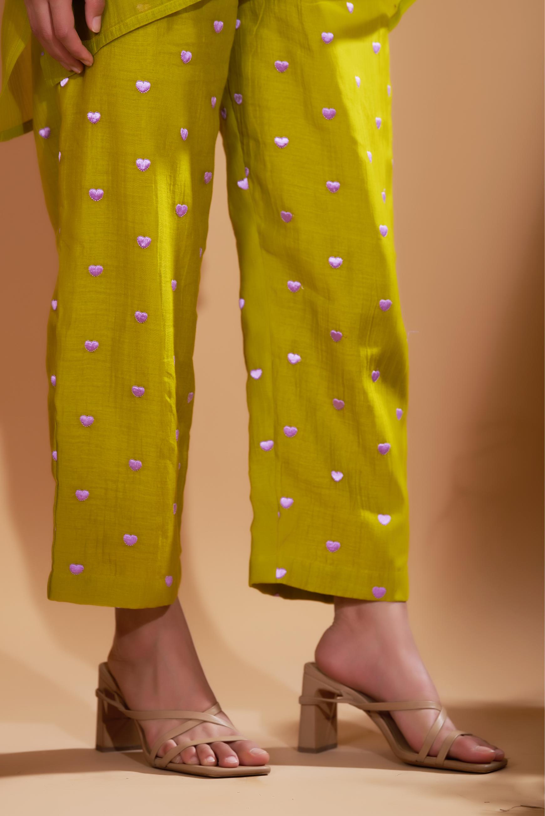 A unique mix of statement and comfort, relaxed kaftan style co-ord with beautiful hand embroidered rose with sequins work all over. The set is featured with heart embroidered pant paired with sleeveless short slip