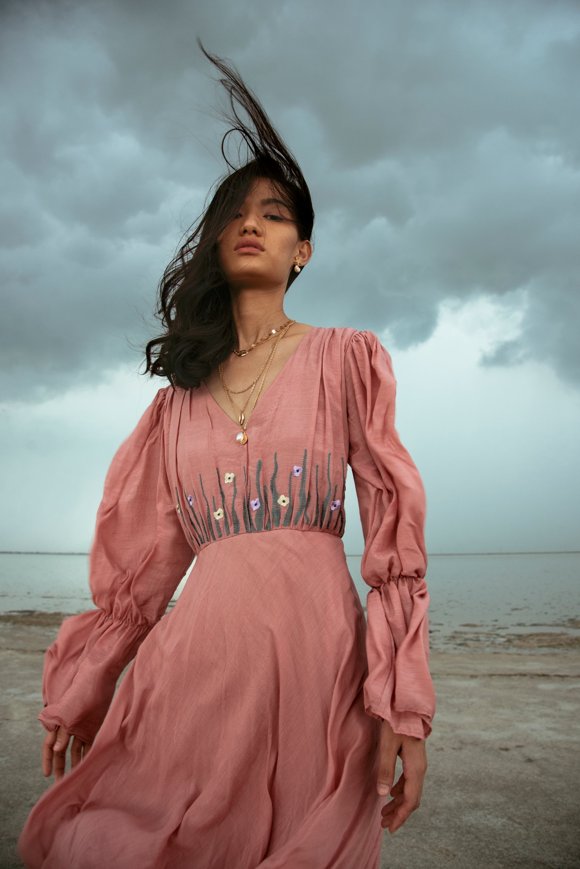 This beautiful style is made in pure silk fabric. The color is soothing & a treat to eye. It’s a two tier dress with v neck & puffed flounce sleeves. It has beautifully crafted coral motifs hand embroidered using versatile techniques in striking teal green silk threads & small flowers on the bodice. This dress is a go-to-piece for every occasion. This collection is an assorted range of textiles & handspun fabrics sourced from Banaras, Islampur, Murshidabad & quaint villages of India. The inspiration for the embellishments & embroideries has been derived from the artist Huguette Caland and her work over the years. Intricate crafts like sujani & kantha are the key embroidery techniques been used.