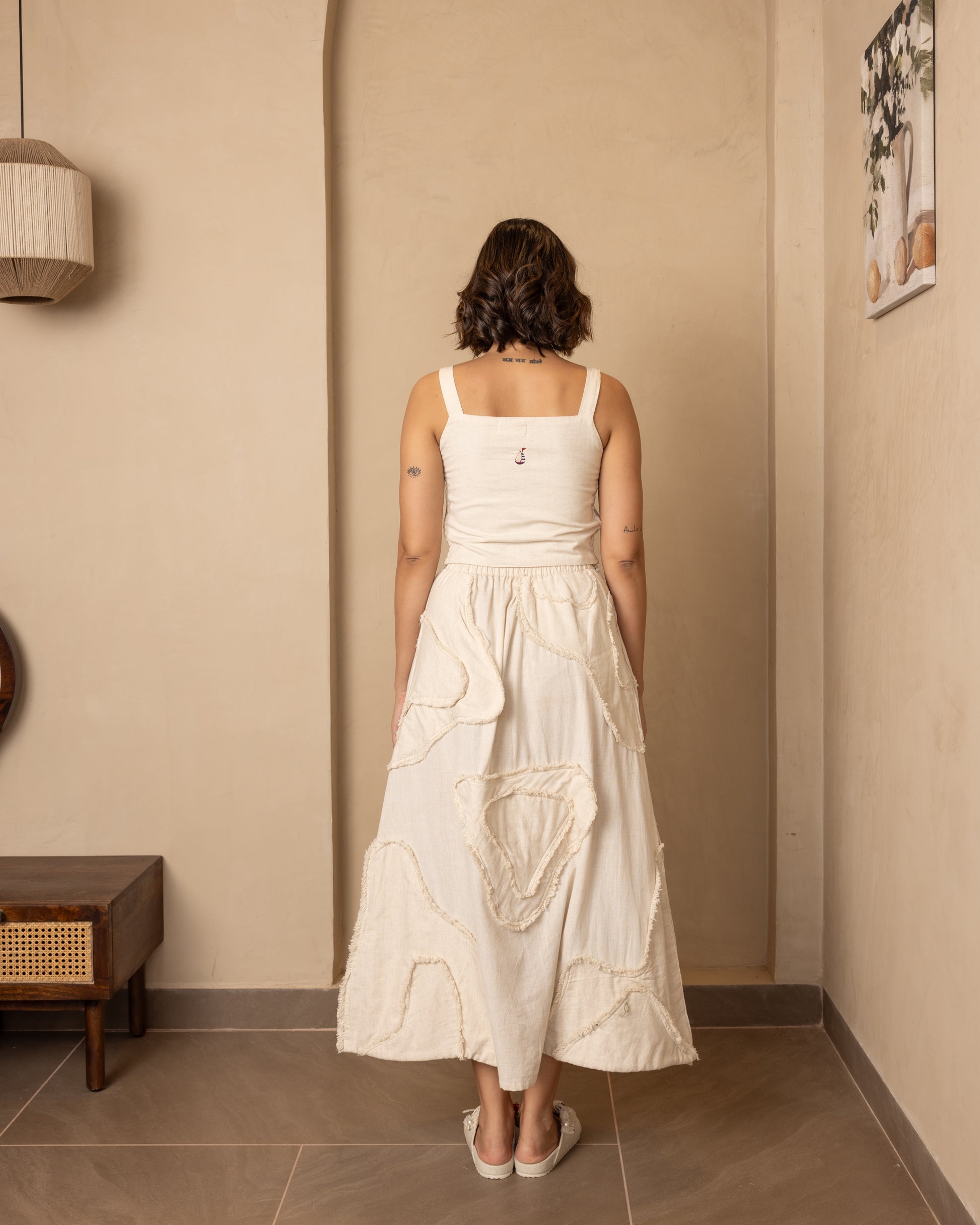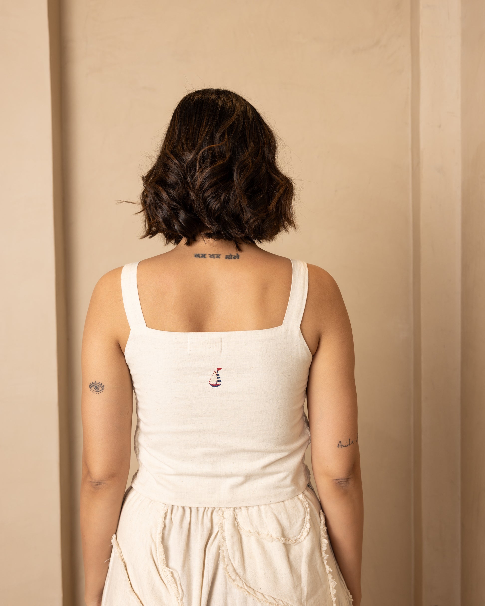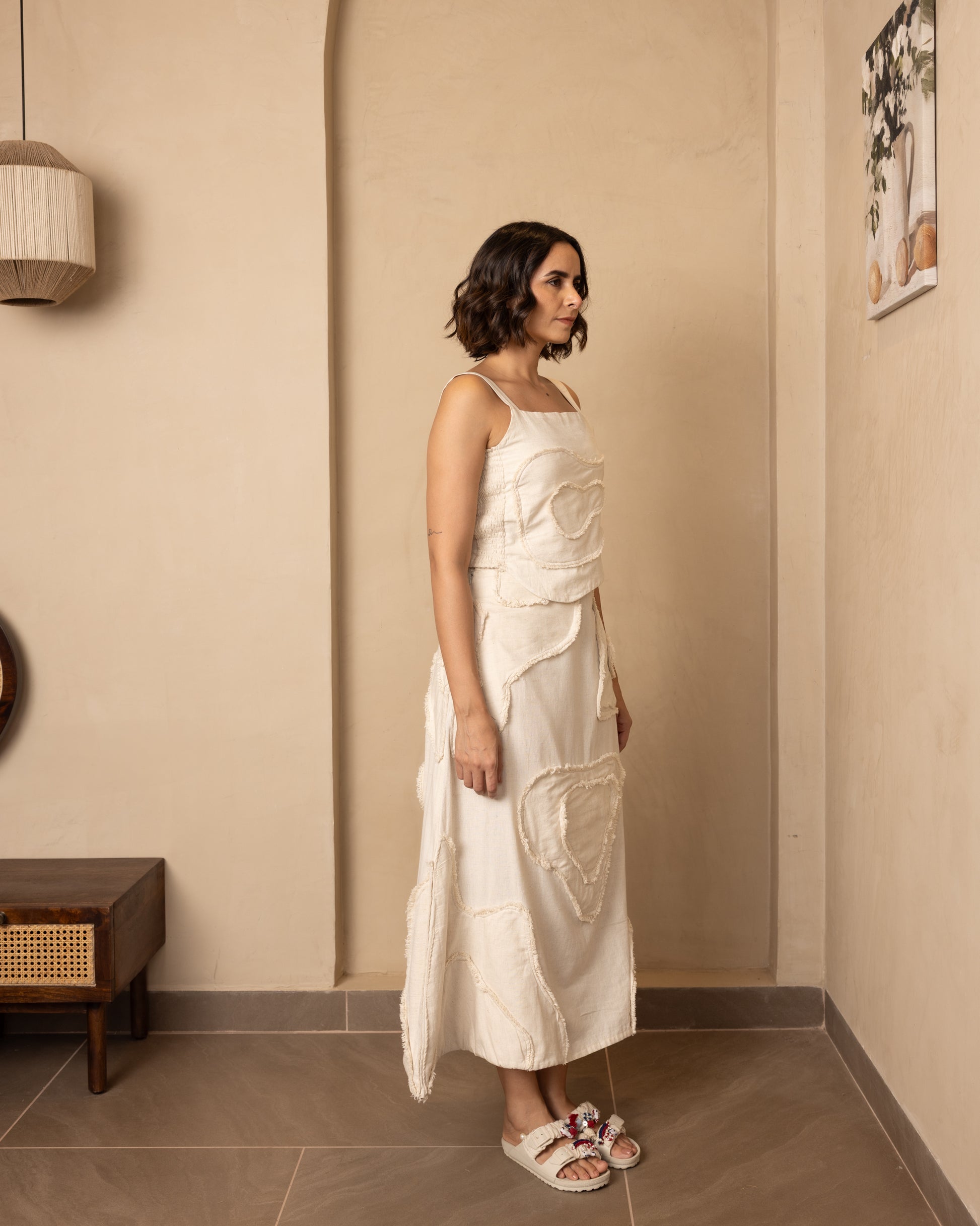 Intricate shoulder-to-sleeve lace detailing adds a touch of femininity and grace, while embroidered buttons along the neckline offer a polished finish. A standout feature of this dress is the tassel detailing on the back yoke line, adding whimsical charm and a unique focal point to the ensemble