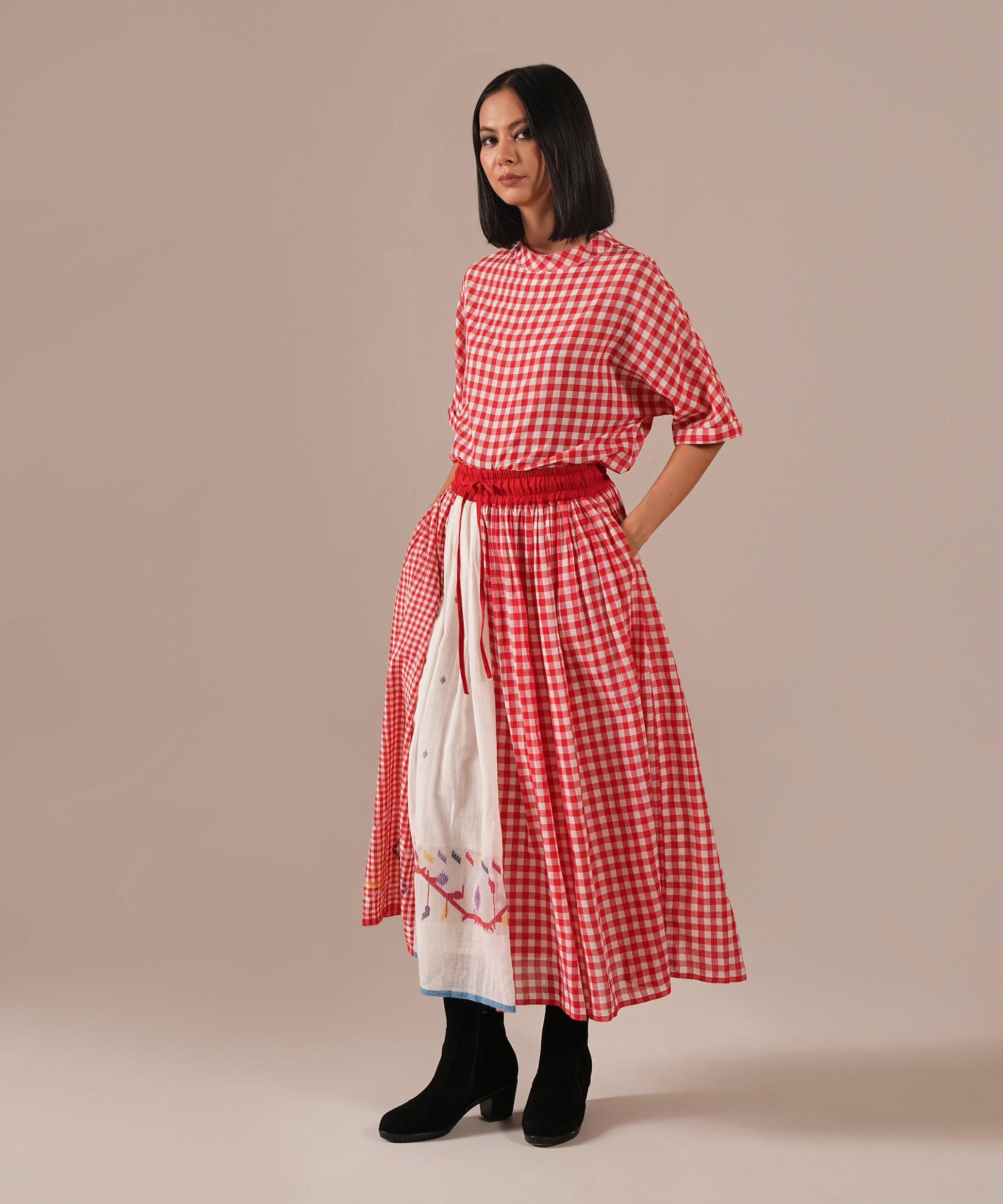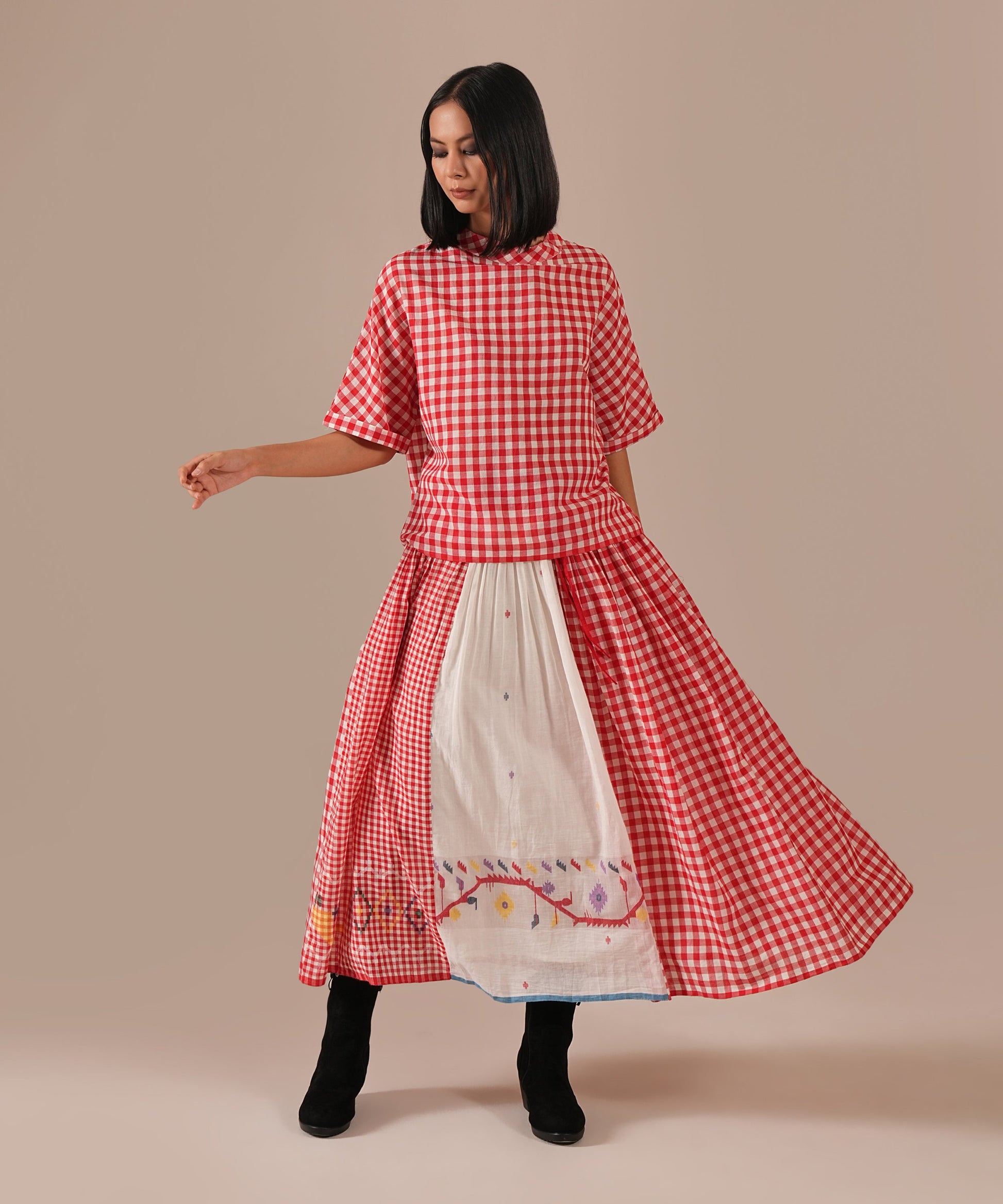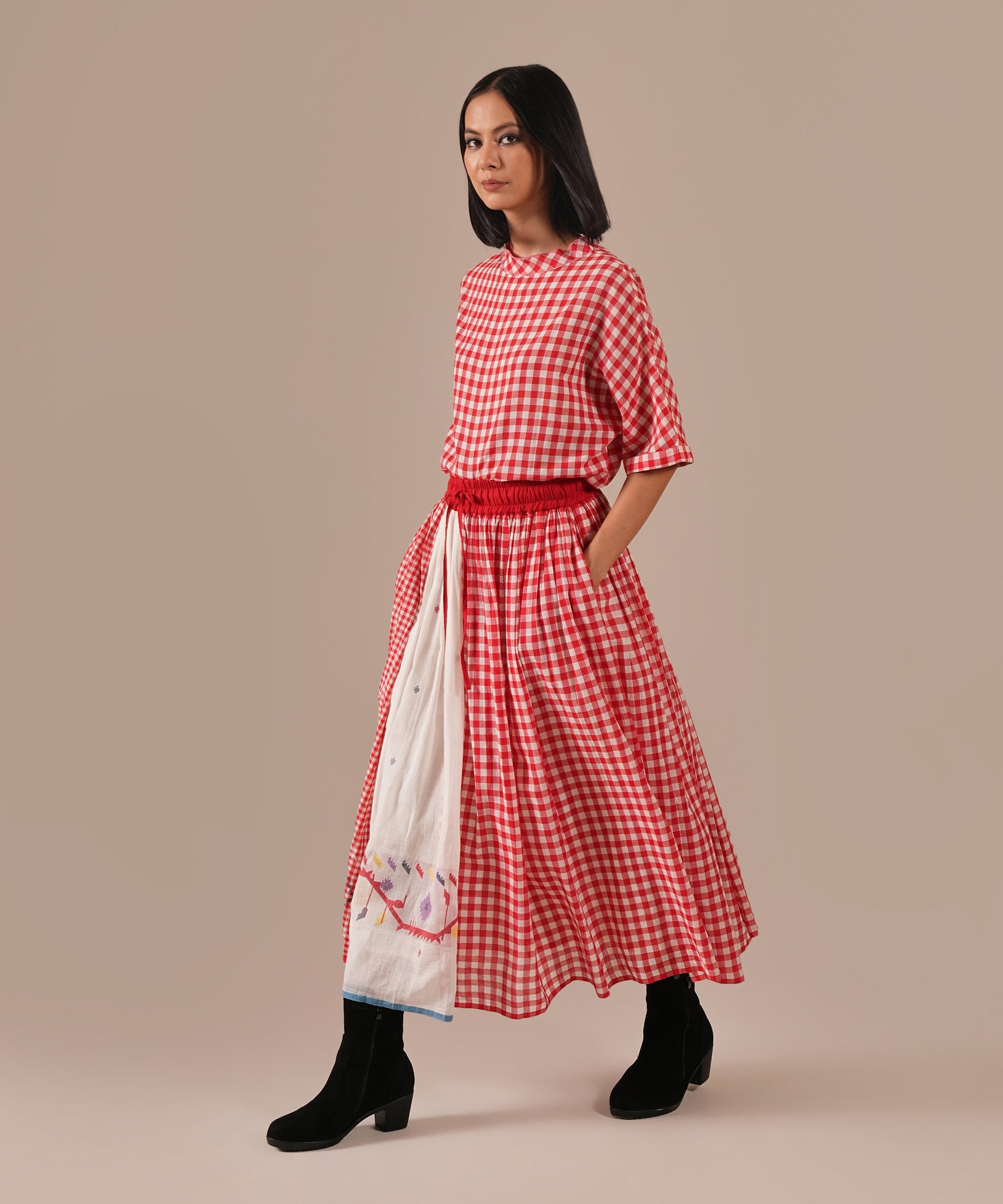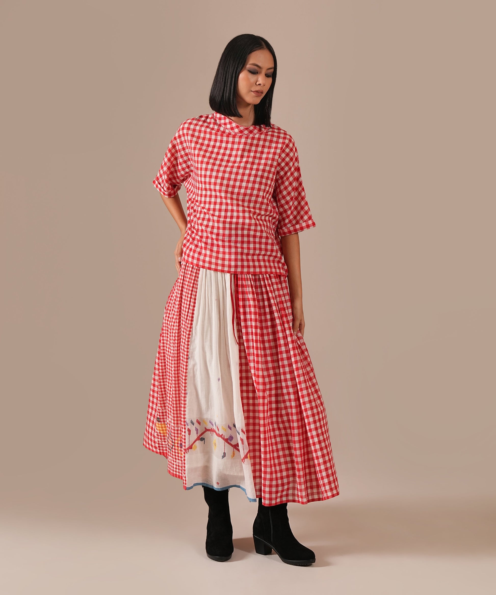 A classic Jamdani ensemble with a boxy top and a gathered skirt, accented with contrast Jamdani panel details, an elasticated waist for effortless comfort, and convenient side pockets where timeless craftsmanship meets everyday ease.