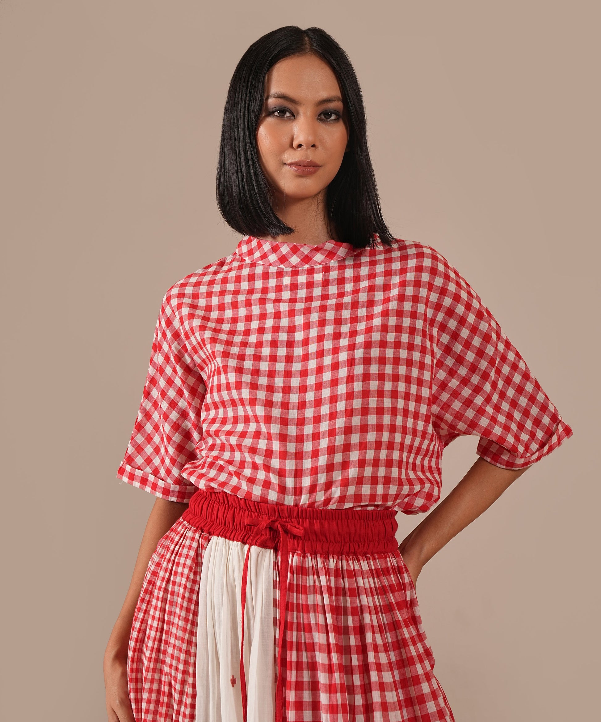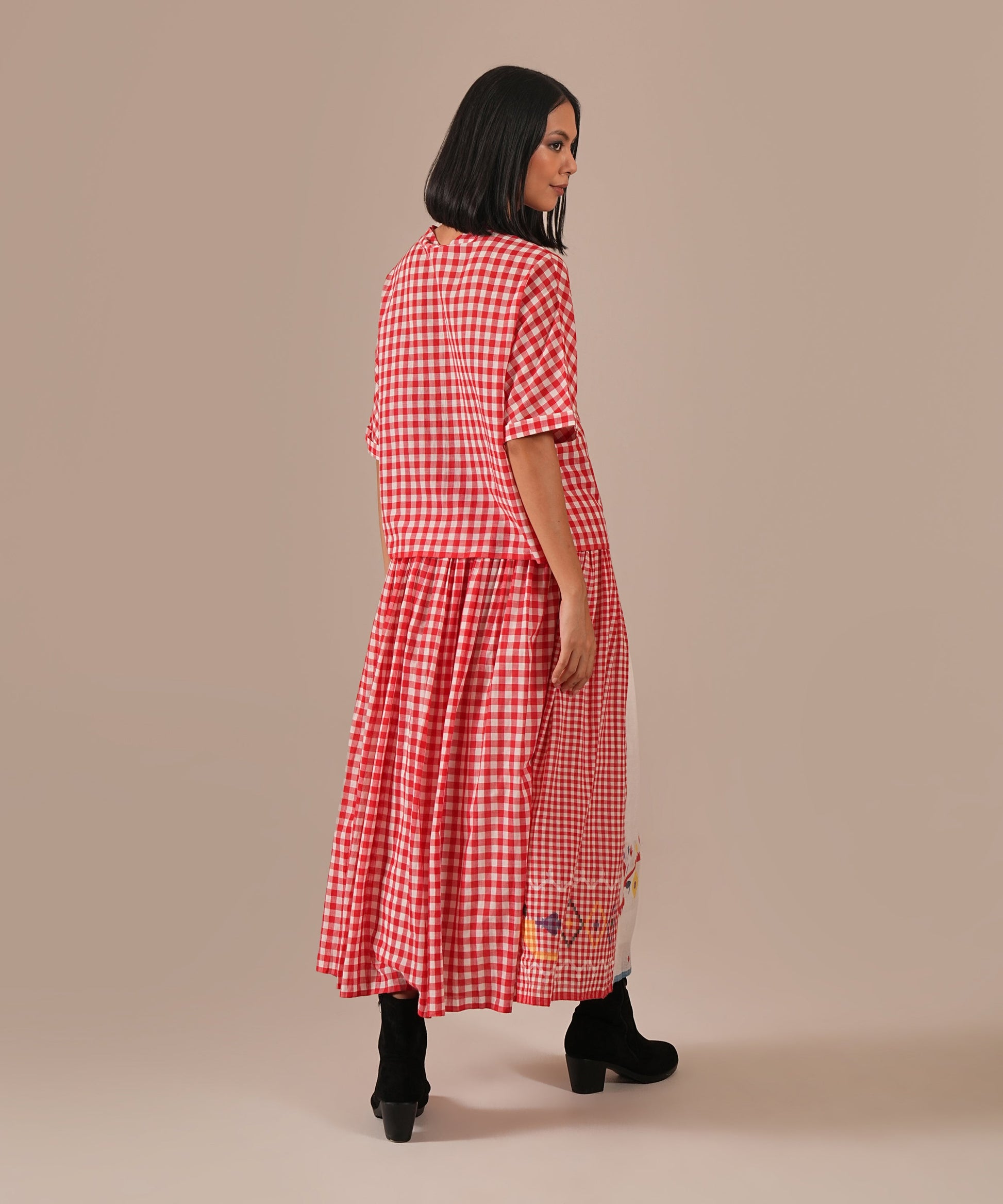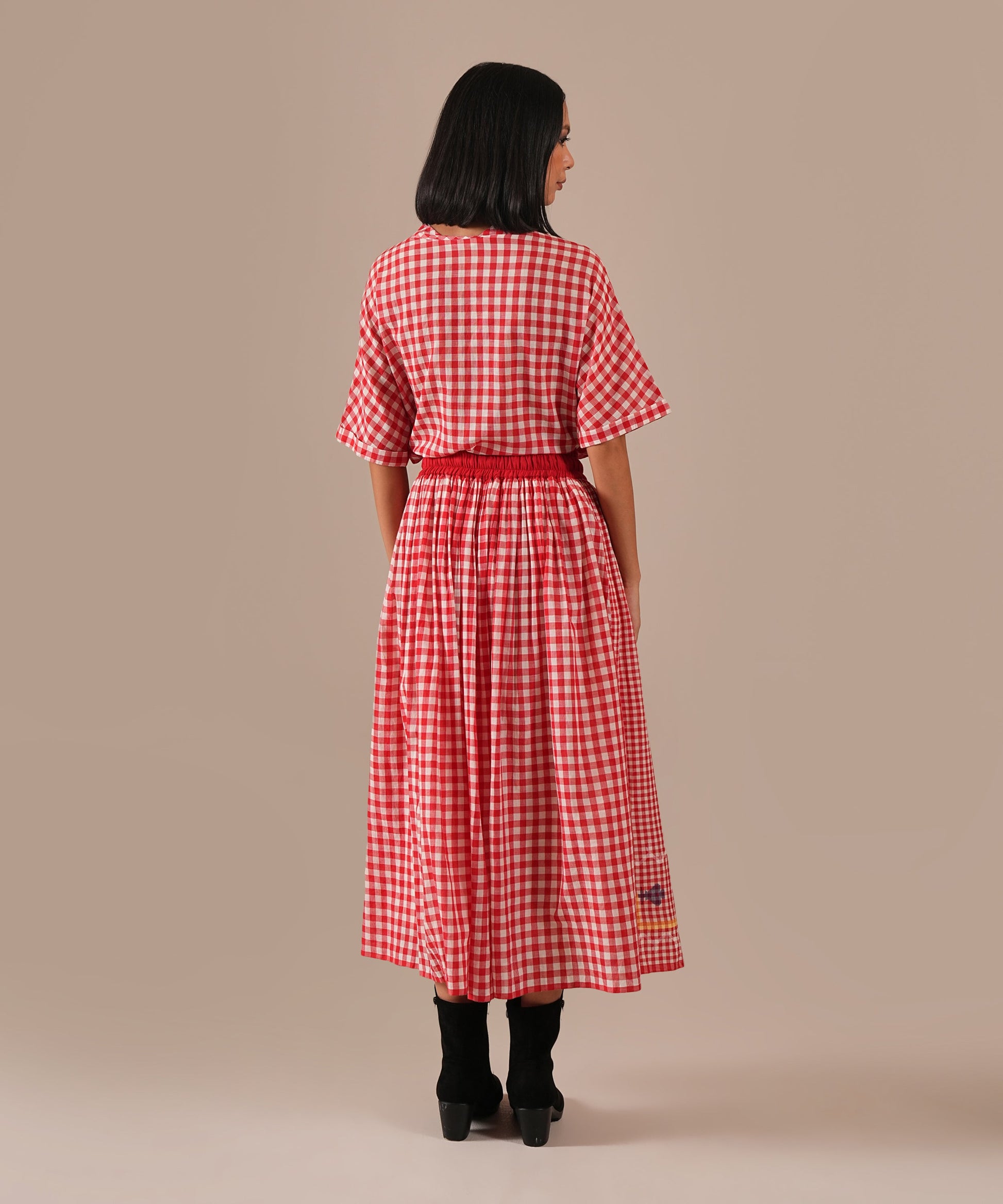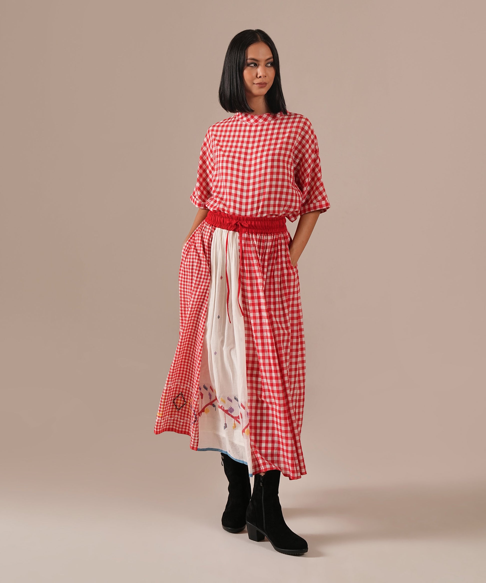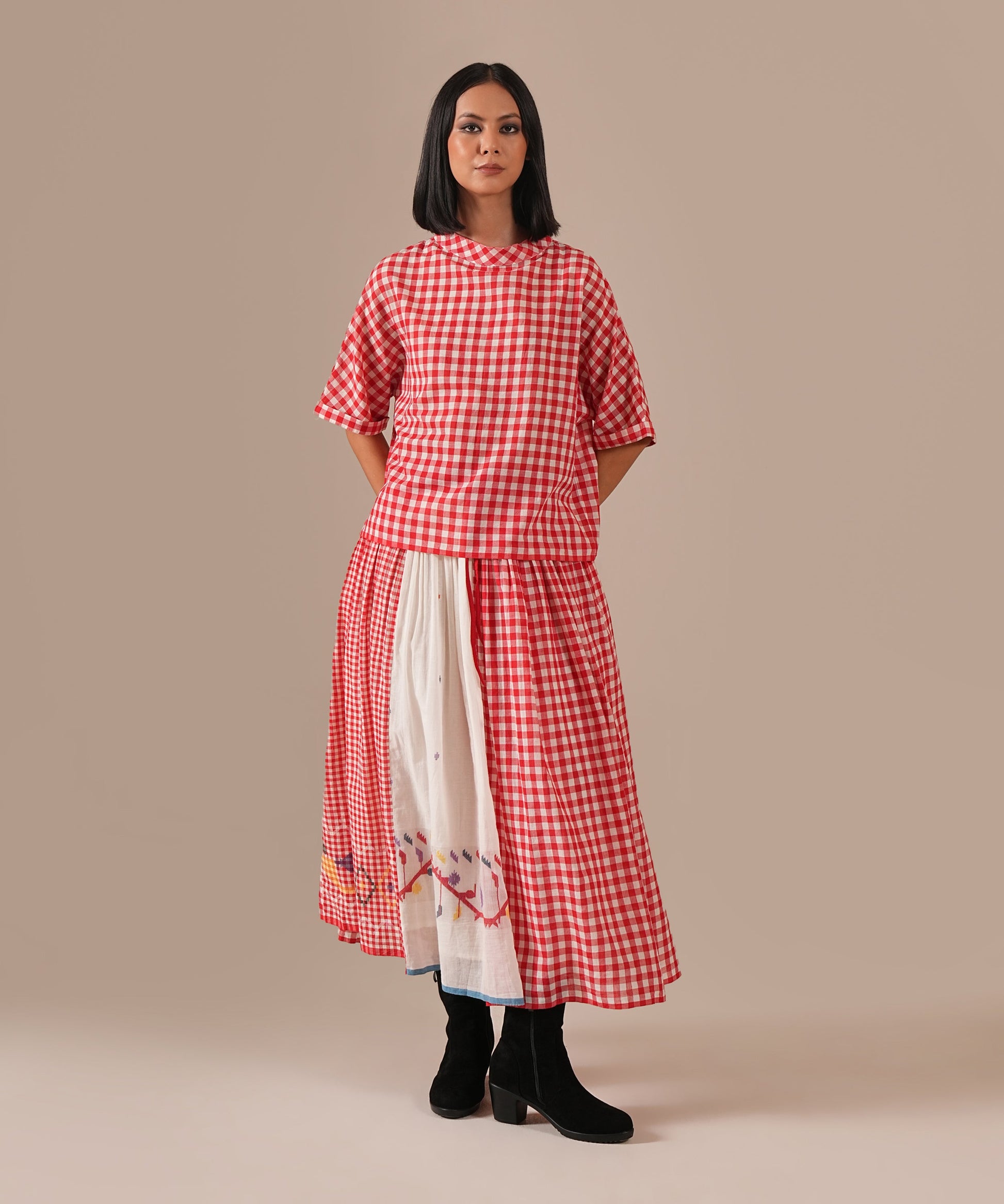 A classic Jamdani ensemble with a boxy top and a gathered skirt, accented with contrast Jamdani panel details, an elasticated waist for effortless comfort, and convenient side pockets where timeless craftsmanship meets everyday ease.
