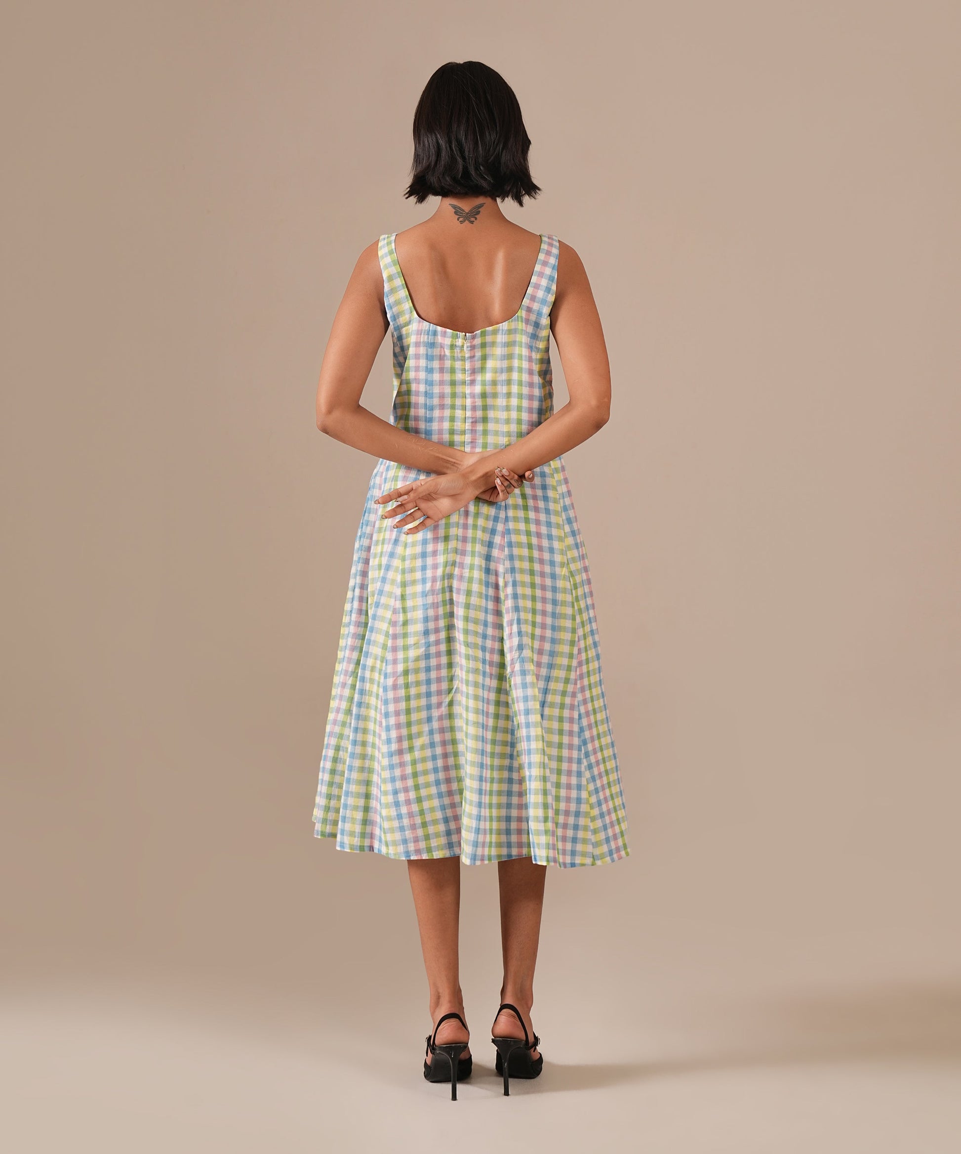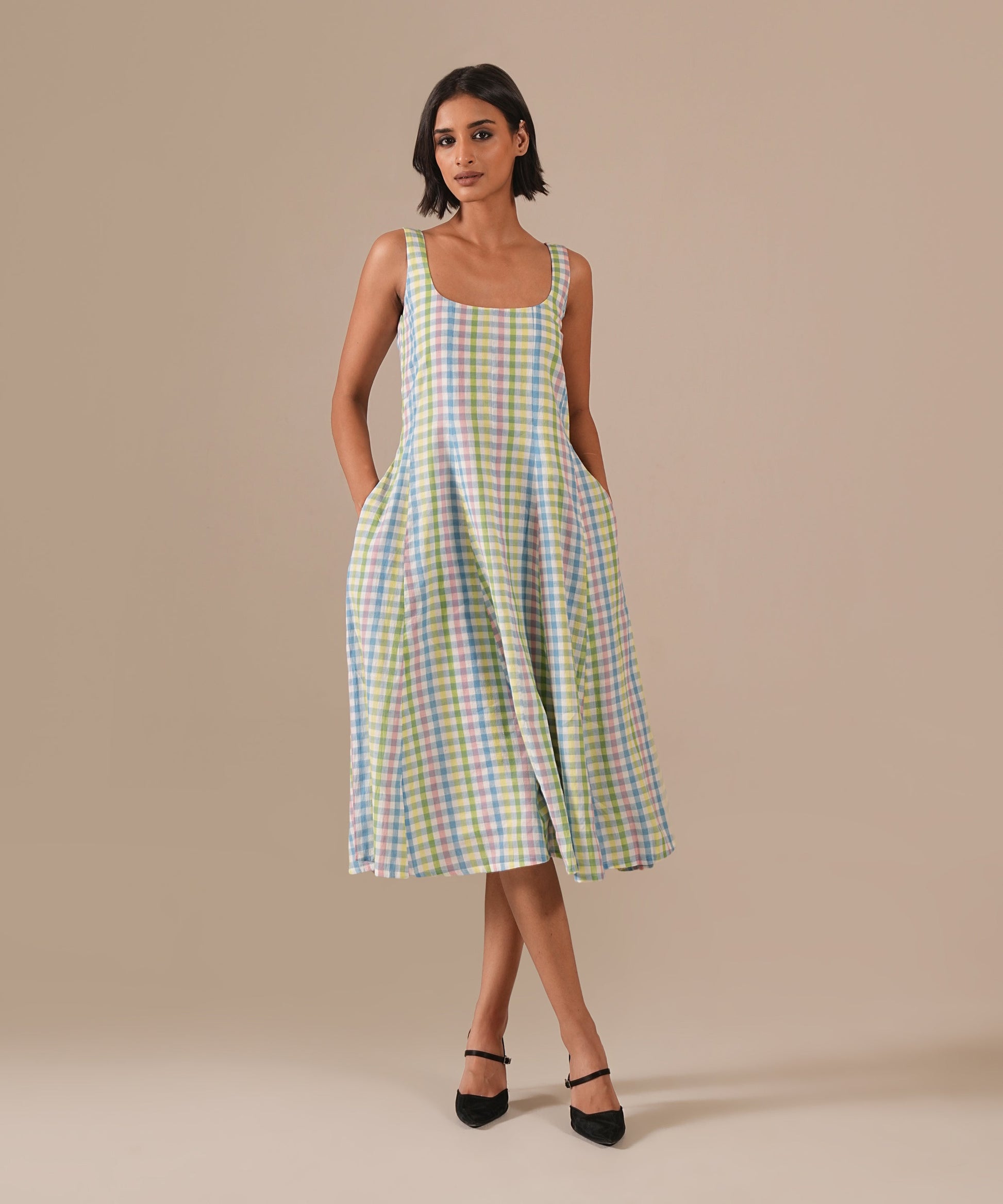 A classic fit-and-flare dress featuring a deep square neckline, back zipper fastening, elegant kali panel detailing, and functional side pockets, a seamless blend of timeless style and modern sophistication.