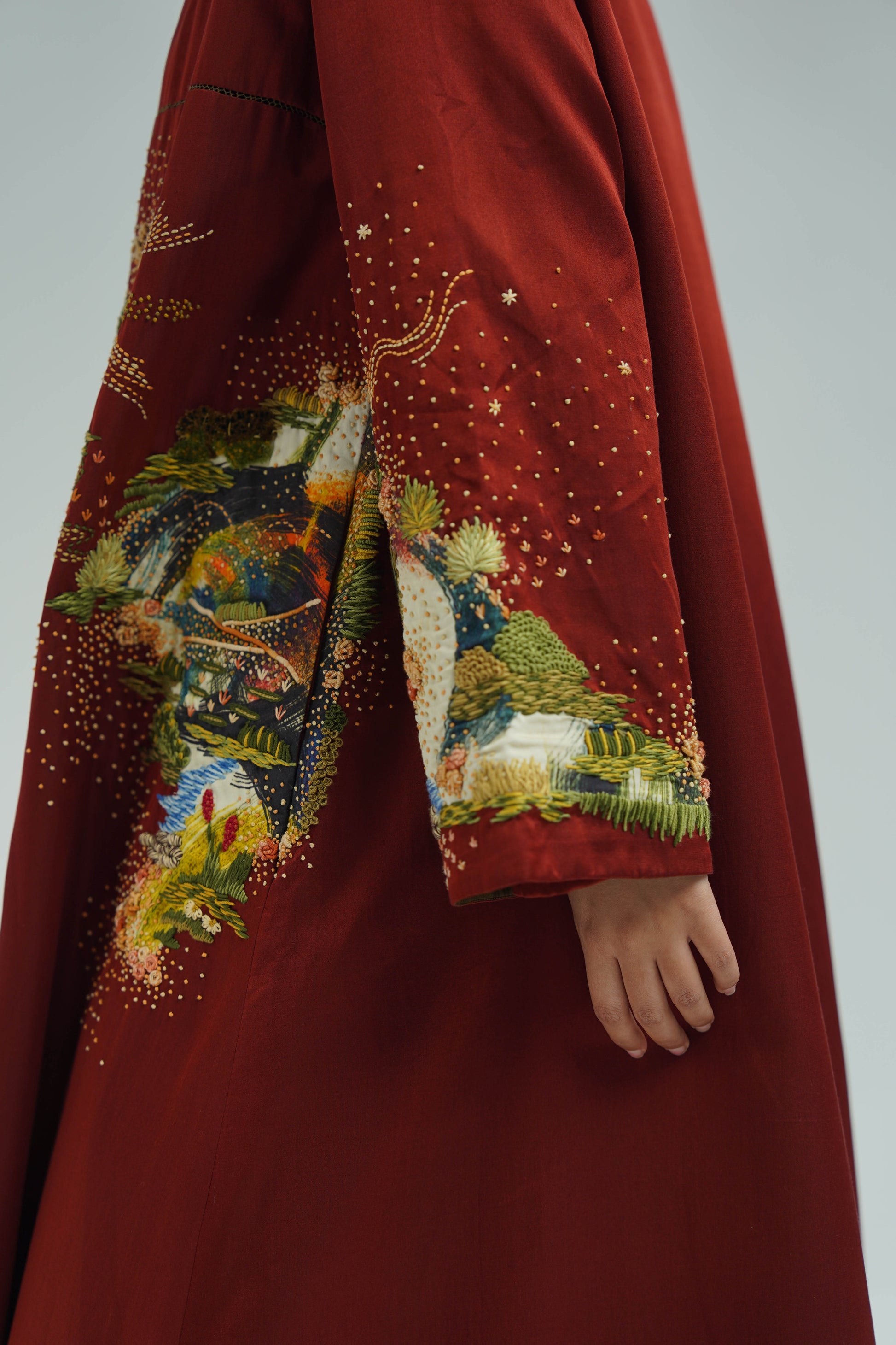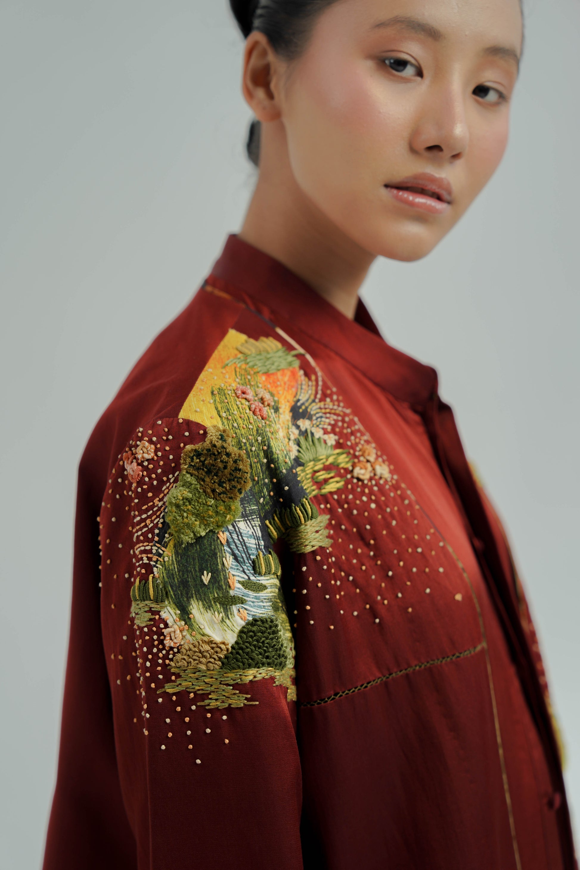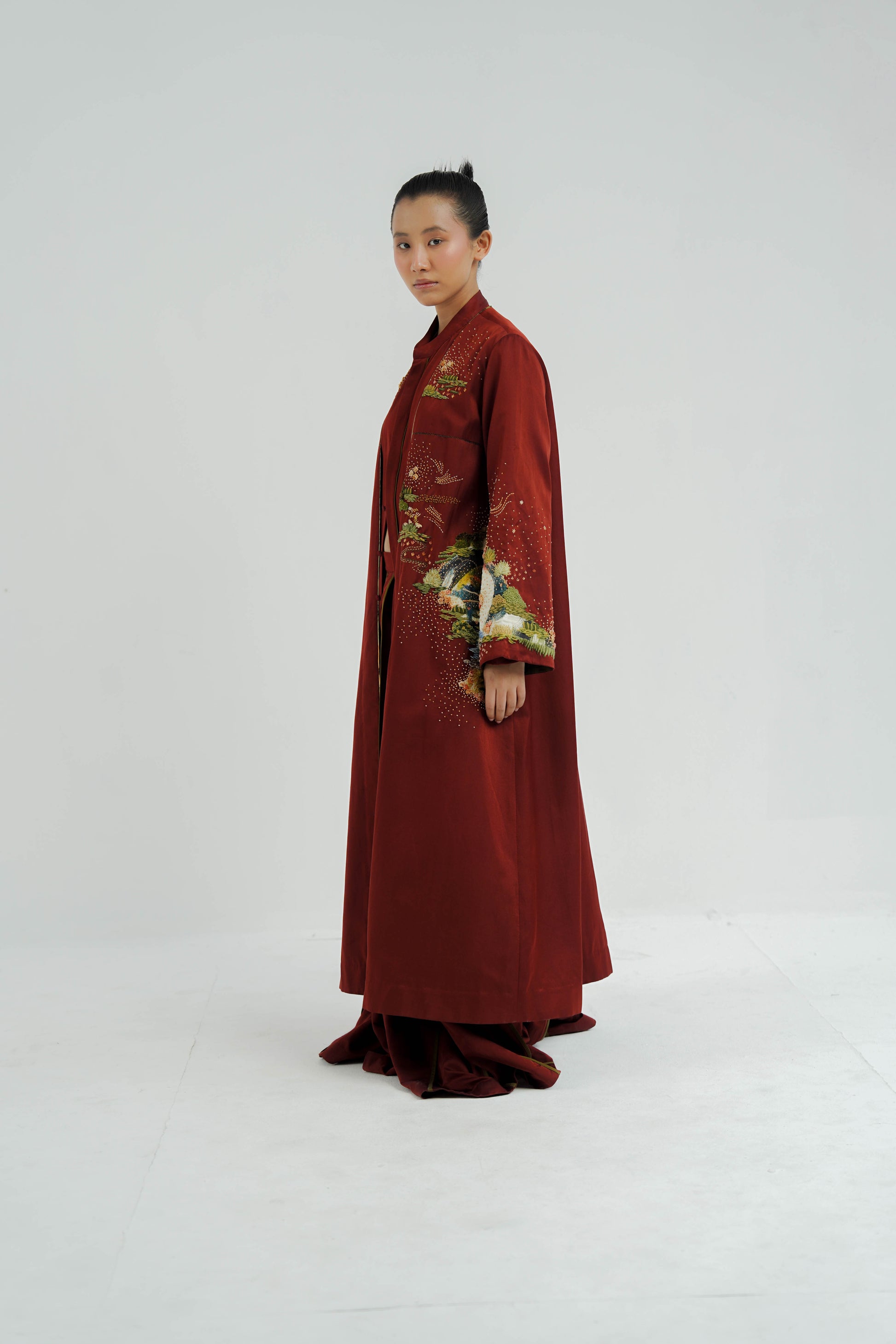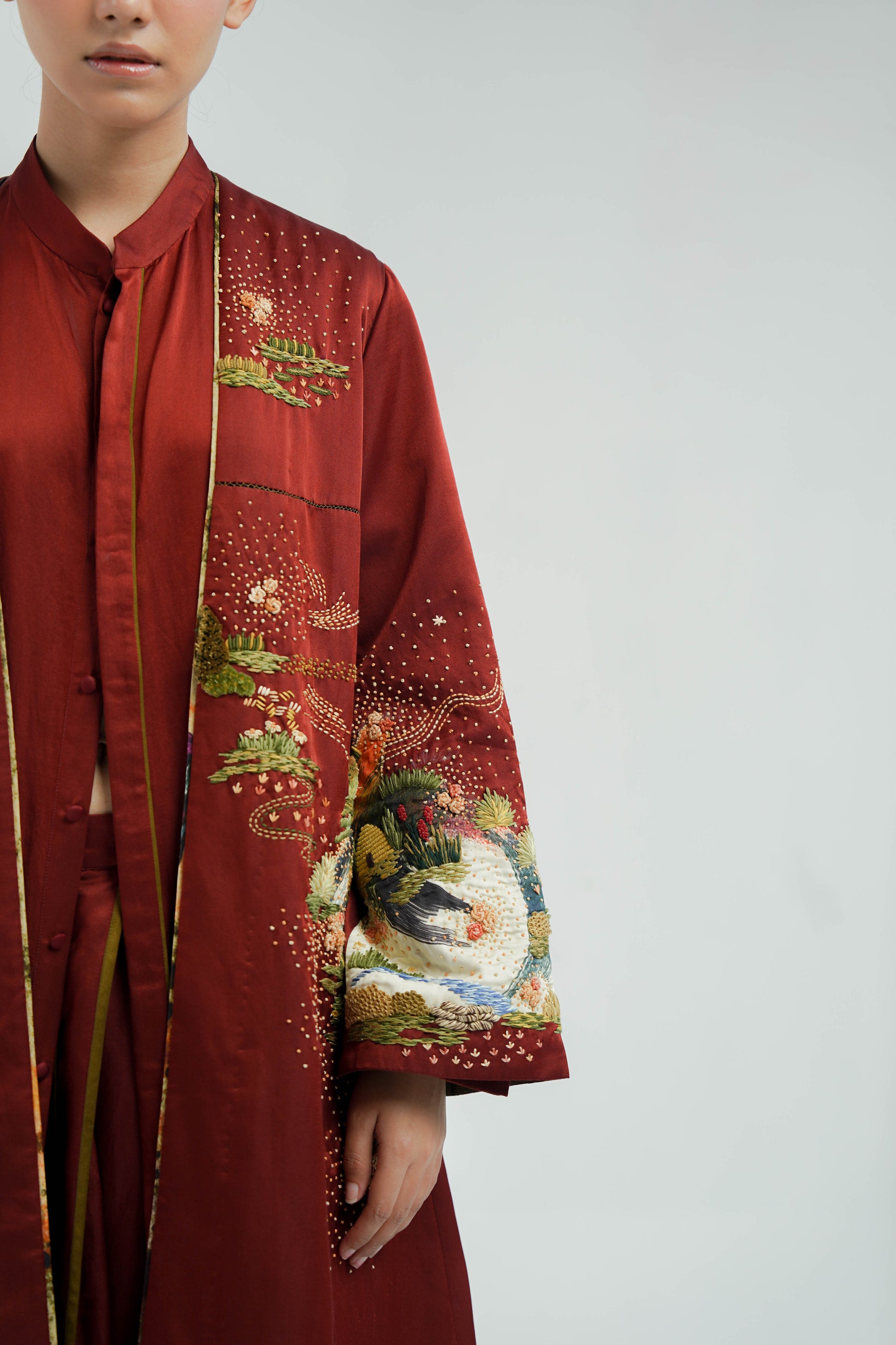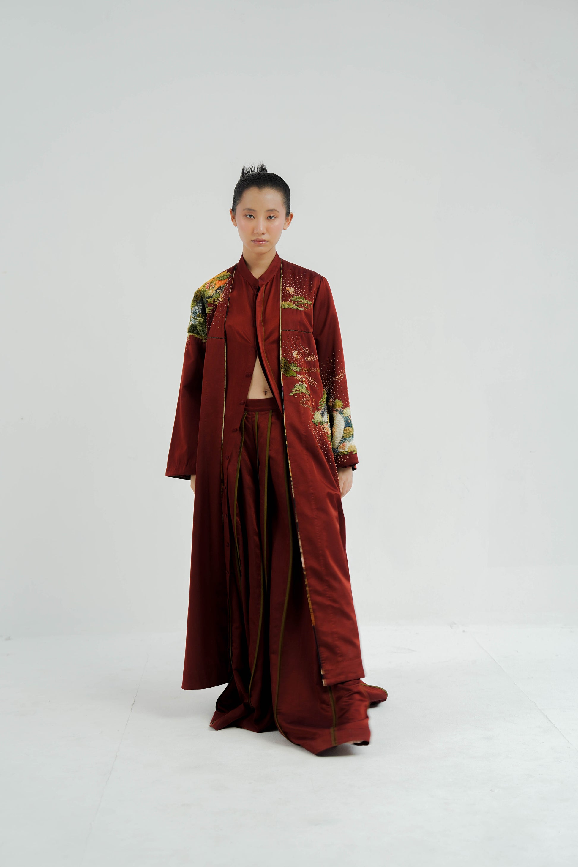 This Sakura co-ord set is crafted from silk. It features a plum handpainted digitally printed buta. The set includes a relaxed fit, front-open with pocket detailing and contrast plum piping finished with metal sequin edge finish.