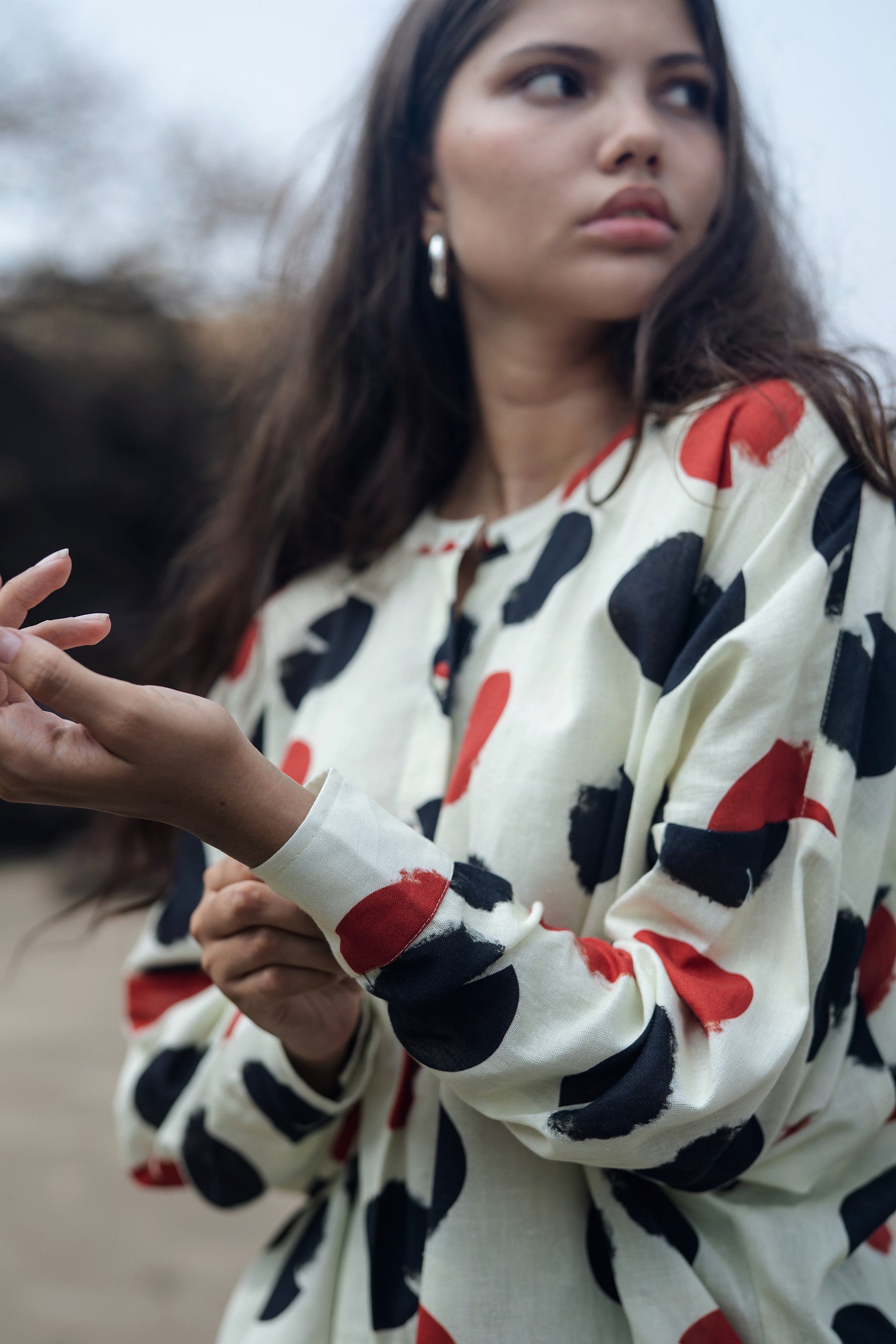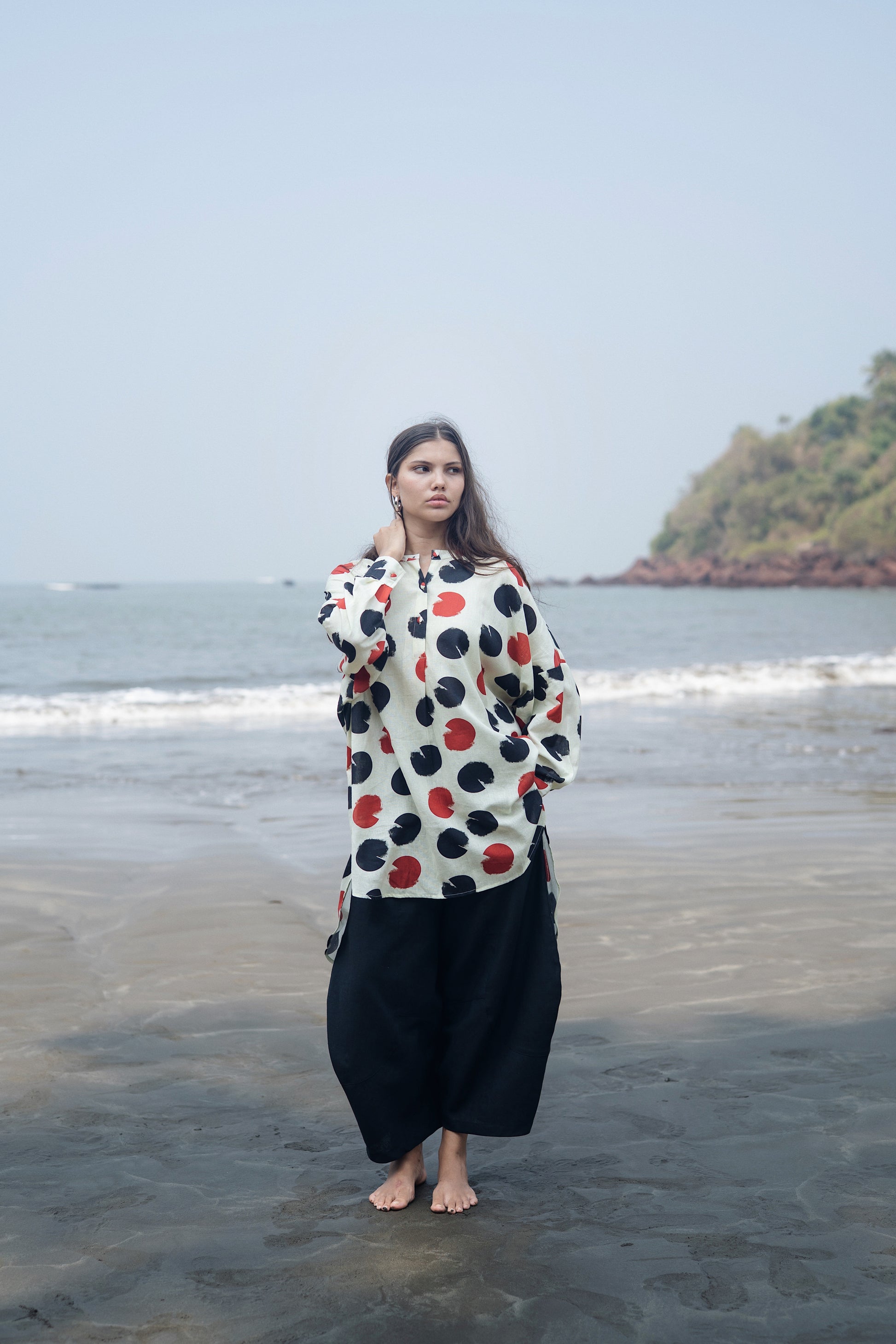 Salvia polka is one of our signature silhouettes which comprises of a anti fit kurta and relxed fit balloon trousers.