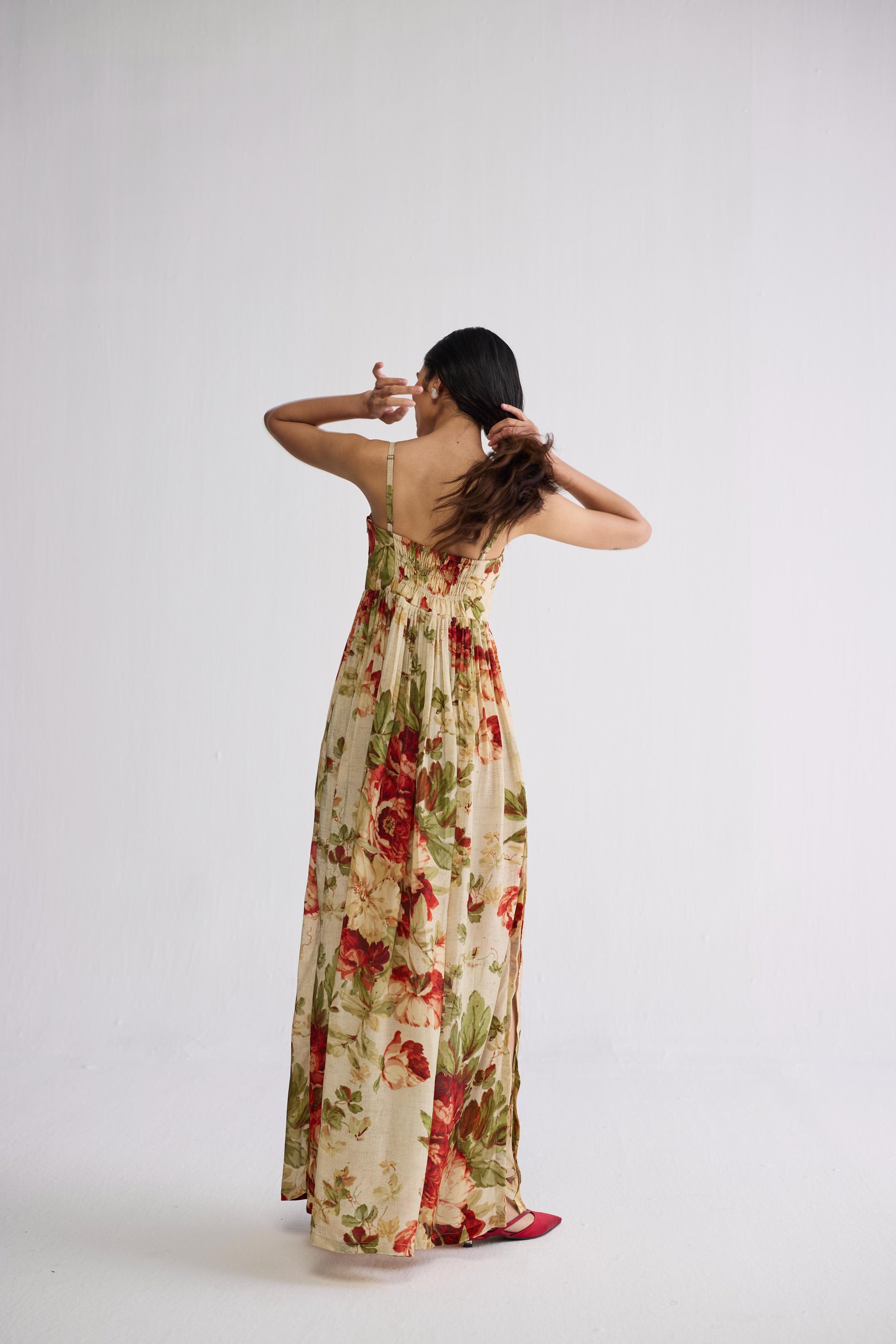 A romantic interplay of vintage florals unfolds across a warm, parchment-toned base, evoking the charm of timeless botanical illustrations. The print showcases blooming roses and lush foliage in deep crimson, soft sage, and muted ivory hues, delicately layered to create depth and softness. The slightly faded, antique-inspired finish lends the piece an heirloom elegance—perfect for graceful, statement dressing.