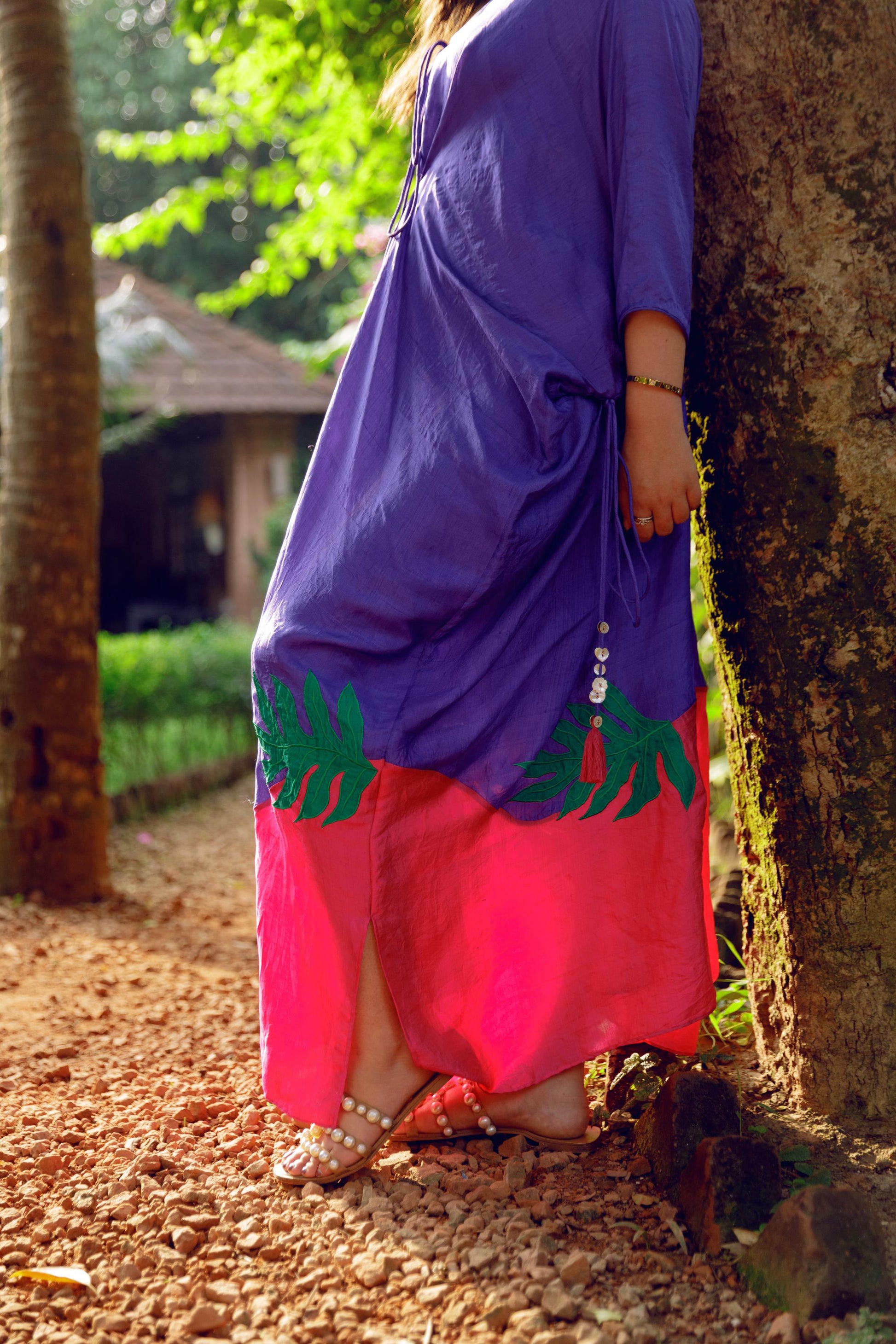 Purple handwoven mulberry silk free size kaftaan with a contrast pink shaped hem and large green aplique leaves. The neck and sleeve hem have a tie up cord detailed with shell embroidery.