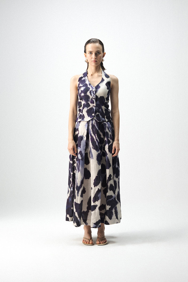 This Skirt set crafted in breathable linen embodies contemporary sophistication with a relaxed charm. The set features a halterneck waistcoat paired with a box-pleated midi skirt, both designed in a striking abstract print in shades of navy and ivory. The natural texture of linen adds a soft structure, making it perfect for both daywear and elegant evening occasions.