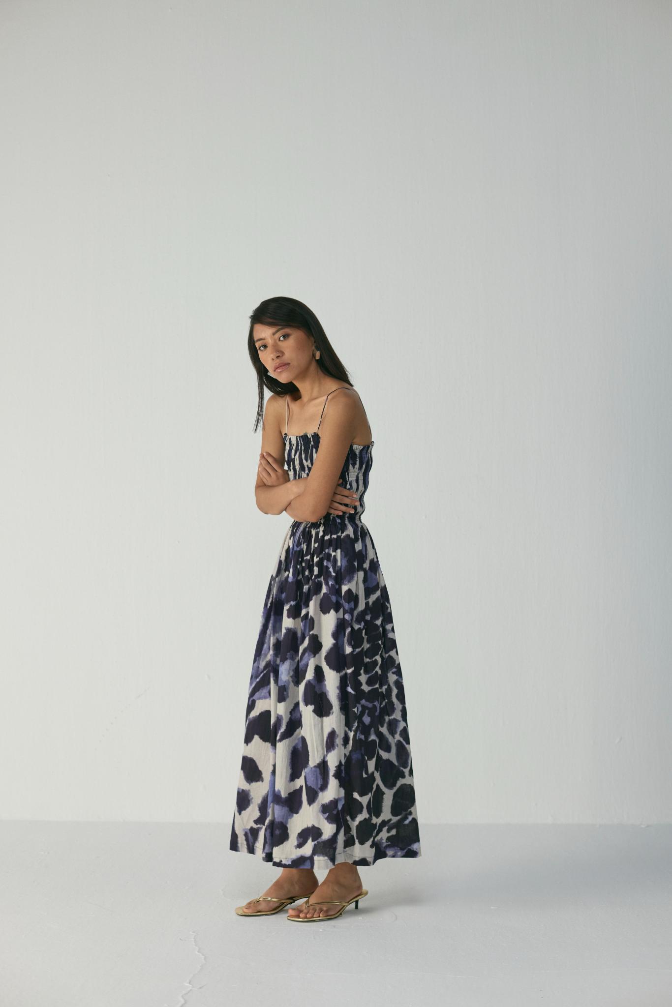 Effortlessly feminine and easy to wear, this strappy maxi dress is crafted in breathable poplin that drapes beautifully with a natural sheen. The bodice features elasticated ruching for a comfortable, flattering fit that accentuates the silhouette while allowing ease of movement. The upper body is fully lined to ensure a smooth and structured finish, while the skirt flows gracefully to ankle length, making it ideal for both day and evening occasions. The striking abstract indigo and ivory print adds a touch of modern artistry to this timeless silhouette.