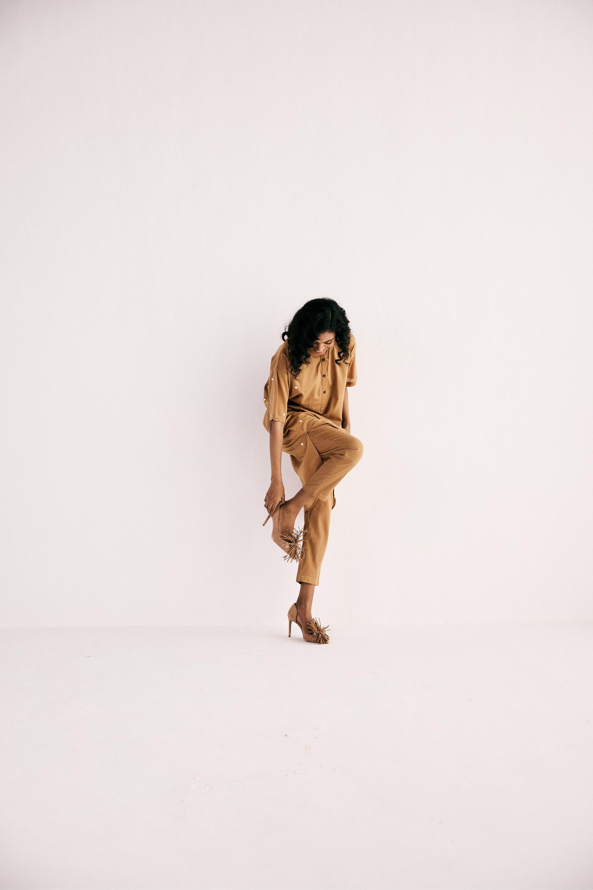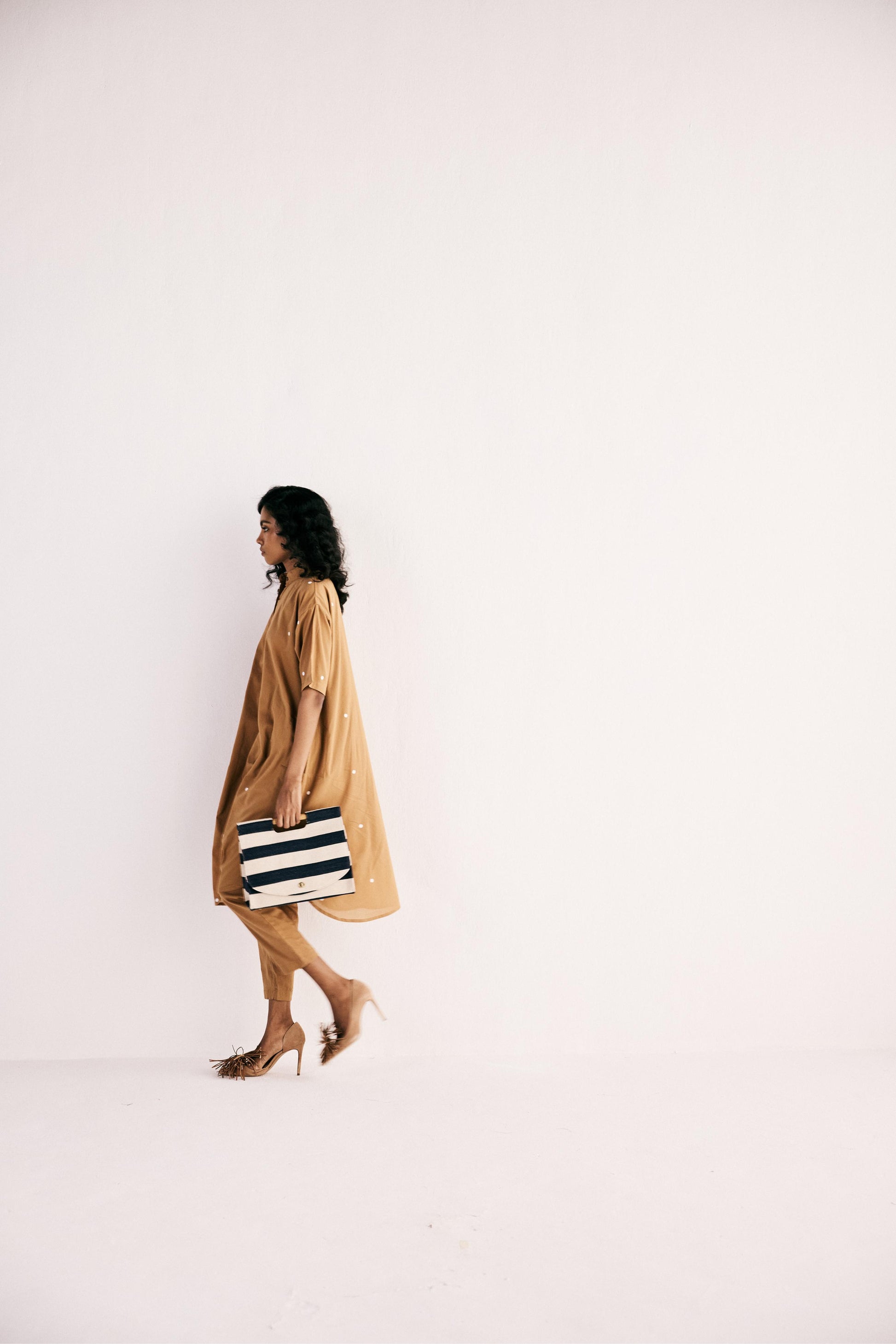 A Sand polka dot printed kurta with front button opening crafted in soft cotton mul paired with cotton mul pencil pants with elasticated back and front zipper opening with a button fastening. Kurta Set, Pants