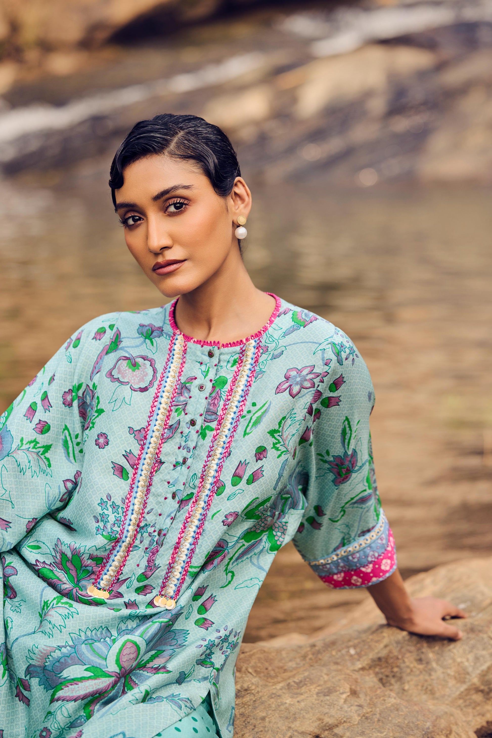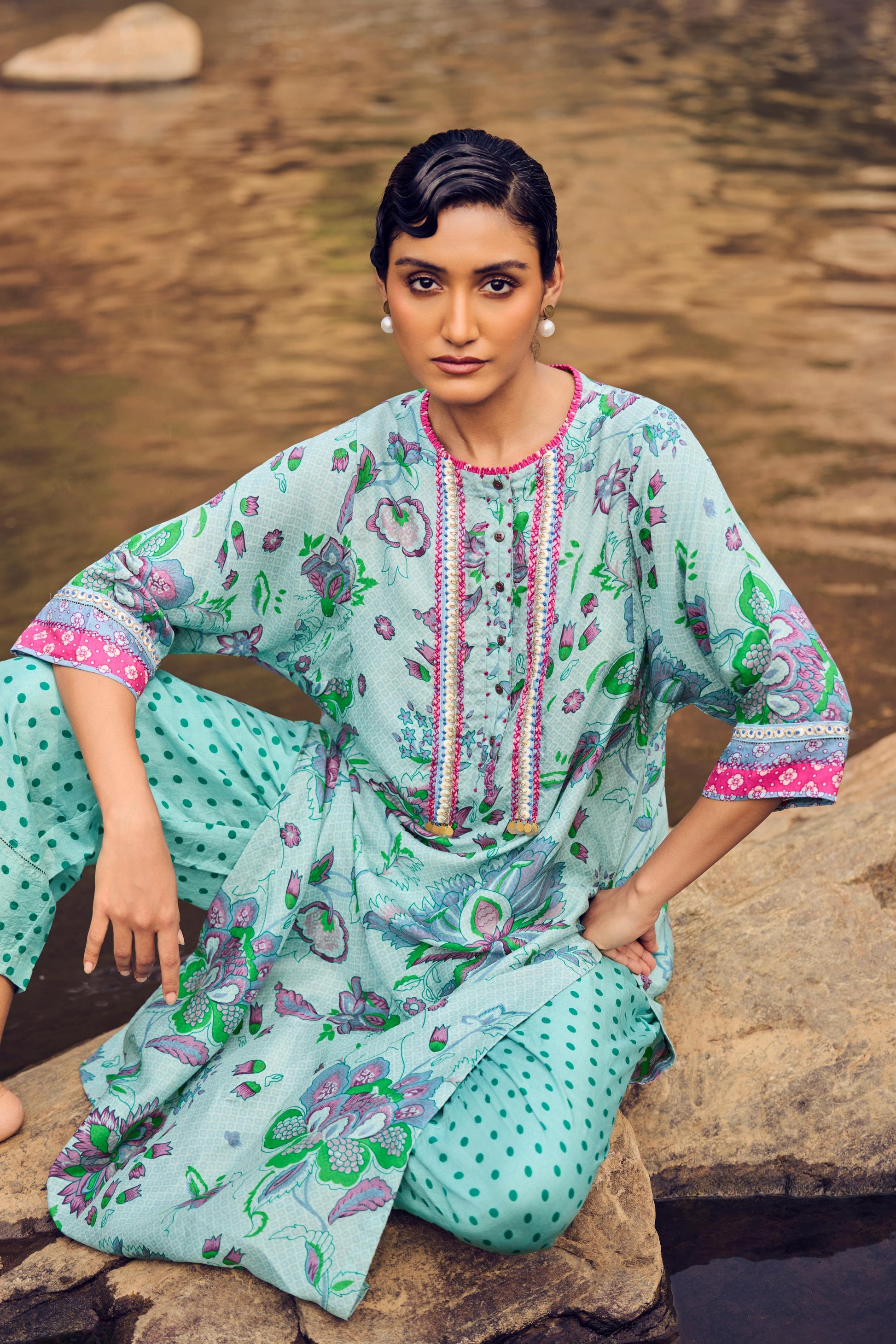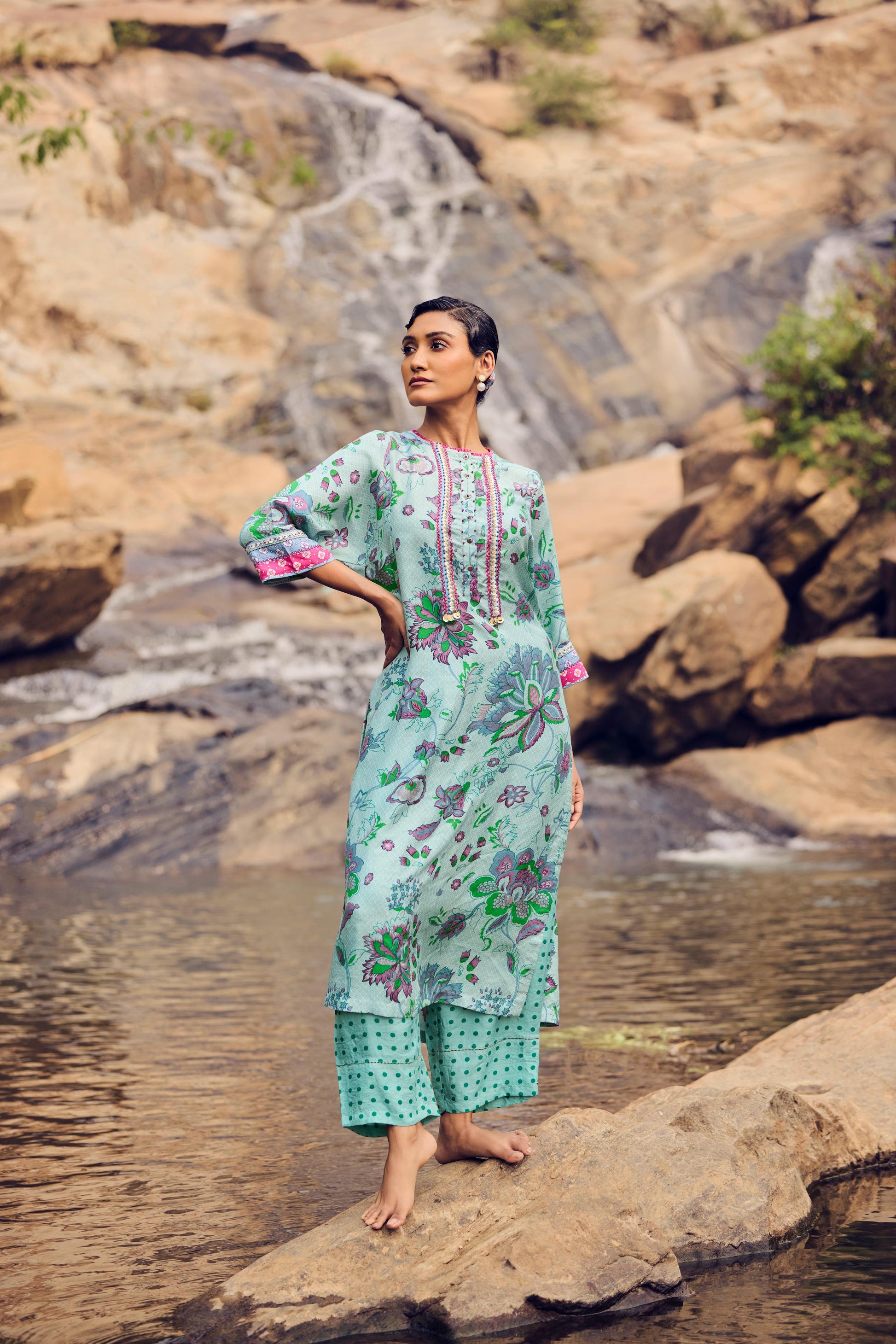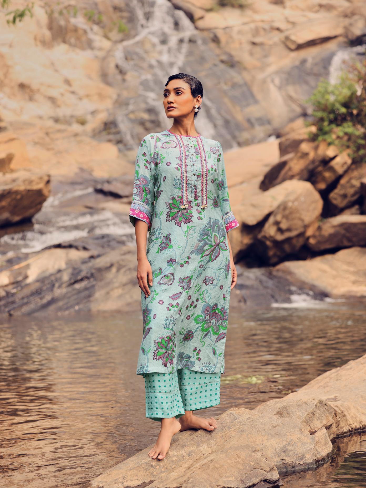 Pale blue hand woven, hand printed mulberry silk kurta, embroidery detail on front, back and sleeves paired with pants.