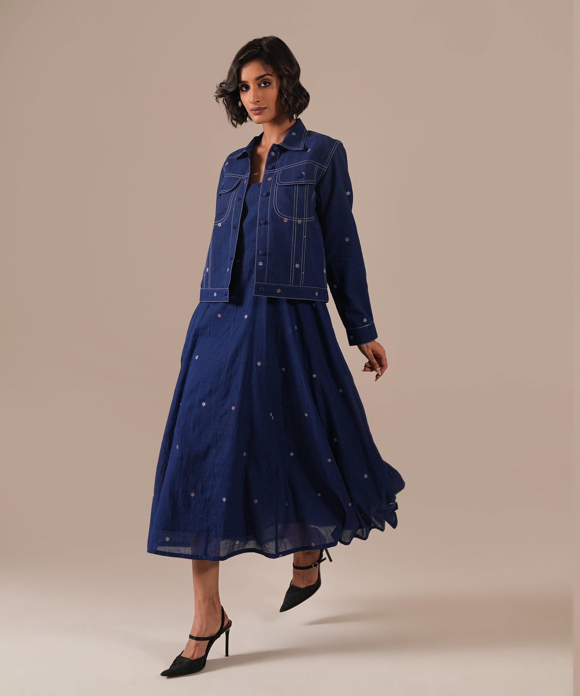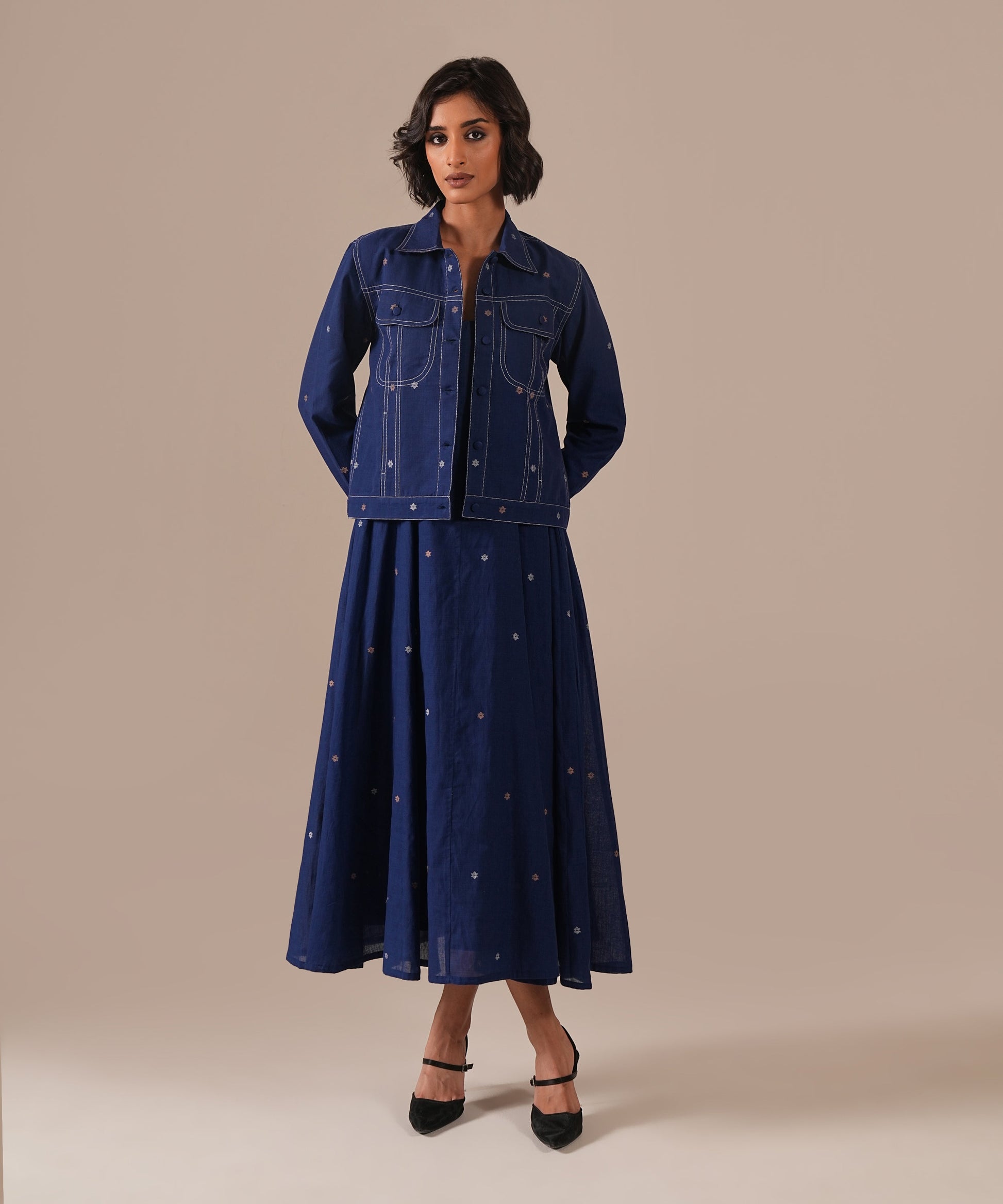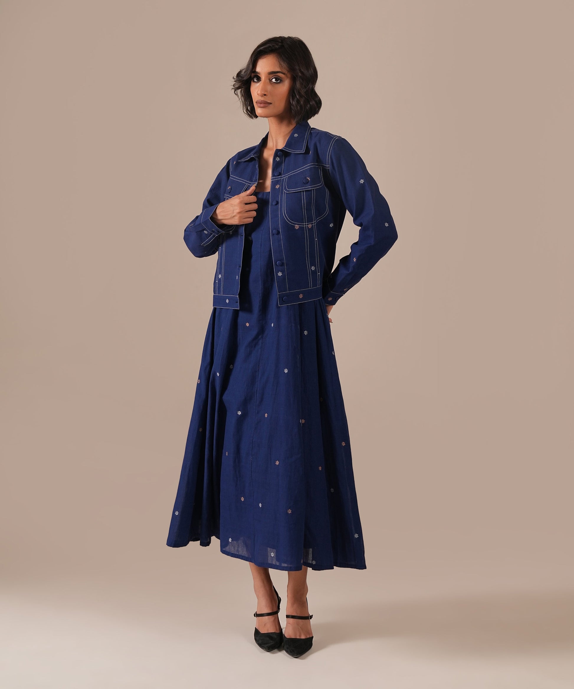 A Jamdani fit-and-flare ensemble featuring a deep square-neck dress with back zipper fastening, kali panel detailing, and functional side pockets. It is paired with a denim-inspired Jamdani co-ord jacket, reimagining the timeless weave with a modern denim aesthetic. Handwoven by Indian artisans, this set beautifully blends tradition with contemporary design.