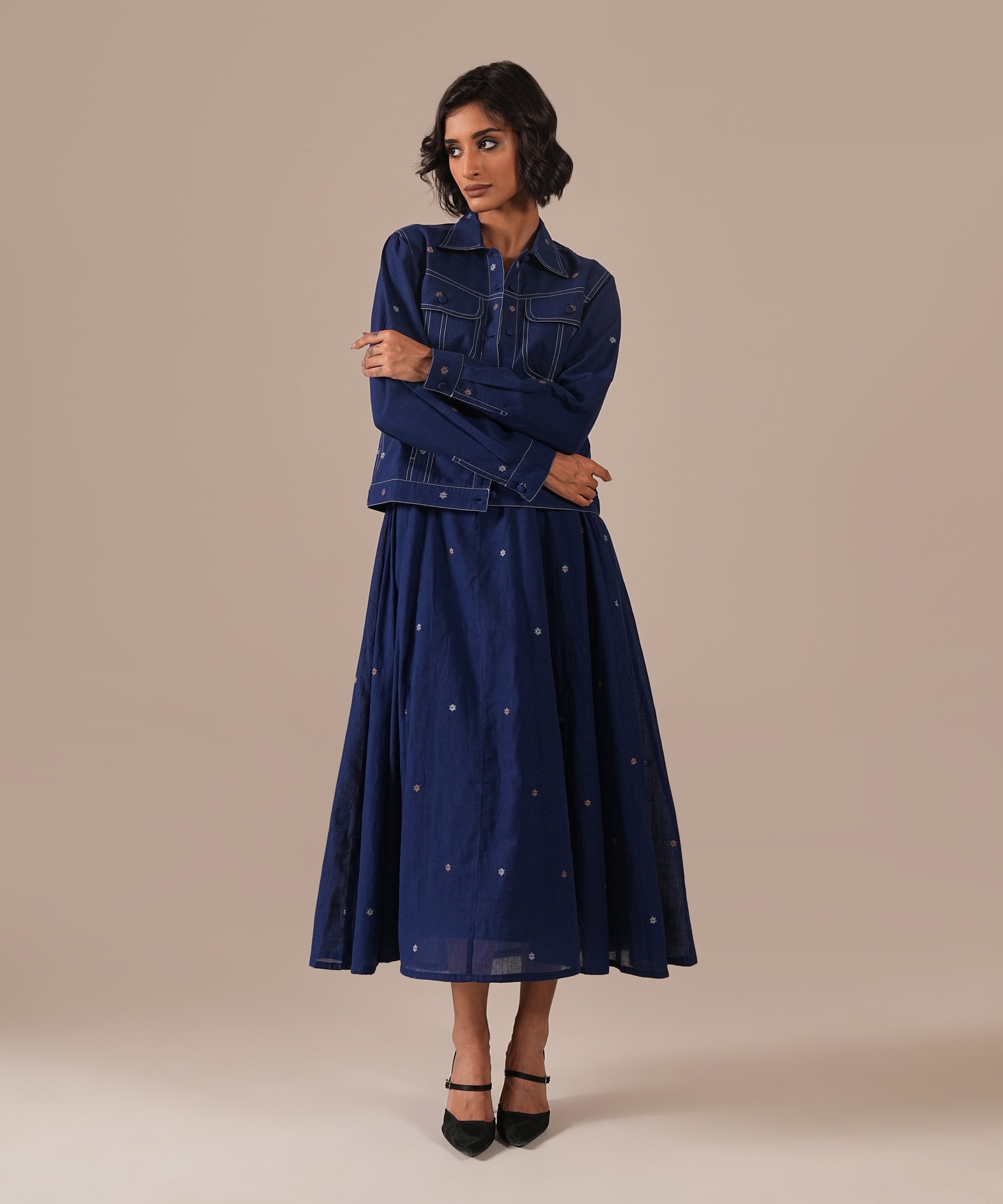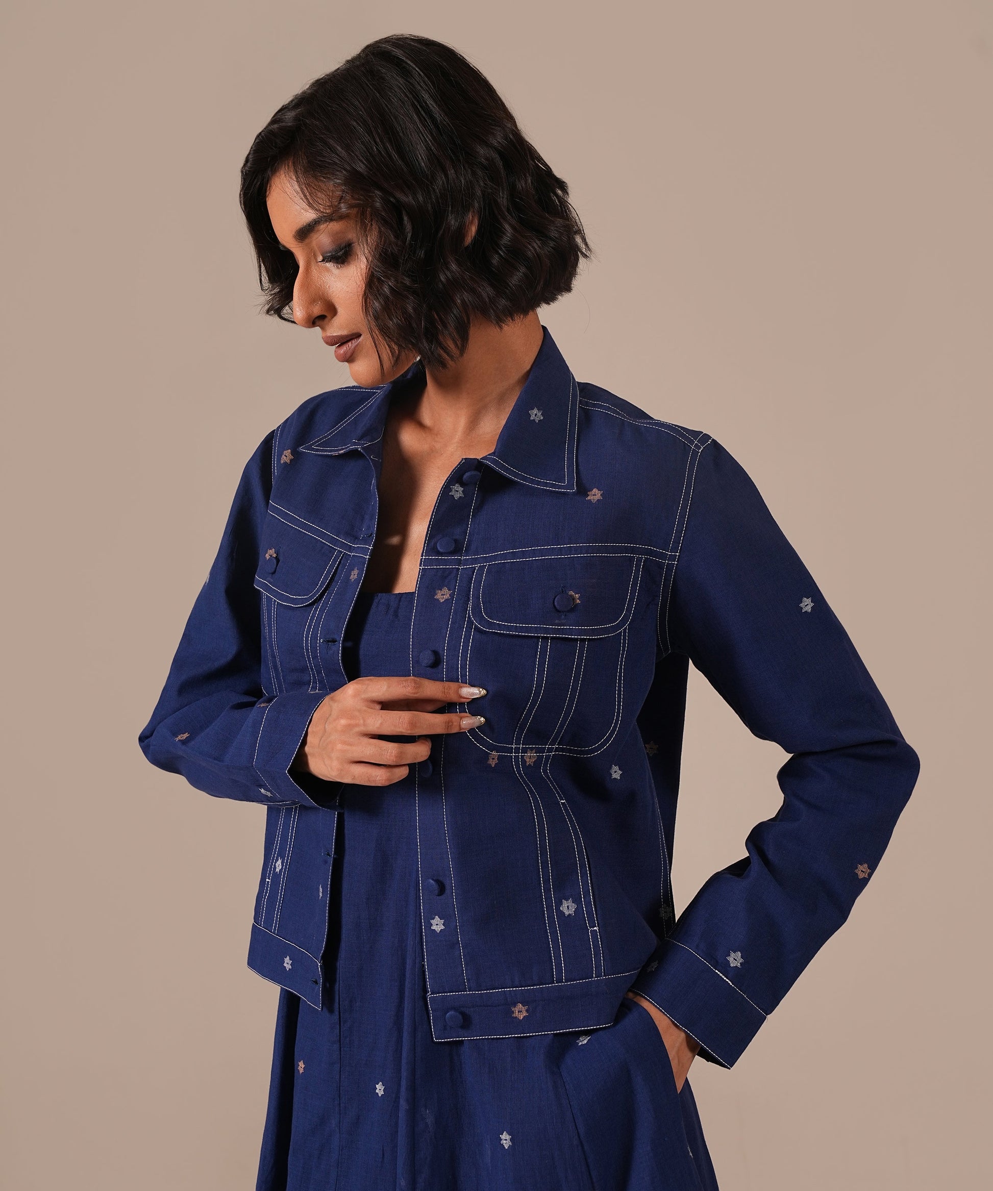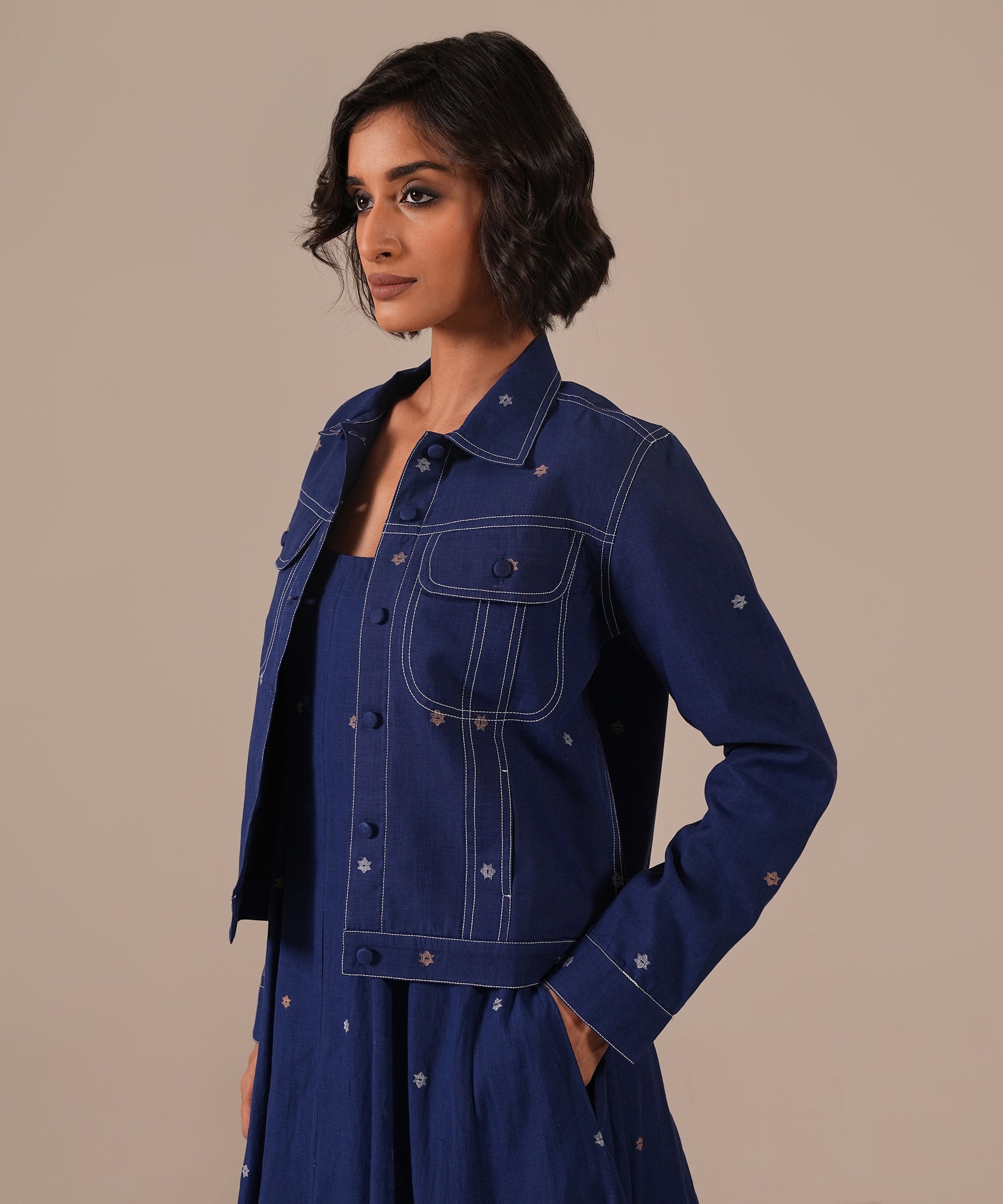 A Jamdani fit-and-flare ensemble featuring a deep square-neck dress with back zipper fastening, kali panel detailing, and functional side pockets. It is paired with a denim-inspired Jamdani co-ord jacket, reimagining the timeless weave with a modern denim aesthetic. Handwoven by Indian artisans, this set beautifully blends tradition with contemporary design.