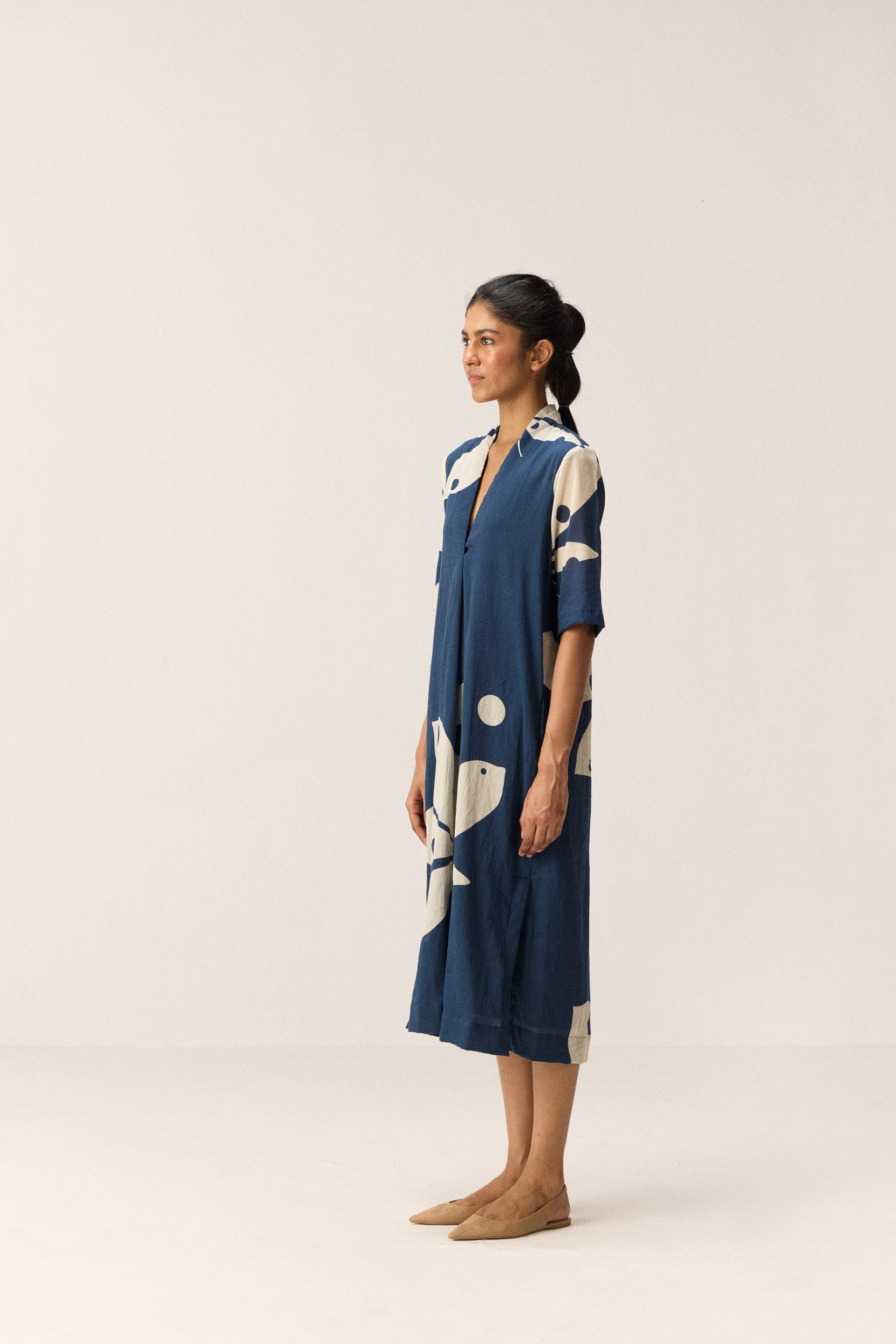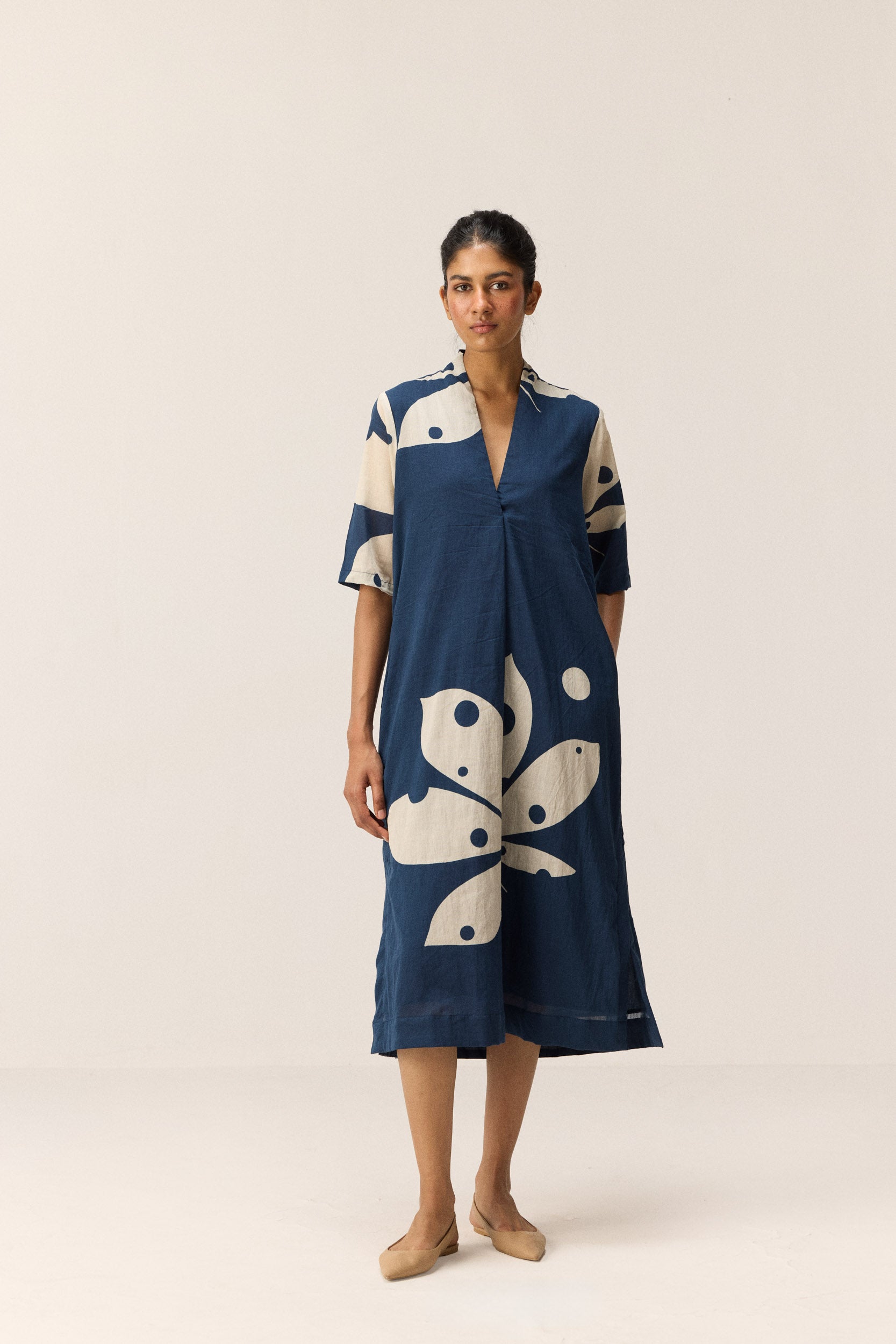 A navy blue midi dress featuring white floral prints on the front and sleeves. Designed with a flattering V neckline and elbow-length sleeves, it offers both style and ease. Side seam pockets add a touch of functionality.