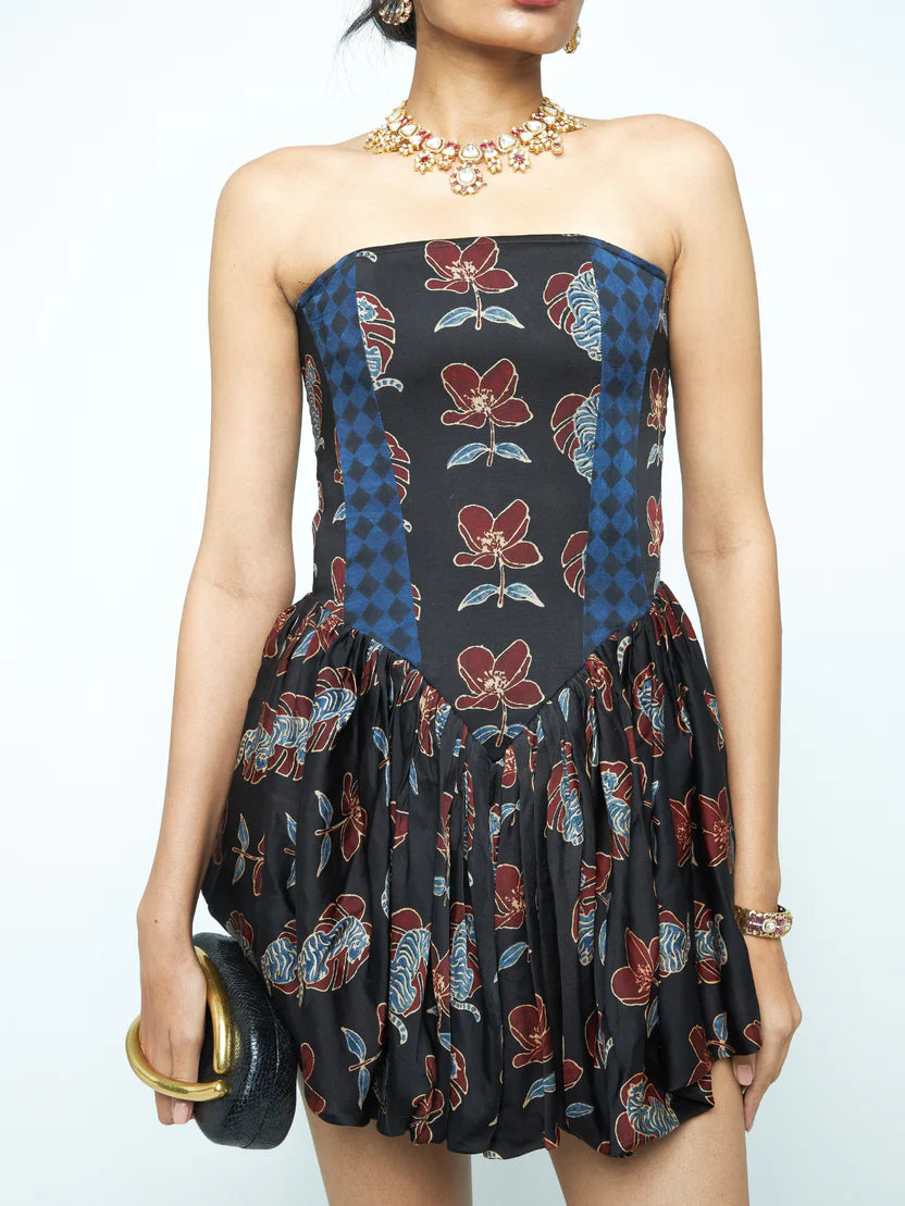 Description: A corset-style mini dress in modal featuring the Blooming Beast print. Designed with a fitted bodice and a bubble skirt, it creates a flattering shape with playful structure — a statement silhouette for evenings that call for impact.