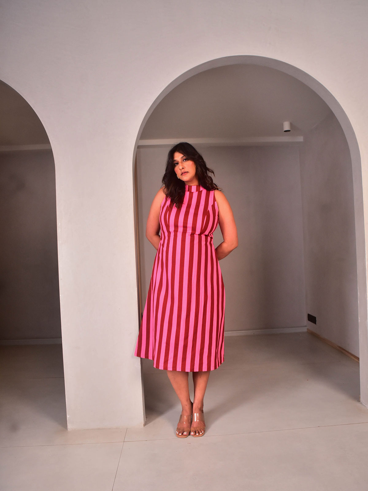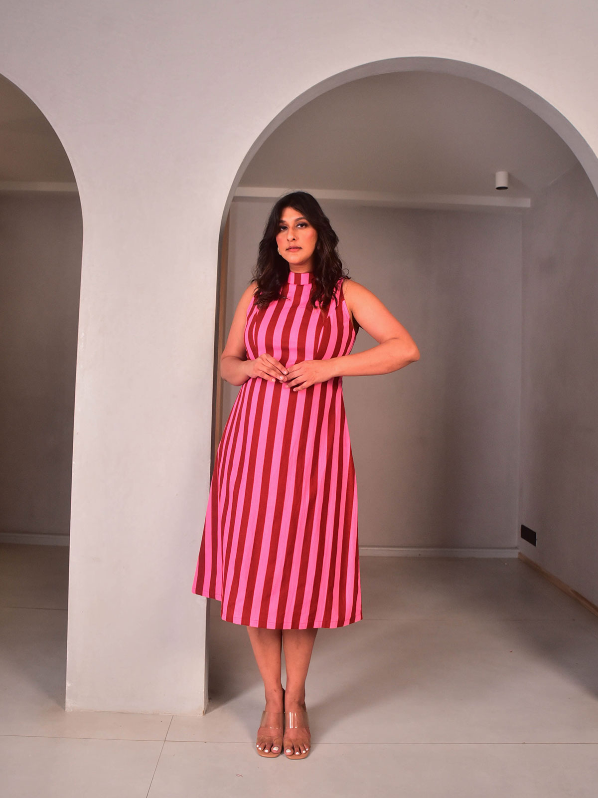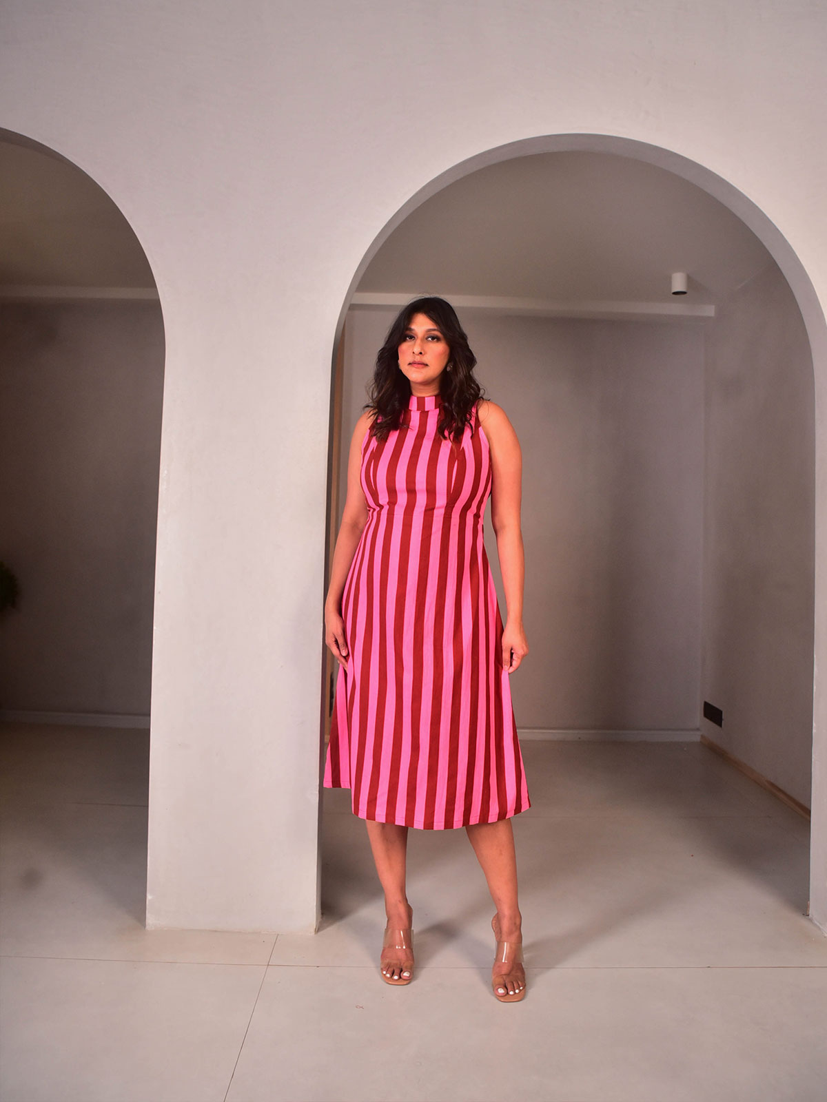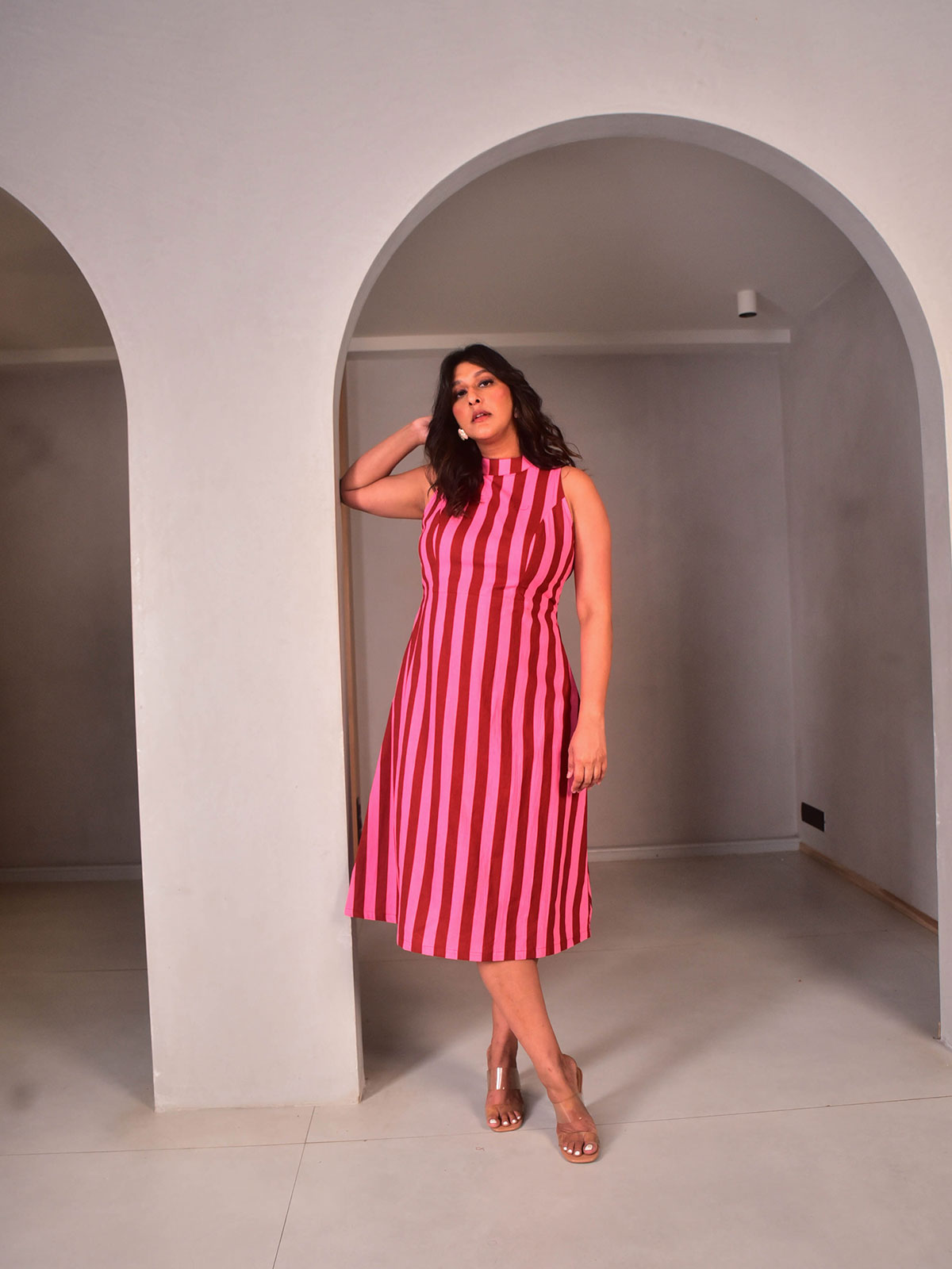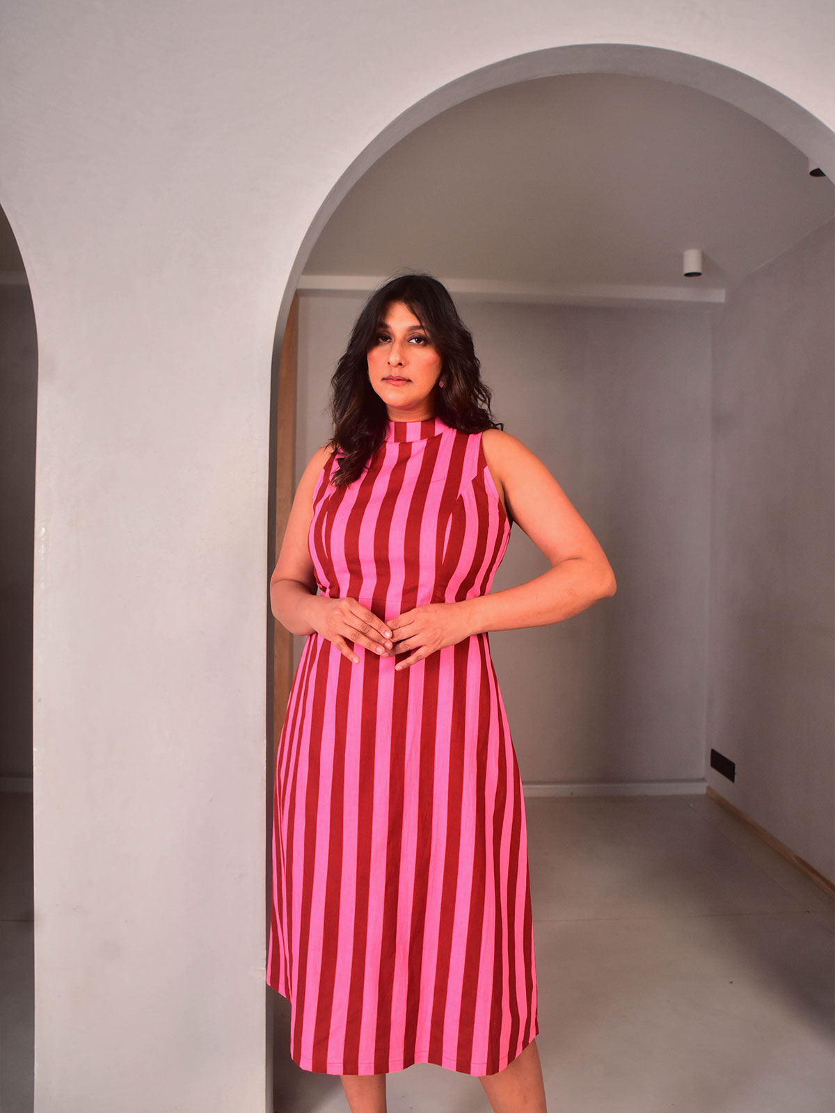 For days that call for simple, timeless style. Cut in our exclusive Pink and Maroon striped hand-screen printed cotton. This fitted dress has an in-cut pattern and short collar.