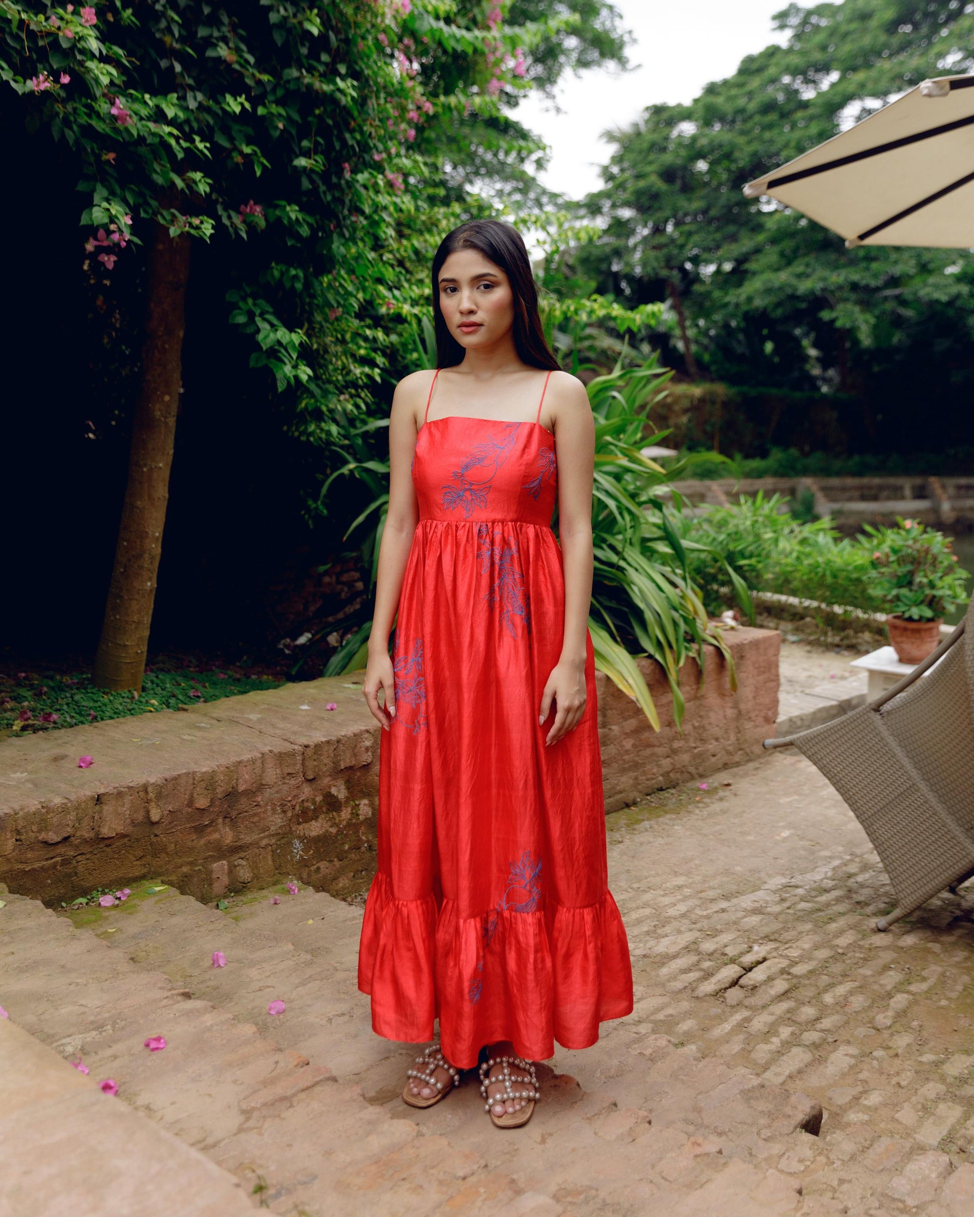 Red tiered handwoven mulberry silk strappy midi dress, detailed with small metallic beads and contrast pomegranate blue motif embroidery. The dress has a large roomy pockets to keep you hands free.