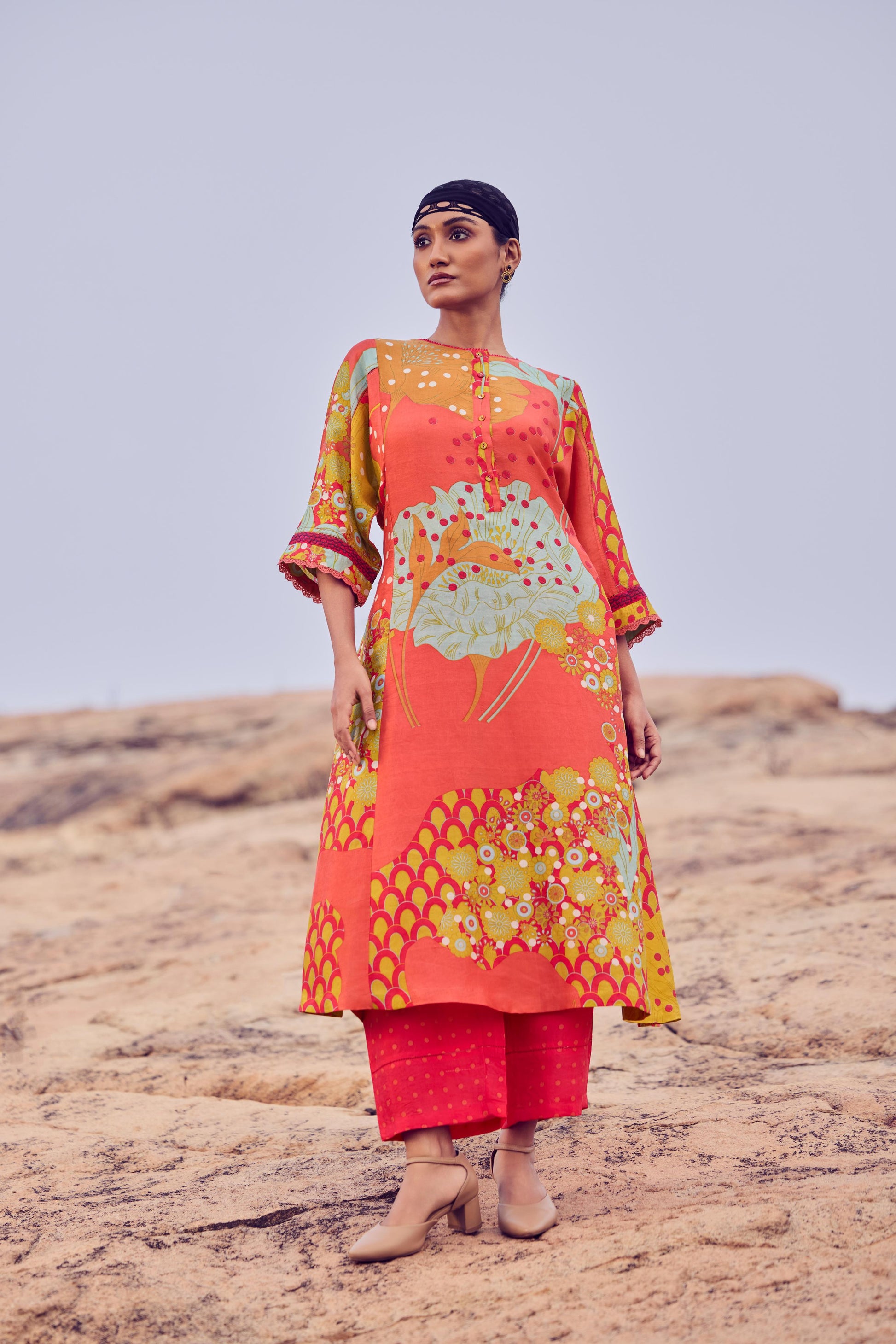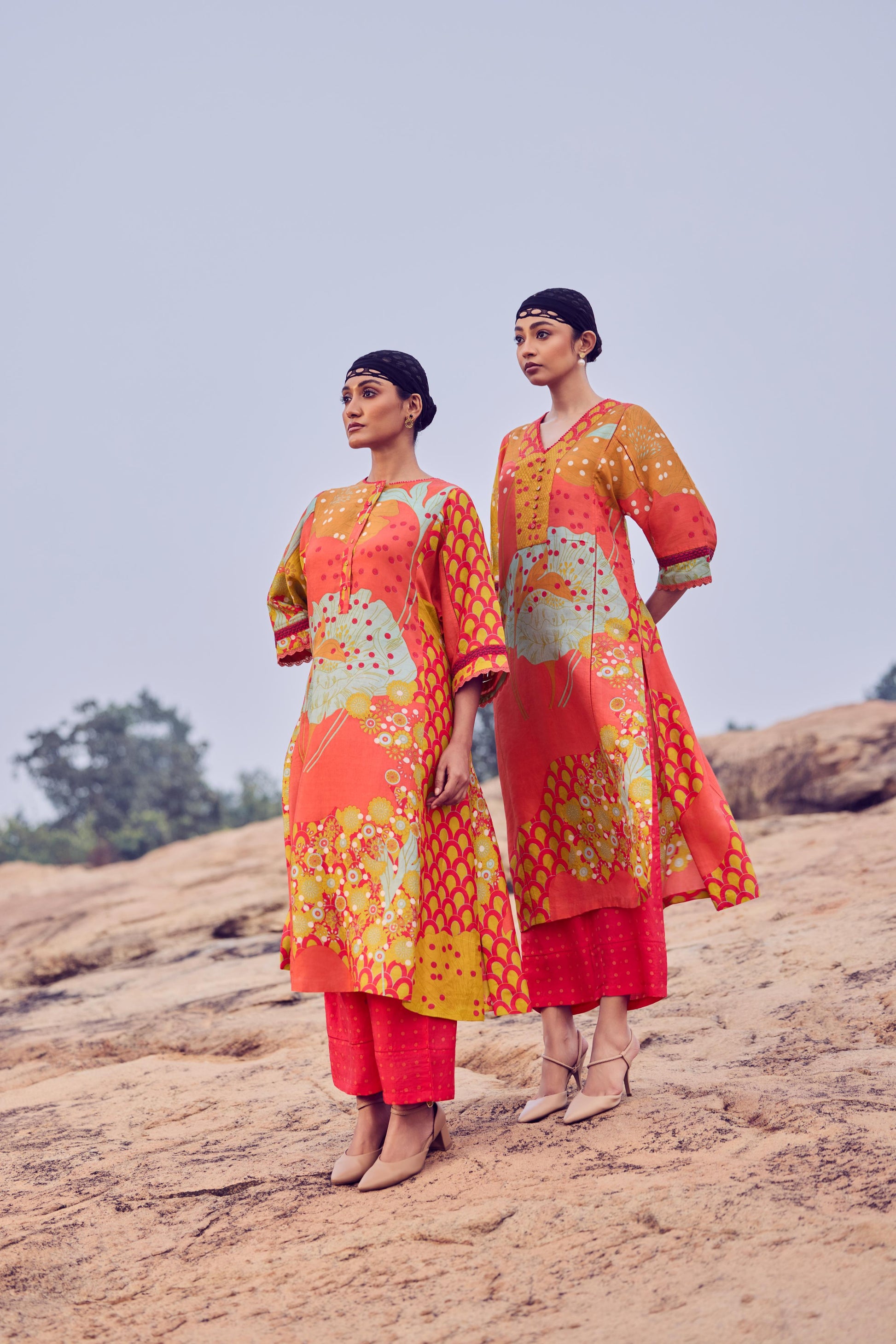 Mustard and tomato red, hand woven, hand printed A-line kurta, with kaftan cut sleeves, and embroidery detail on sleeves and back, paired with pants.
