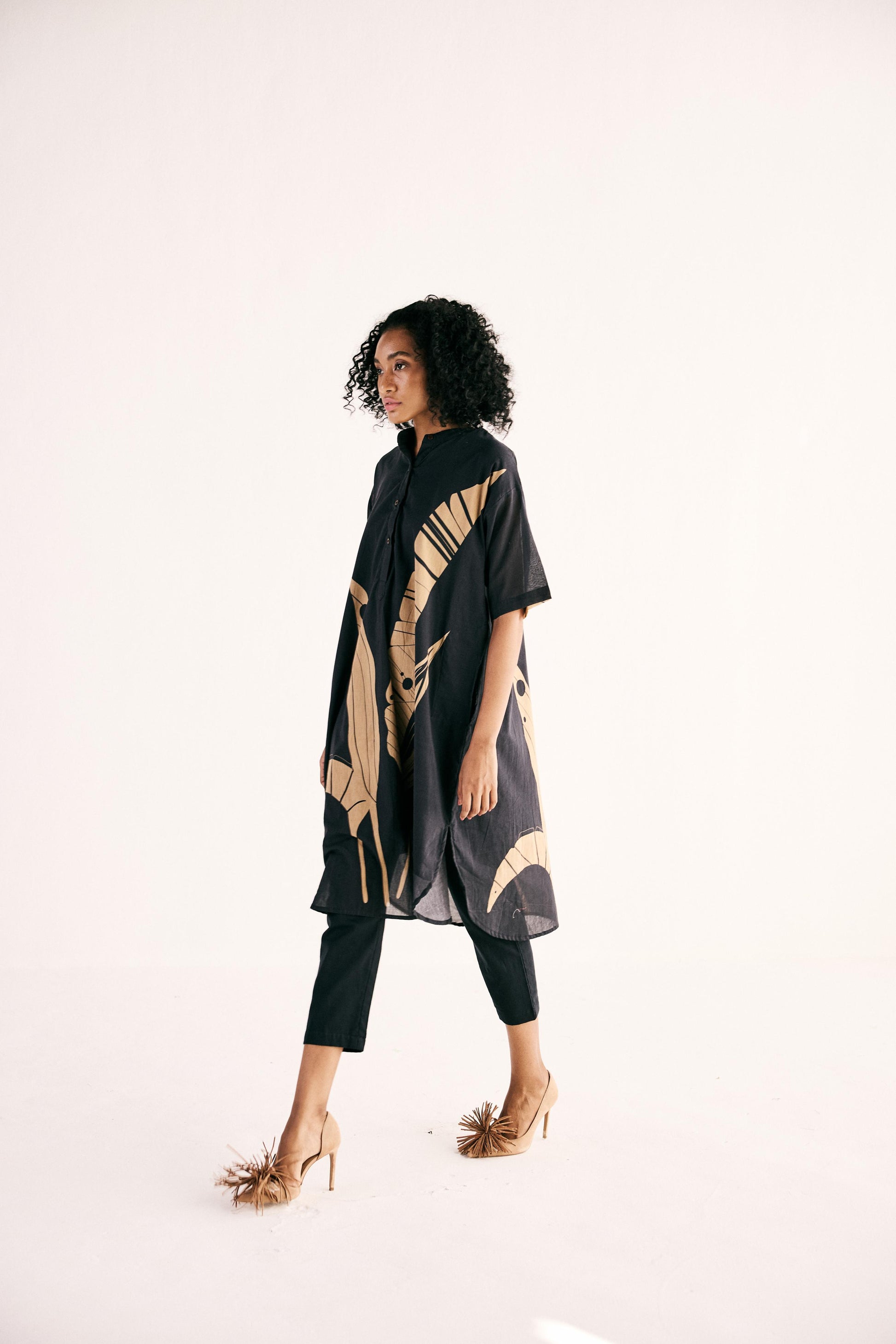 A charcoal black floral printed kurta with front button opening crafted in soft cotton mul paired with cotton mul pencil pants with elasticated back and front zipper opening with a button fastening. Kurta Set