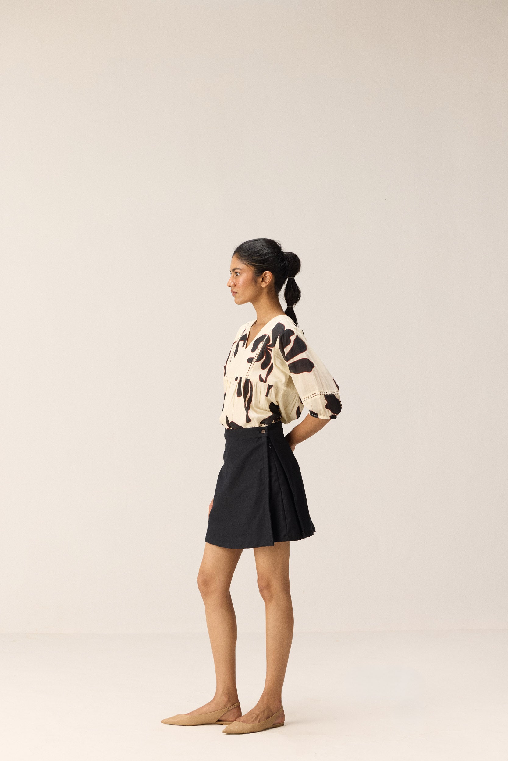 A versatile black pair of skorts crafted in sturdy cotton oxford, designed to offer the appearance of a skirt with the ease of shorts. Featuring a clean side silhouette with a concealed zipper and single-button closure, it blends structure with comfort for everyday wear.