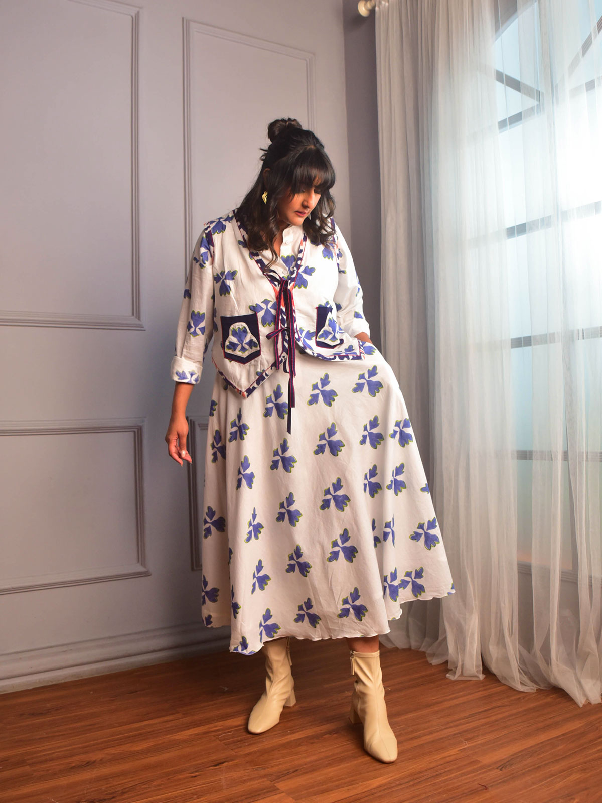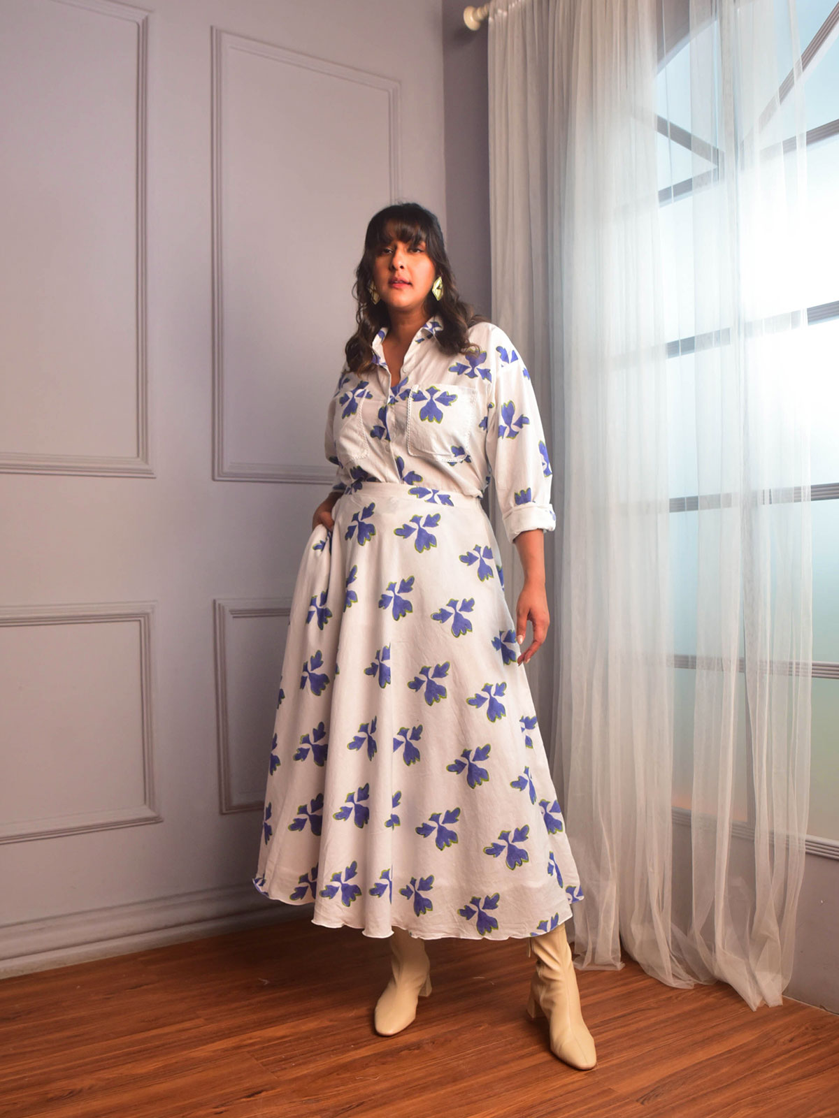 A billowy flared skirt for the festive season. Cut in our exclusive blue and white floral block-printed cotton a classic Umbrella skirt with a waist band and two inseam pockets.