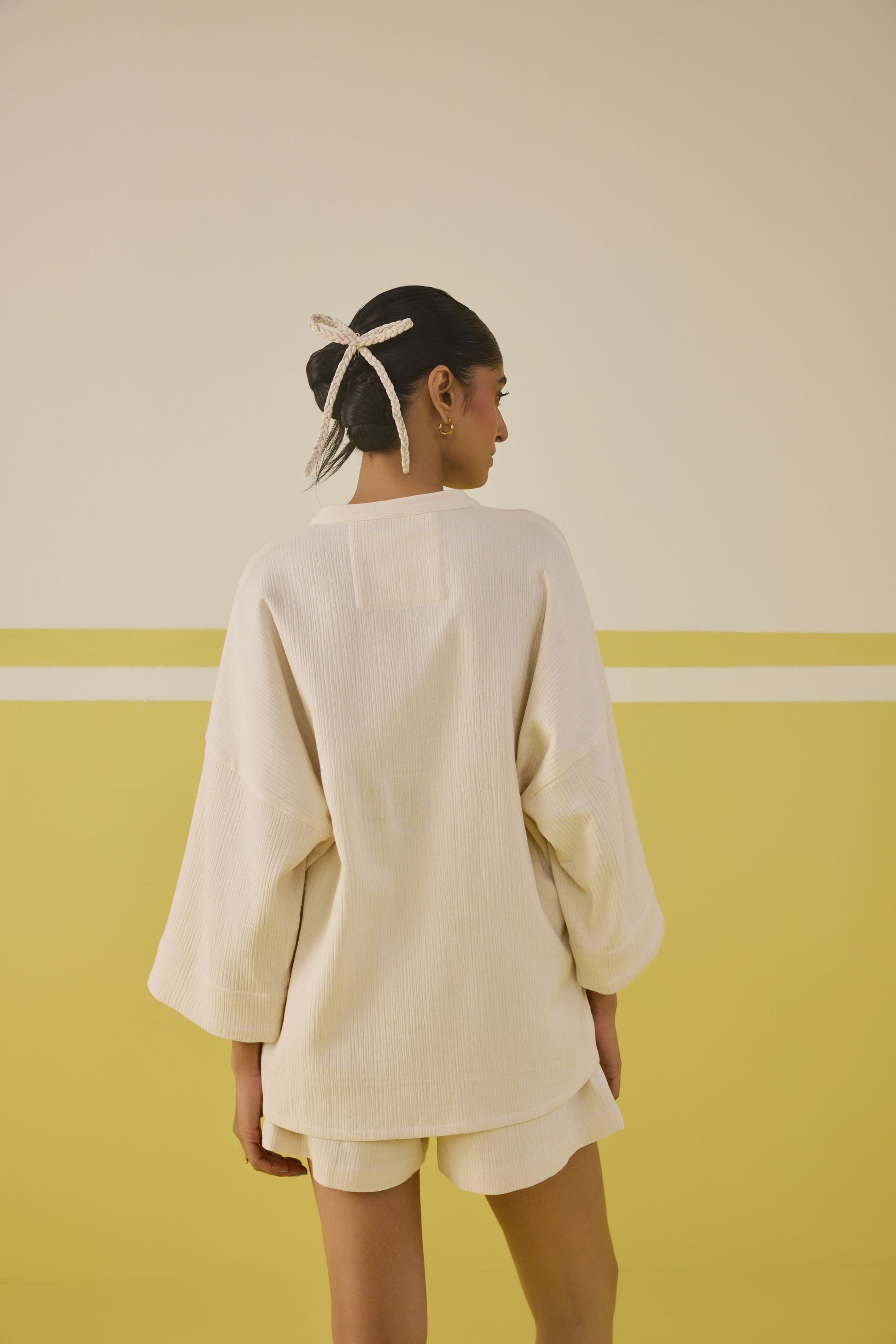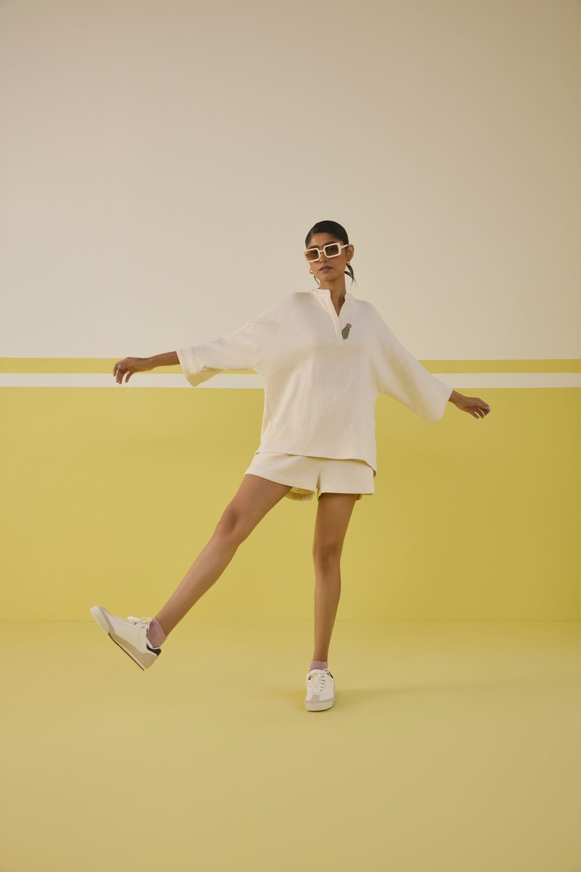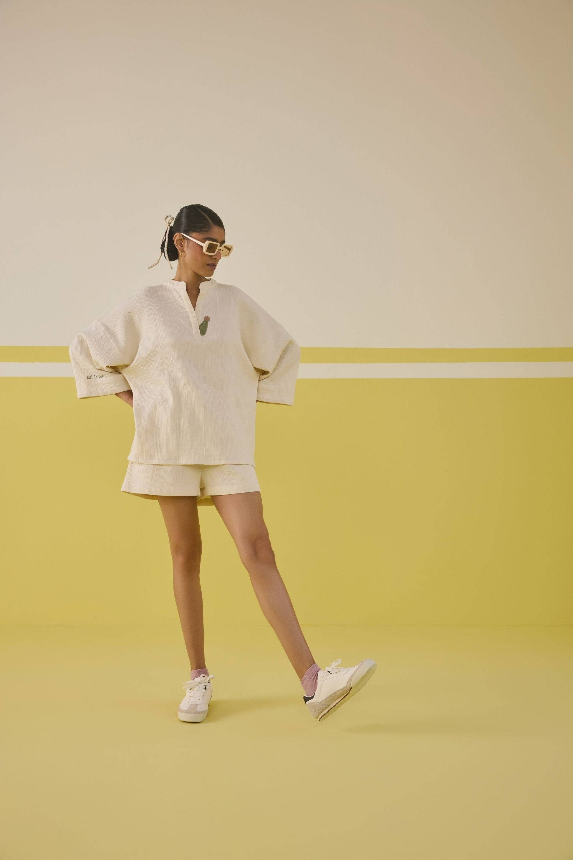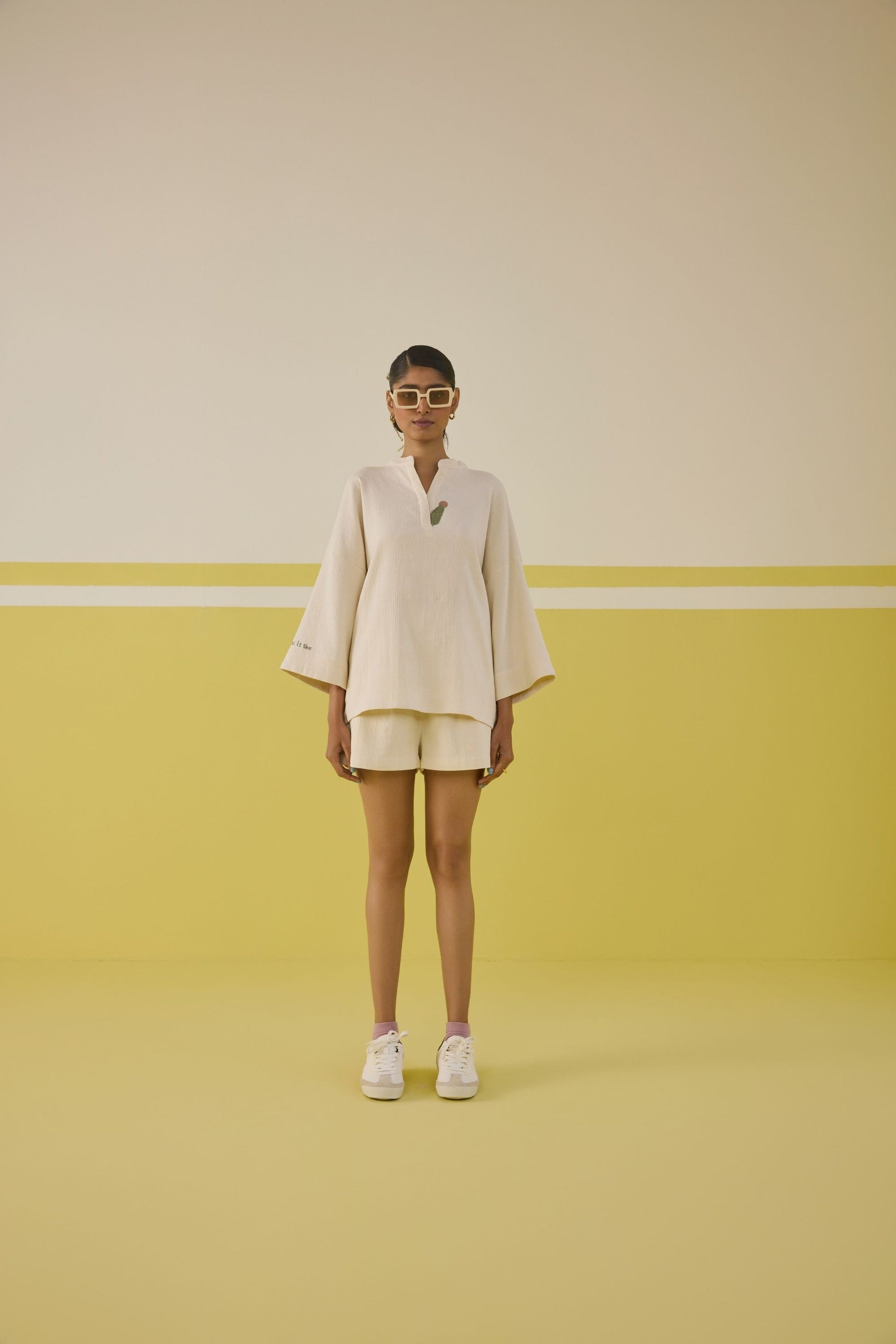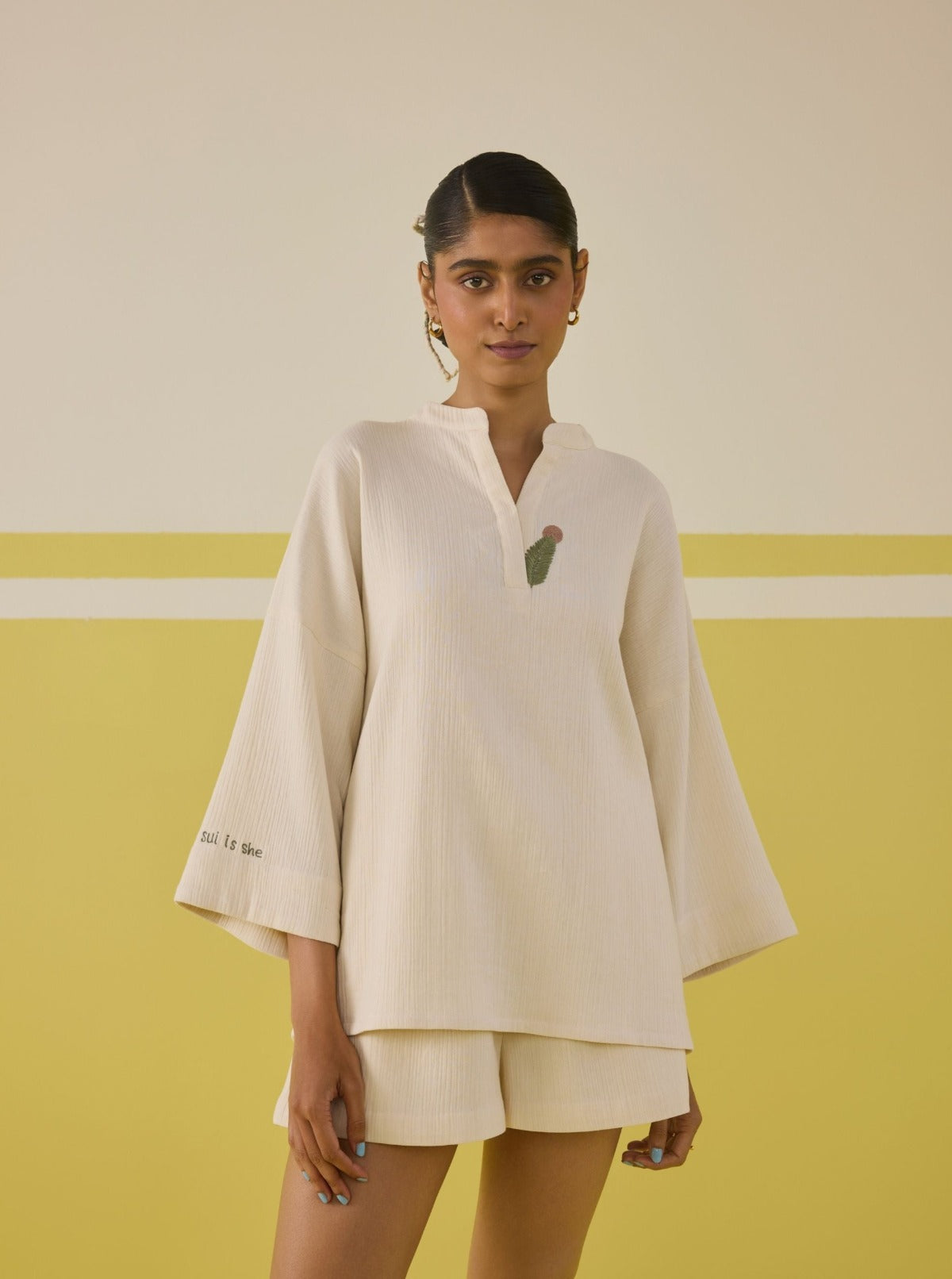 Relaxed fit, wide full sleeve, split crew neck top crafted in double gauze organic cotton fabric, hand embroidered with sun, leaf and message motifs.