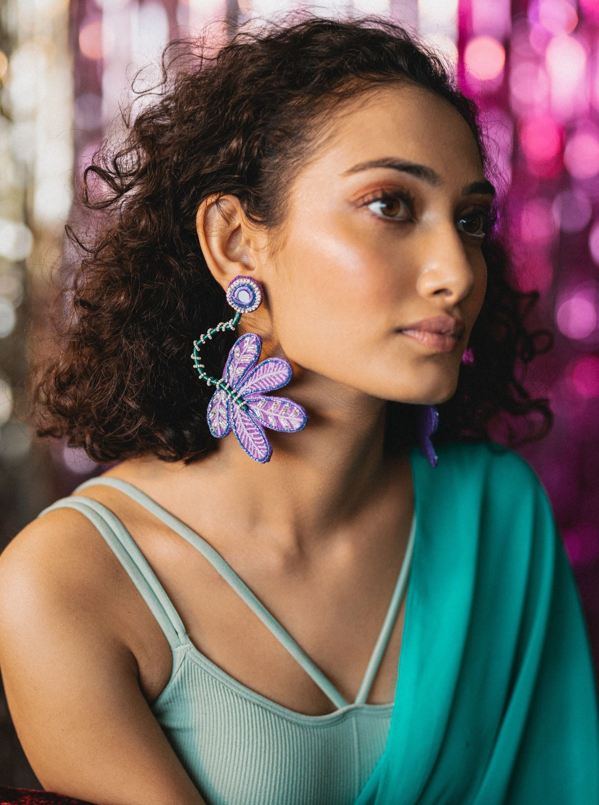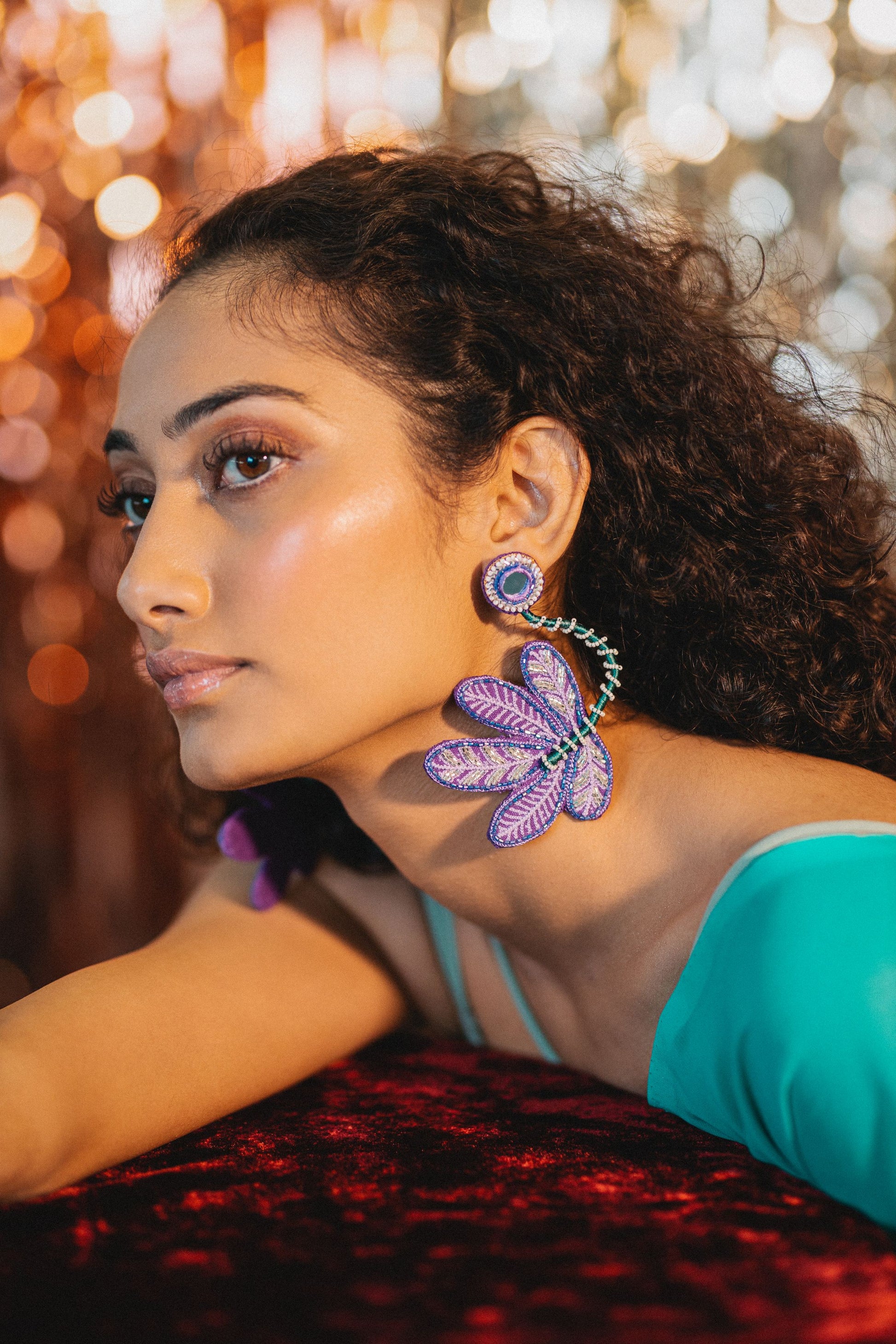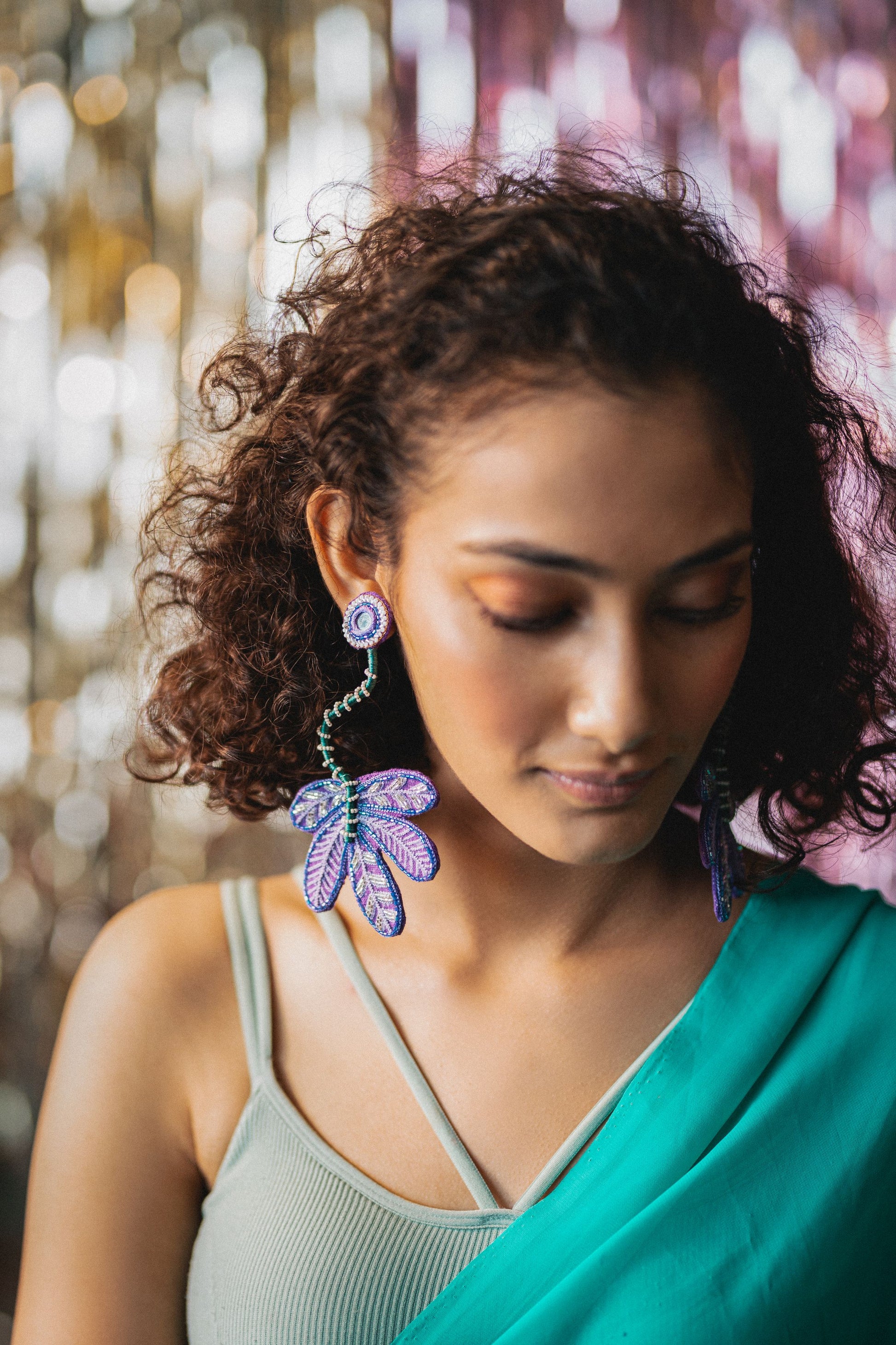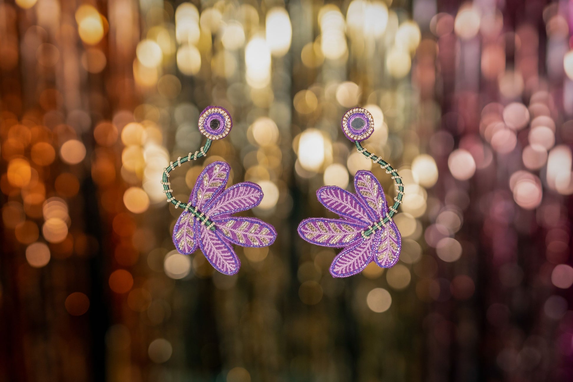 Handmade and hand embroidered earrings with our unique and intricately designed leaves, detailed with flexible bead stem which can be shaped the way you want. Provided with a stud at back. Light weight and easy to carry.