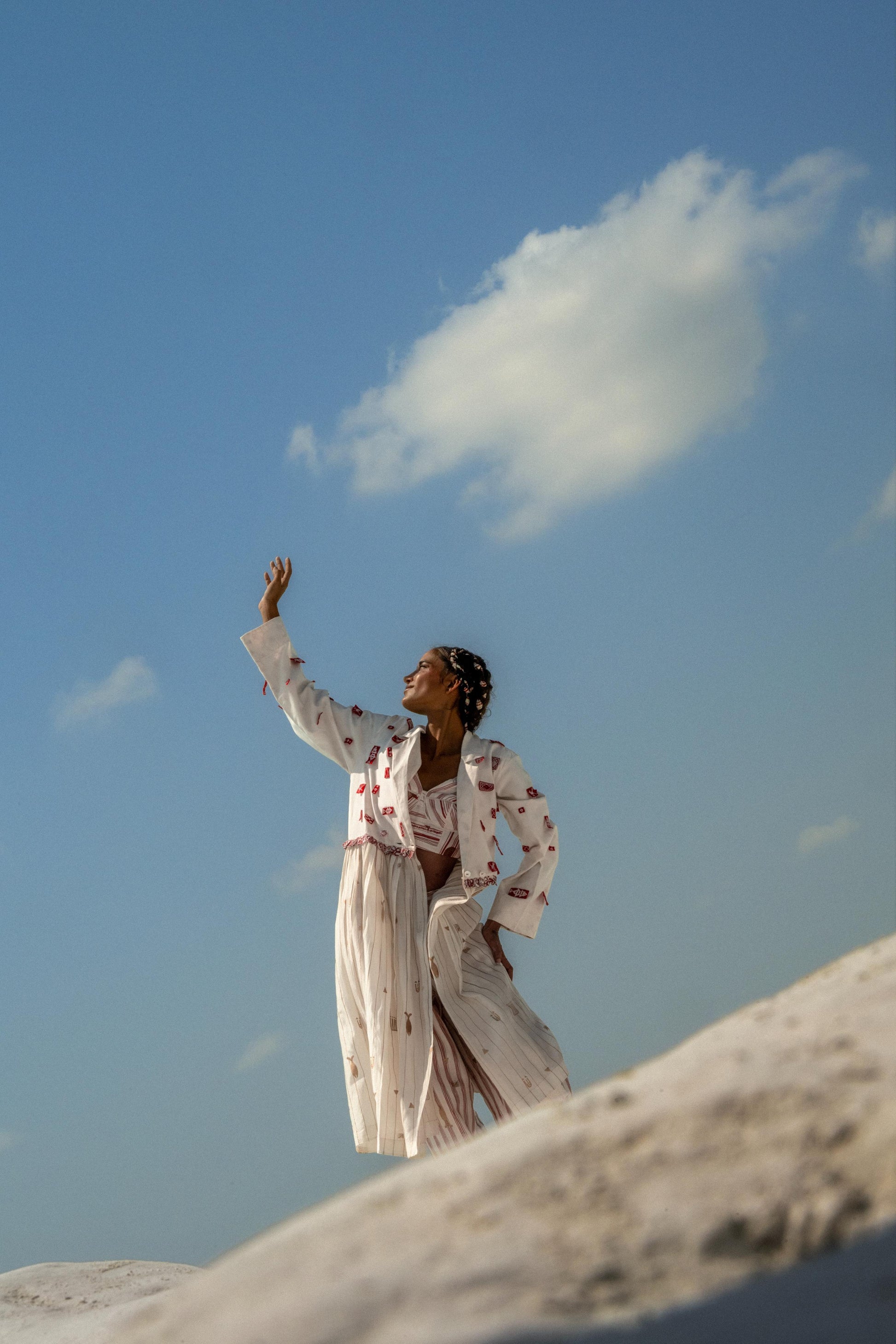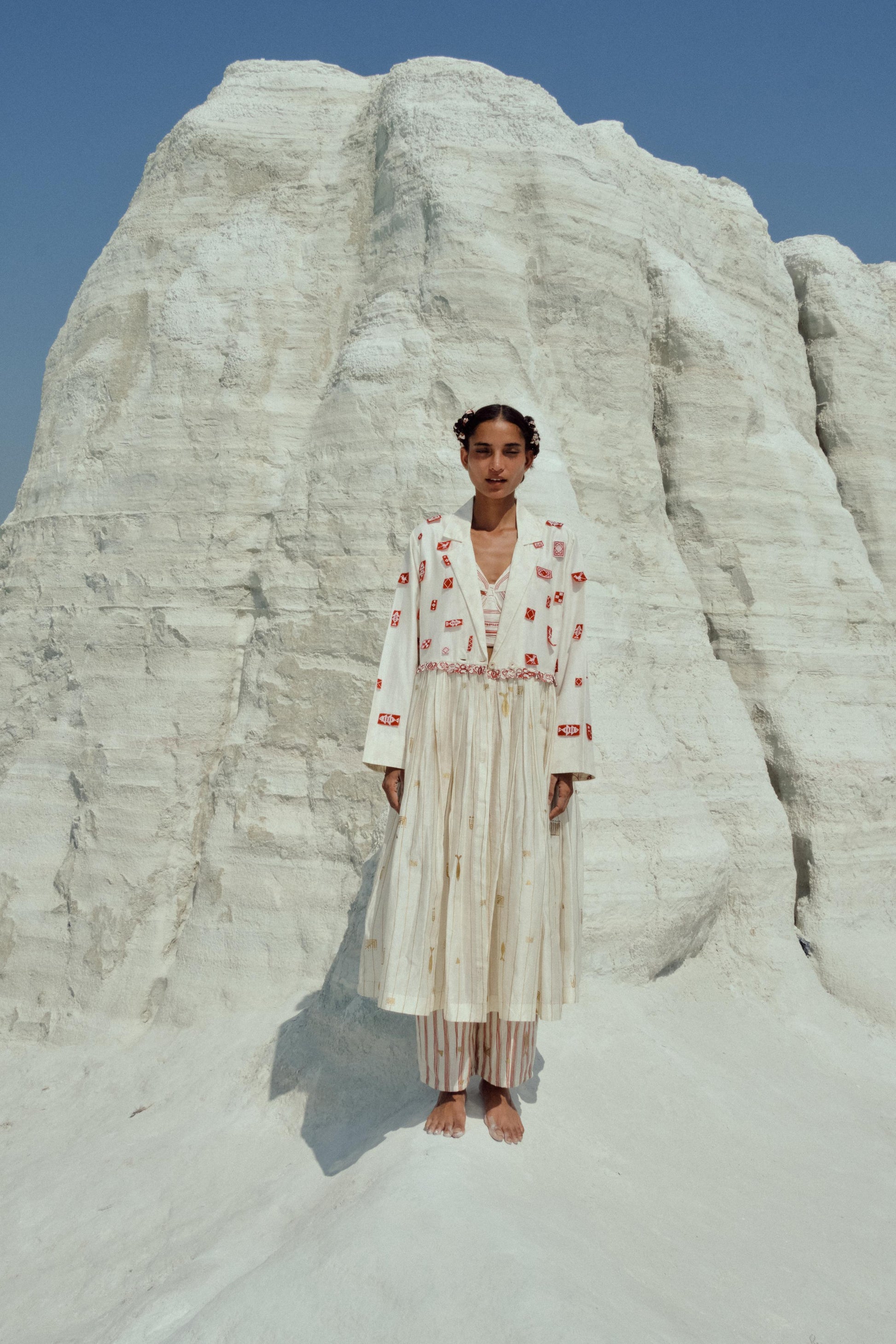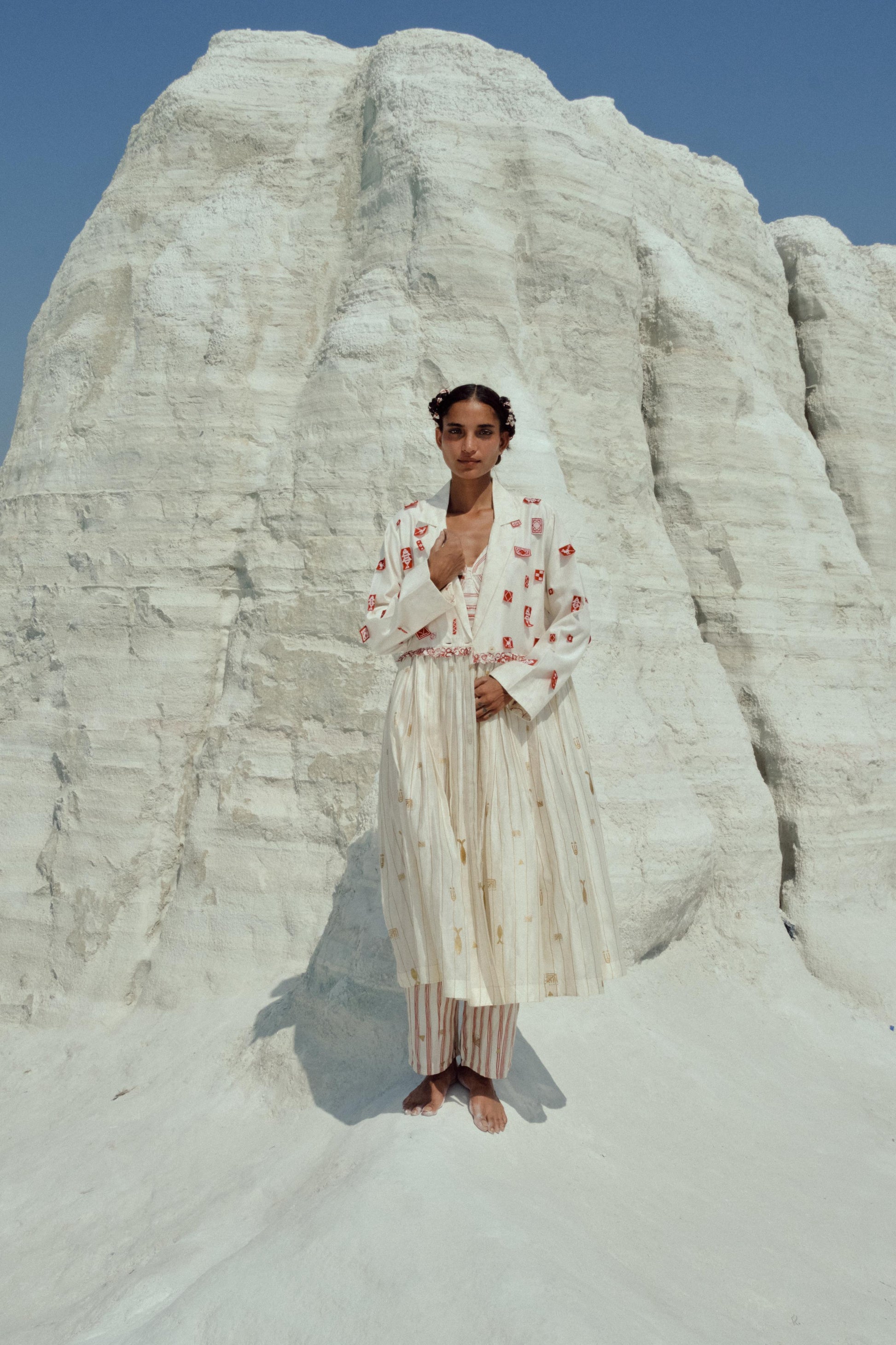 The Shin Long Jacket is crafted from hand-screen-printed cotton silk and cotton, a harmonious blend of texture and structure. Intricate hand-made beaded patches adorn the yoke on the front and back, and both sleeves, each reflecting hours of dedicated artisan labour. Light gathers at the waist provide subtle movement, while delicate hand-embroidered lace tracing the seams adds femininity to the tailored silhouette. Designed with a balance of strength and softness, this jacket flows gracefully over the body, embodying refined elegance and the quiet poetry of meticulous craftsmanship.