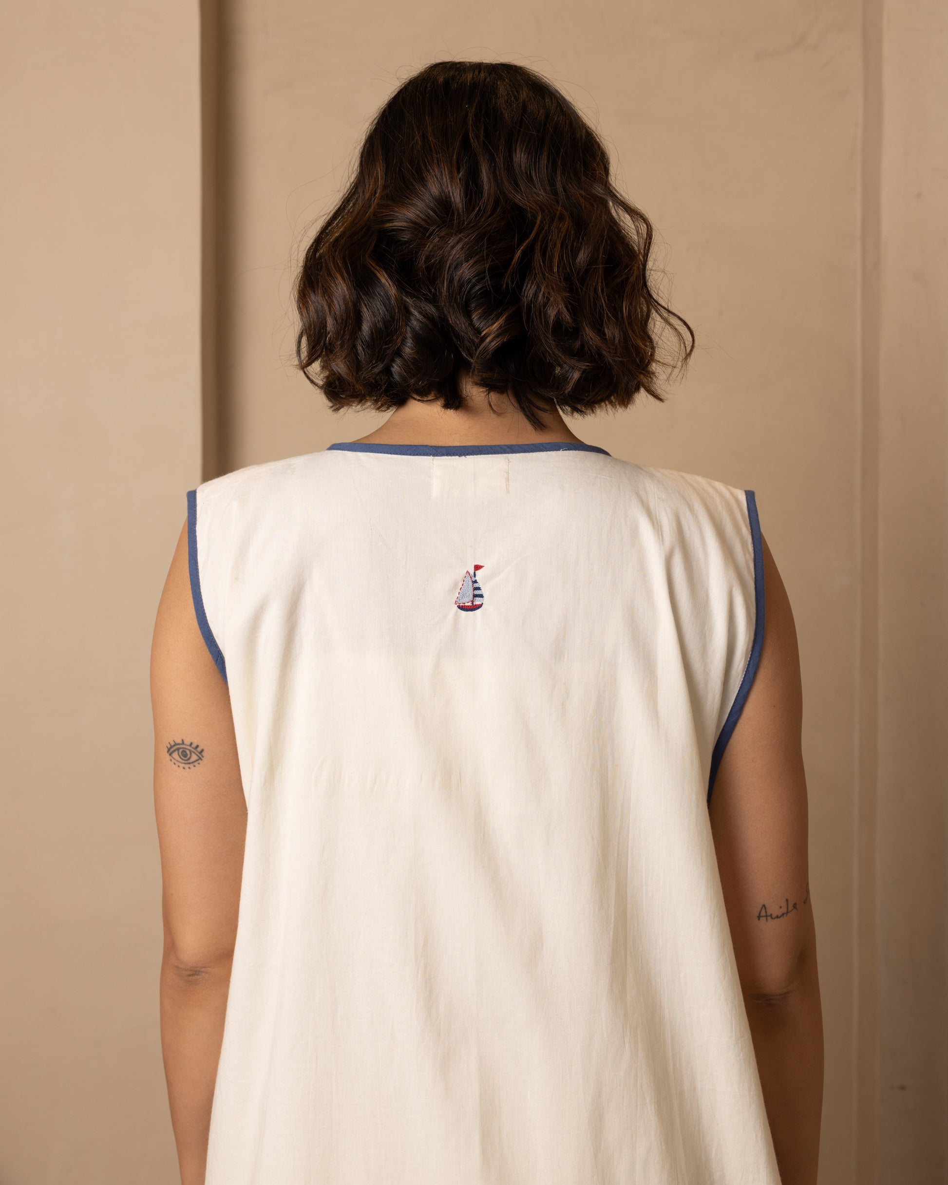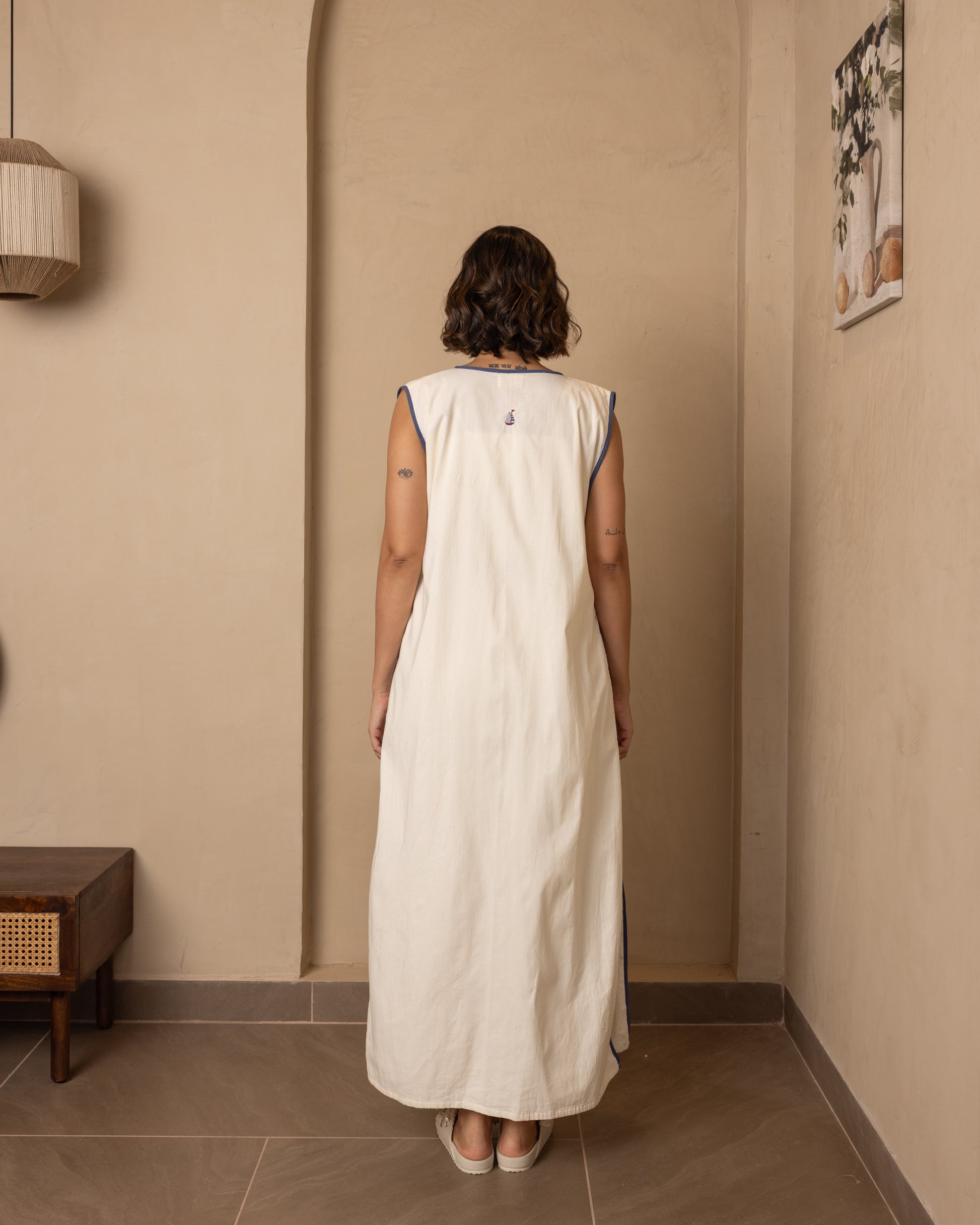 Intricate shoulder-to-sleeve lace detailing adds a touch of femininity and grace, while embroidered buttons along the neckline offer a polished finish. A standout feature of this dress is the tassel detailing on the back yoke line, adding whimsical charm and a unique focal point to the ensemble