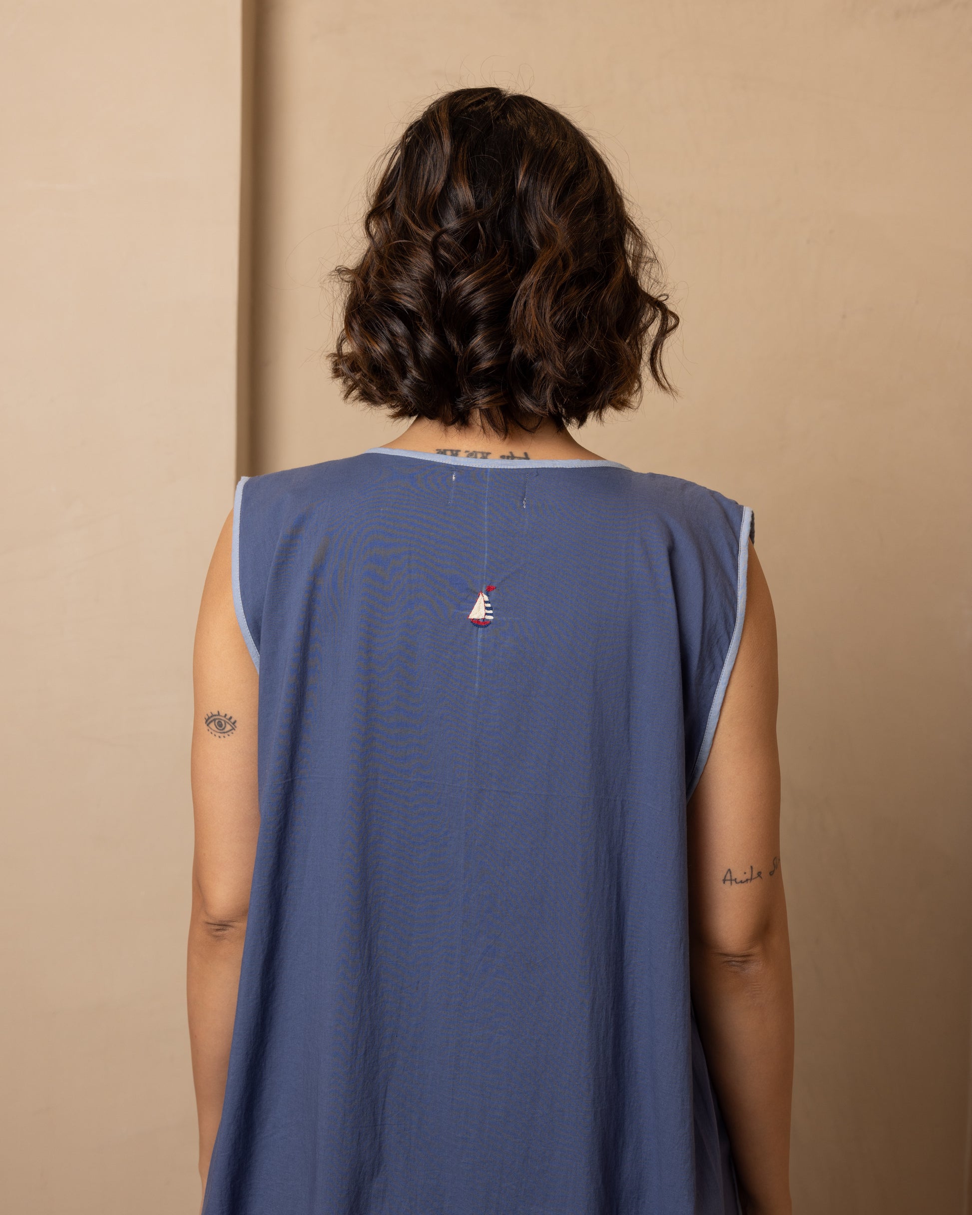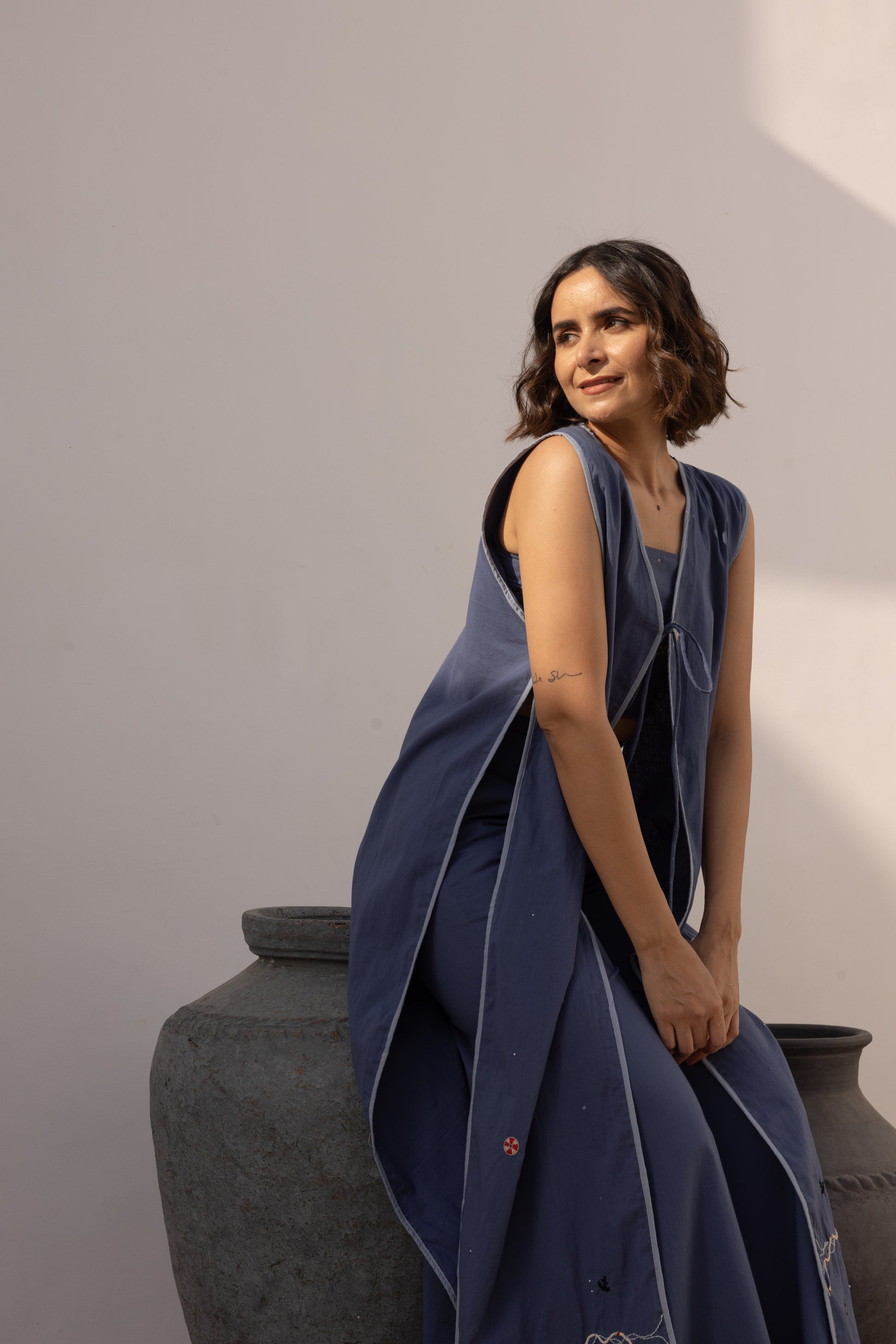 Intricate shoulder-to-sleeve lace detailing adds a touch of femininity and grace, while embroidered buttons along the neckline offer a polished finish. A standout feature of this dress is the tassel detailing on the back yoke line, adding whimsical charm and a unique focal point to the ensemble