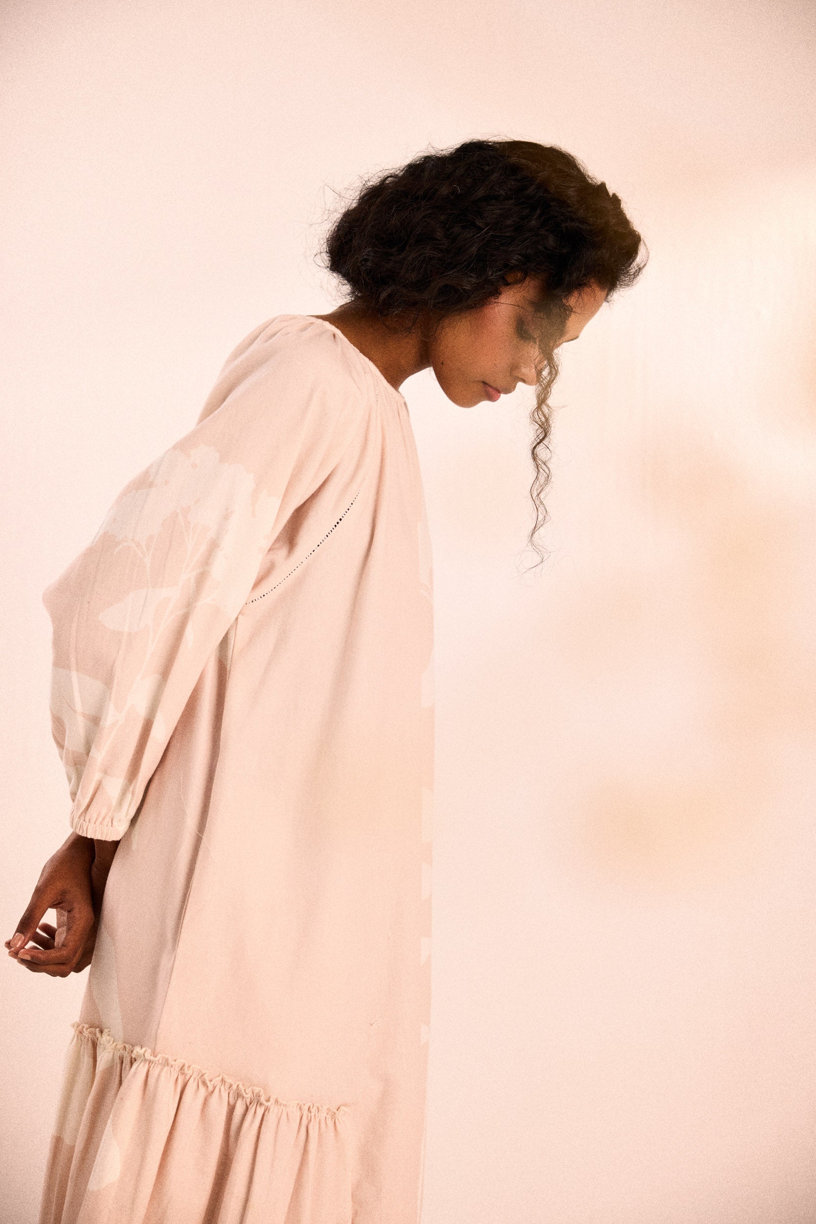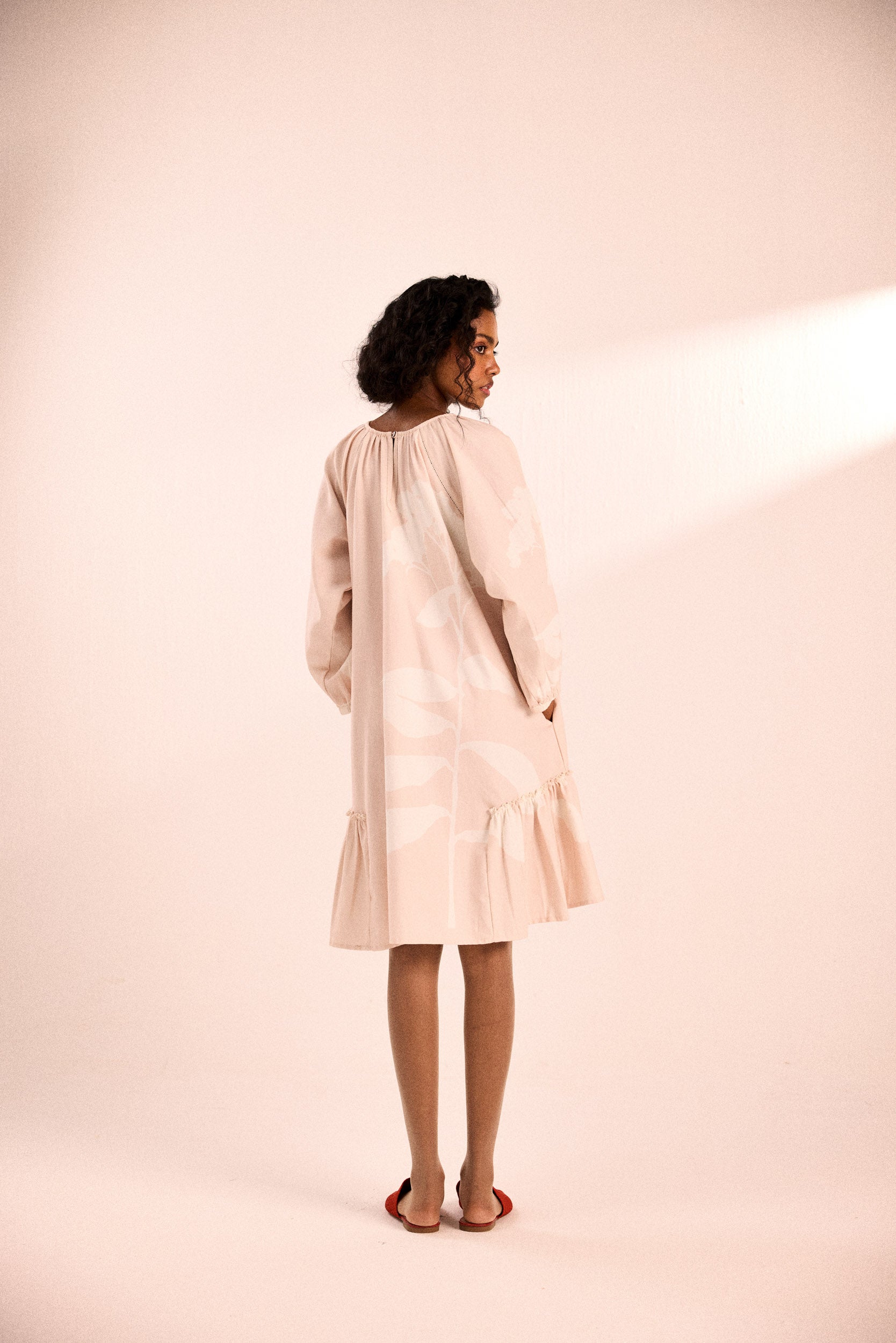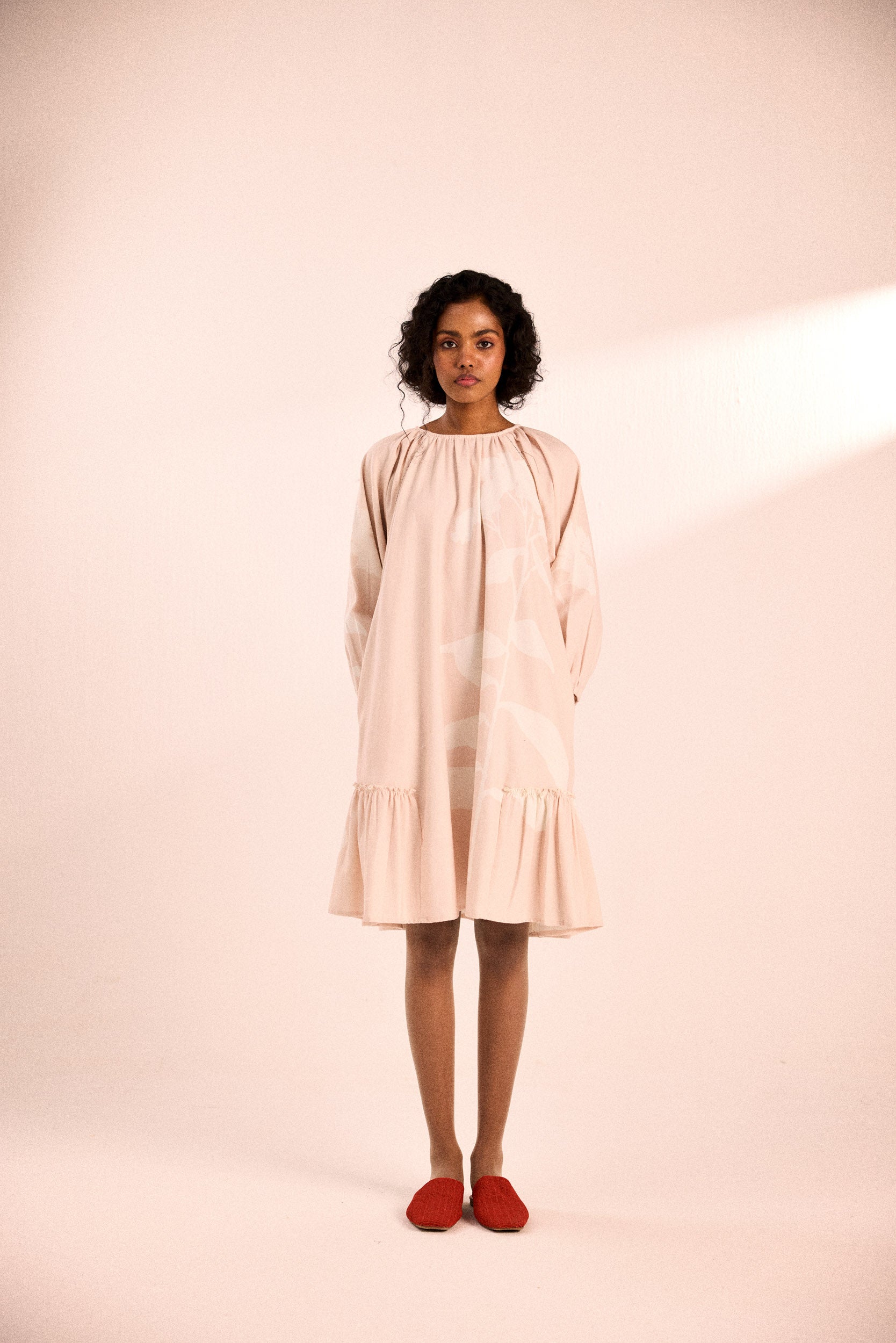 A relaxed silhouette with raglan sleeves, a gathered neckline, and a softly flared hem. Thoughtfully designed with side seam pockets for ease.