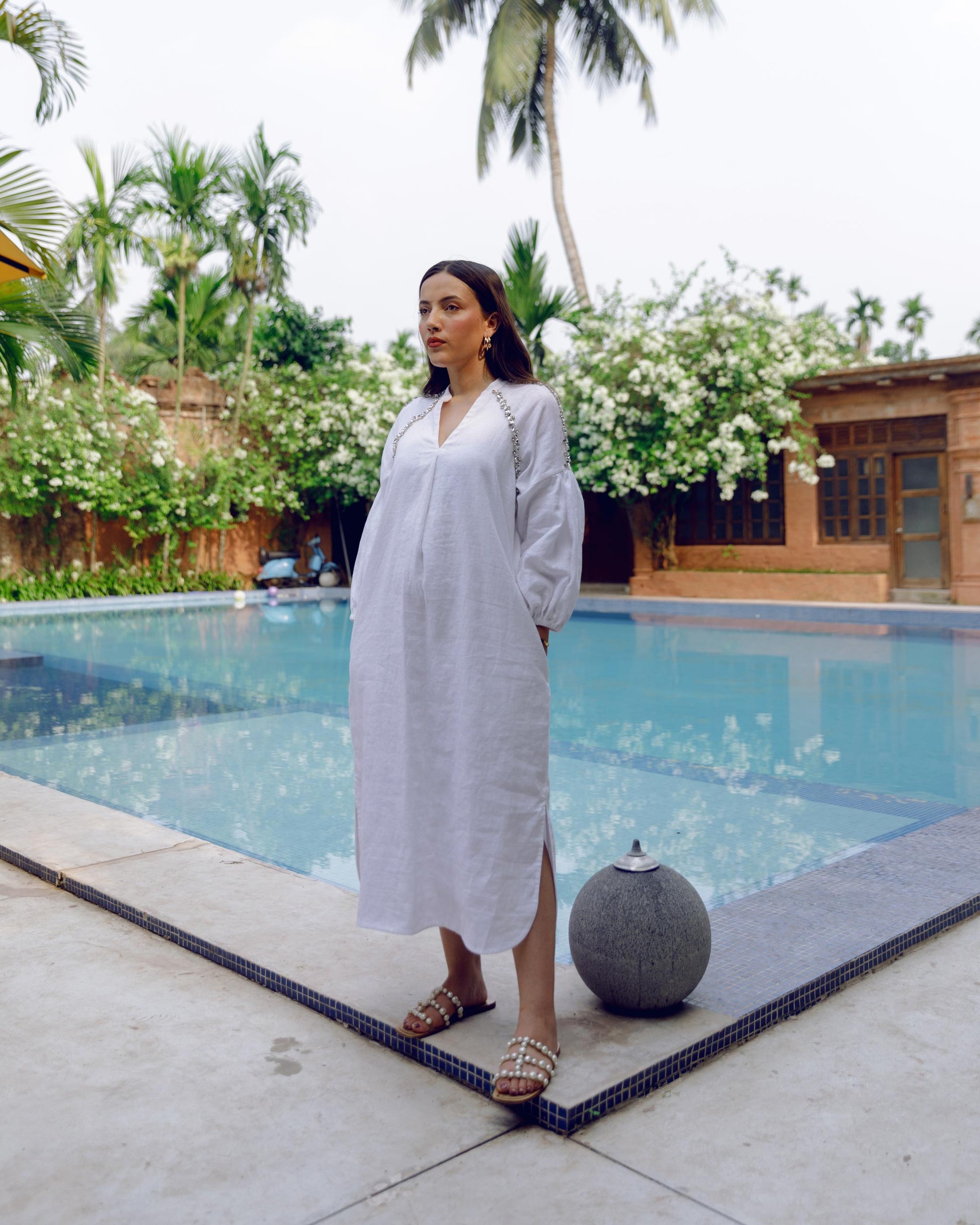 White linen straight cut midi dress with crystal embellishment. And again, it has pockets!