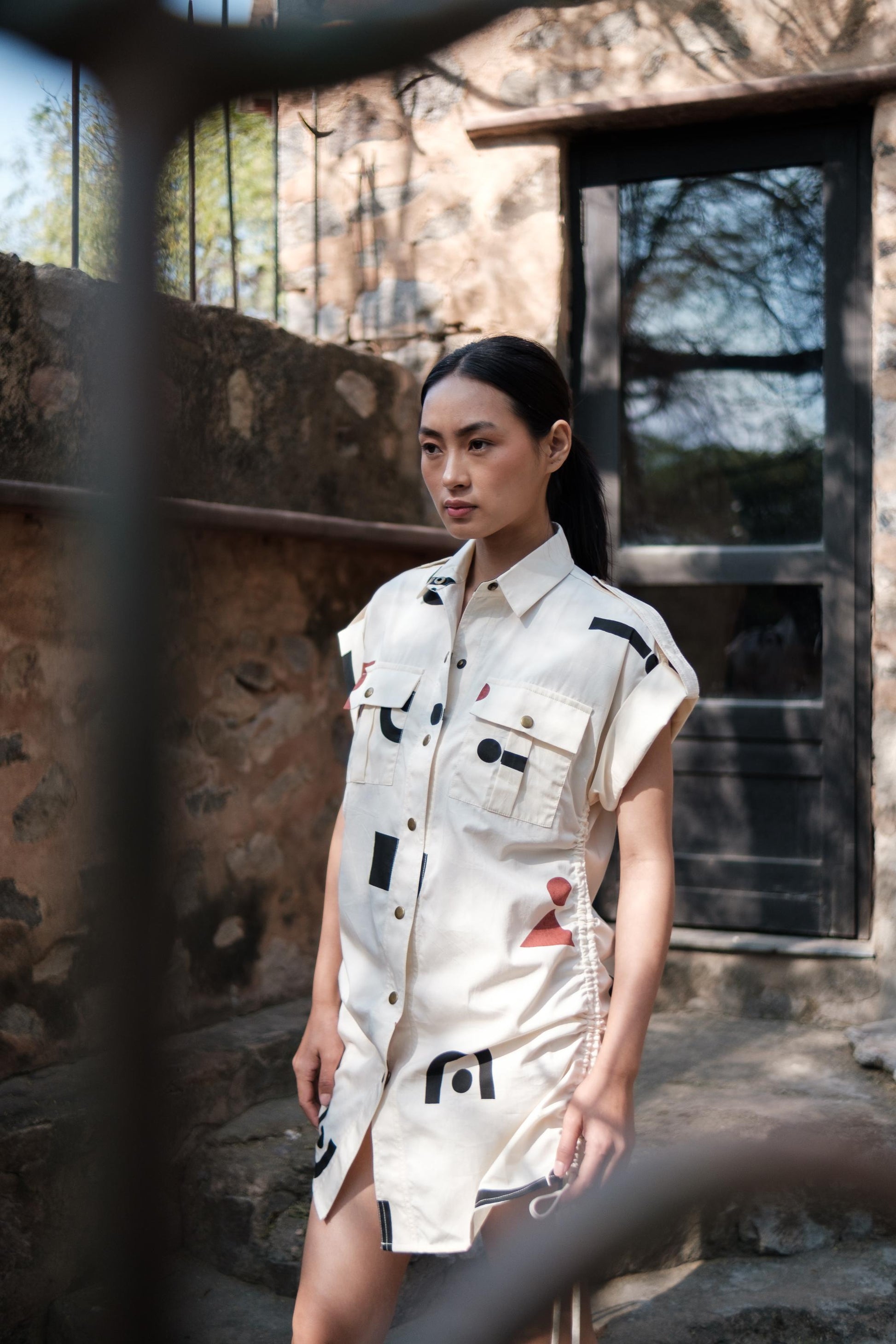 This versatile shirt can be worn as a shirt and as a dress. The side gathers lends an air of sophistication, while the inclusion of patch pockets infuses a street-inspired essence, achieving a harmonious balance of style and comfort.