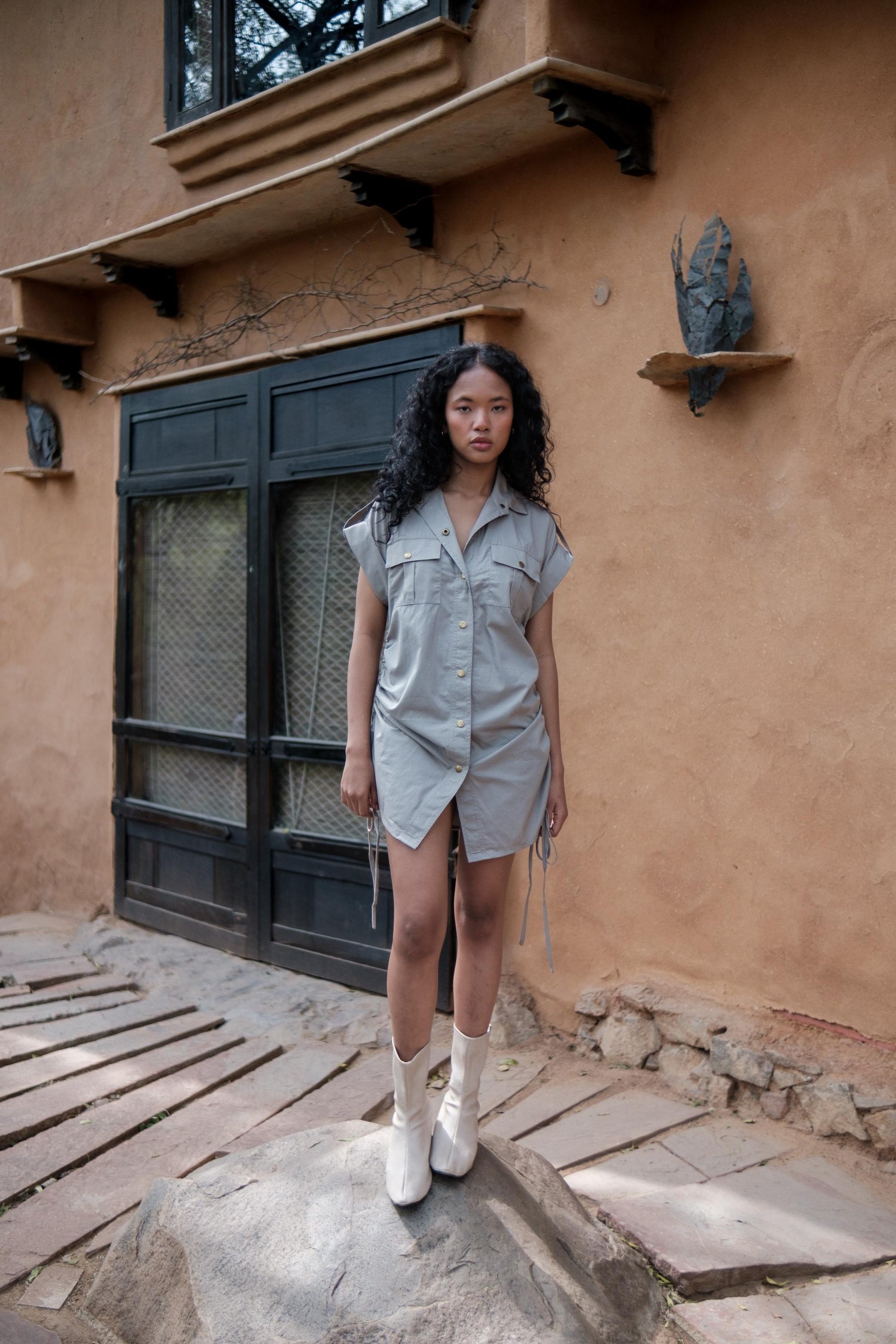 This versatile shirt can be worn as a shirt and as a dress. The side gathers lends an air of sophistication, while the inclusion of patch pockets infuses a street-inspired essence, achieving a harmonious balance of style and comfort.