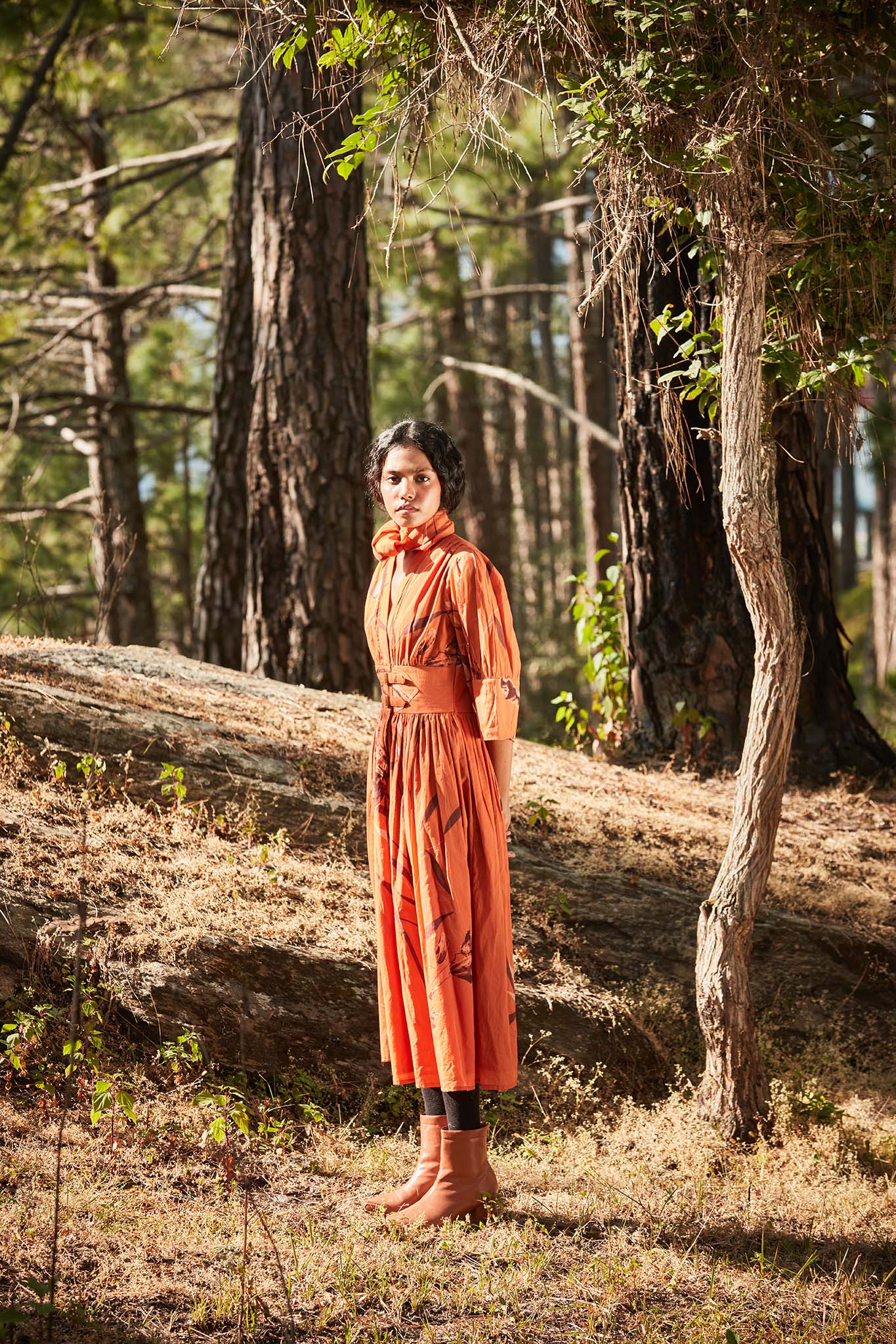 A stunning orange dress inspired by the sunset in the mountains, featuring a fitted waist with adjustable buckles for a customized fit. It is designed with a front opening, secured with hooks and comes with three quarter sleeves.