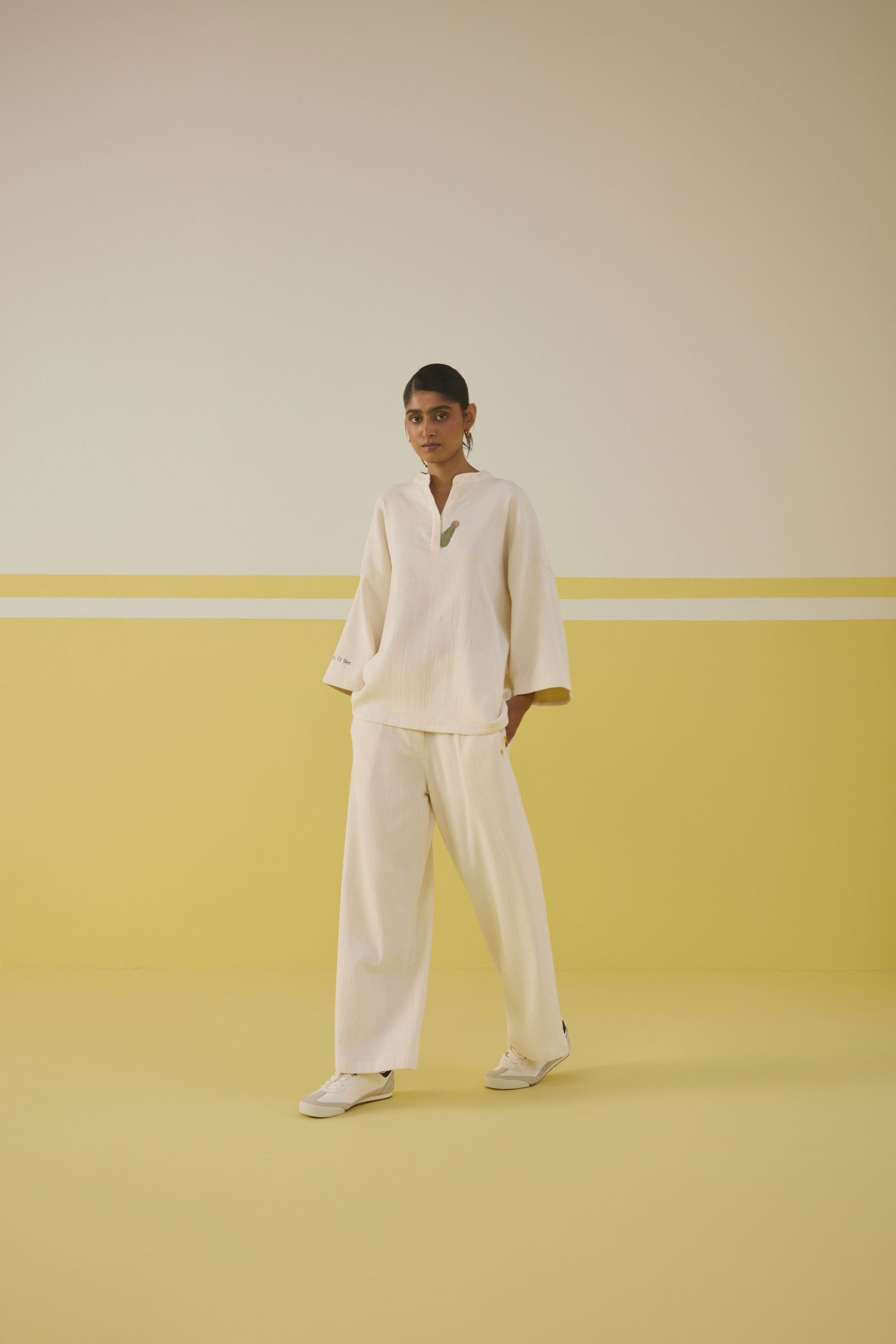 Fitted, wide-leg trousers crafted in double gauze organic cotton fabric, hand embroidered with a flower motif.