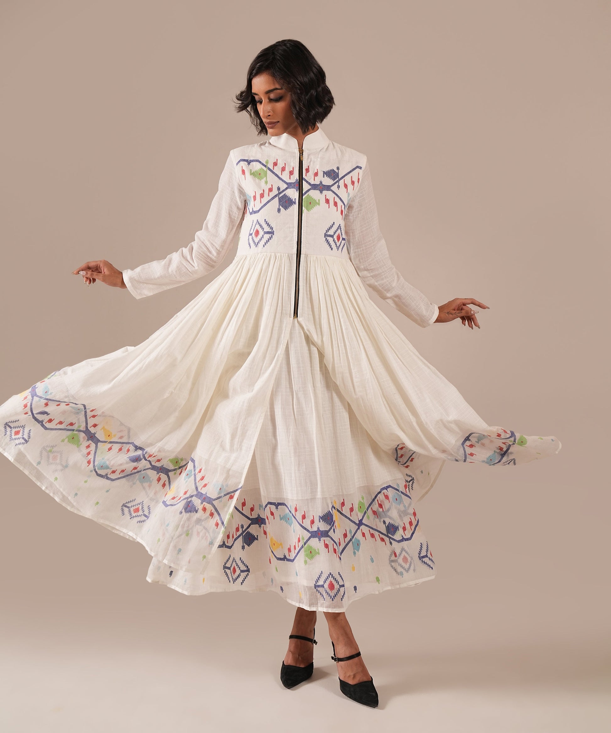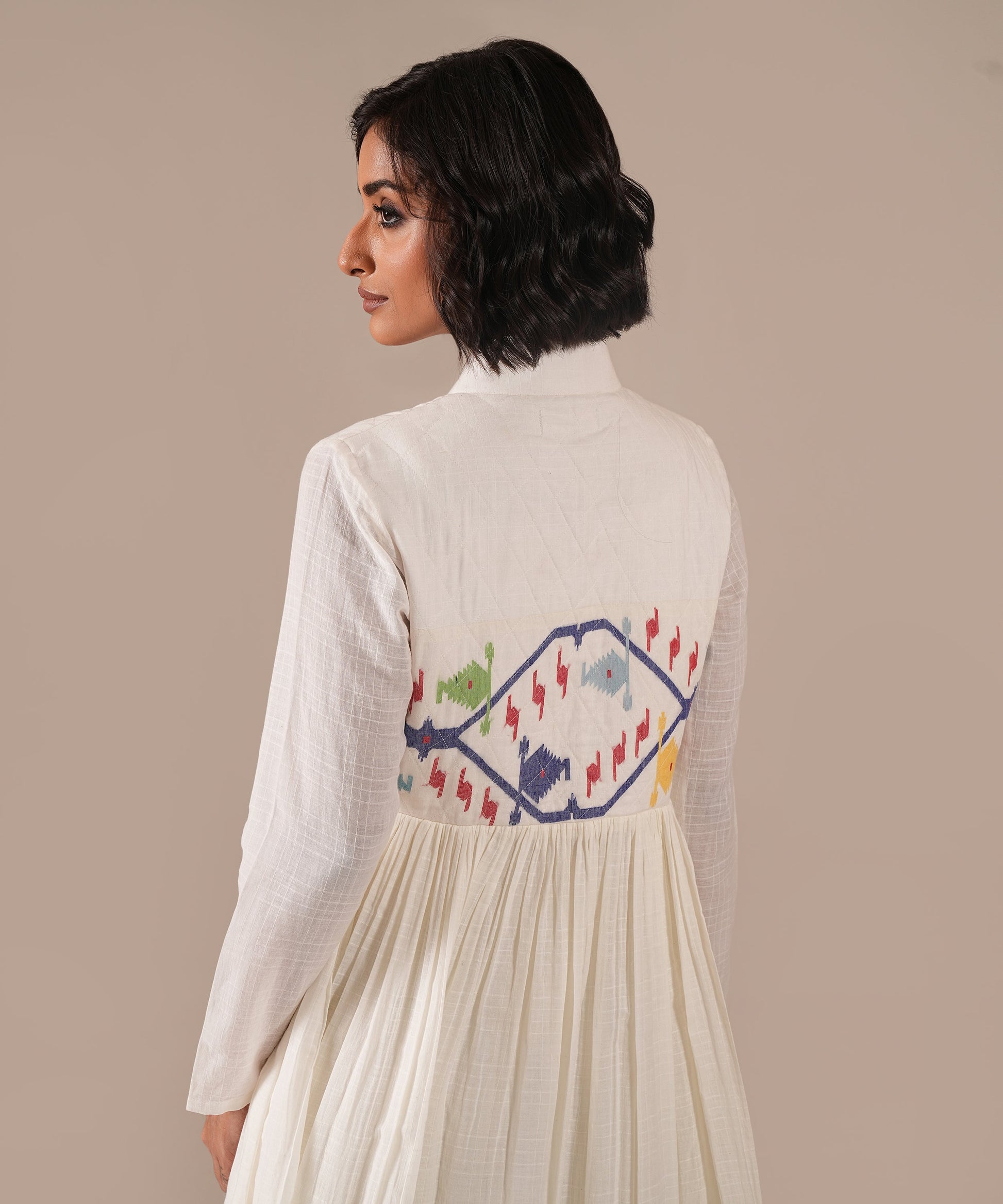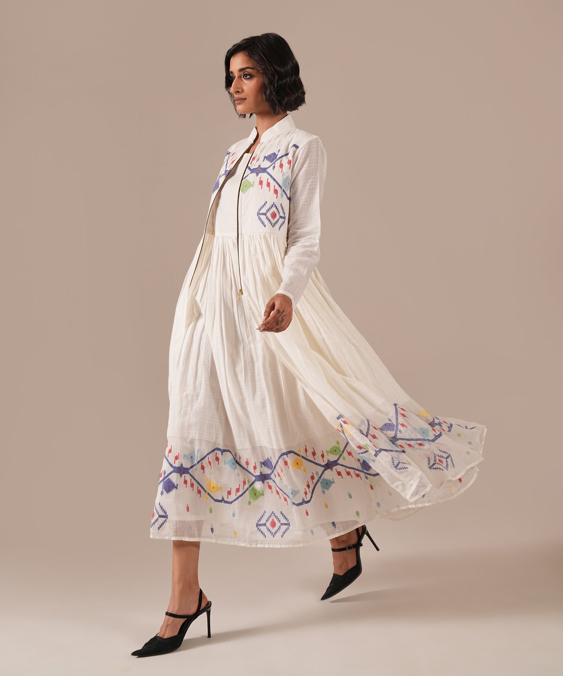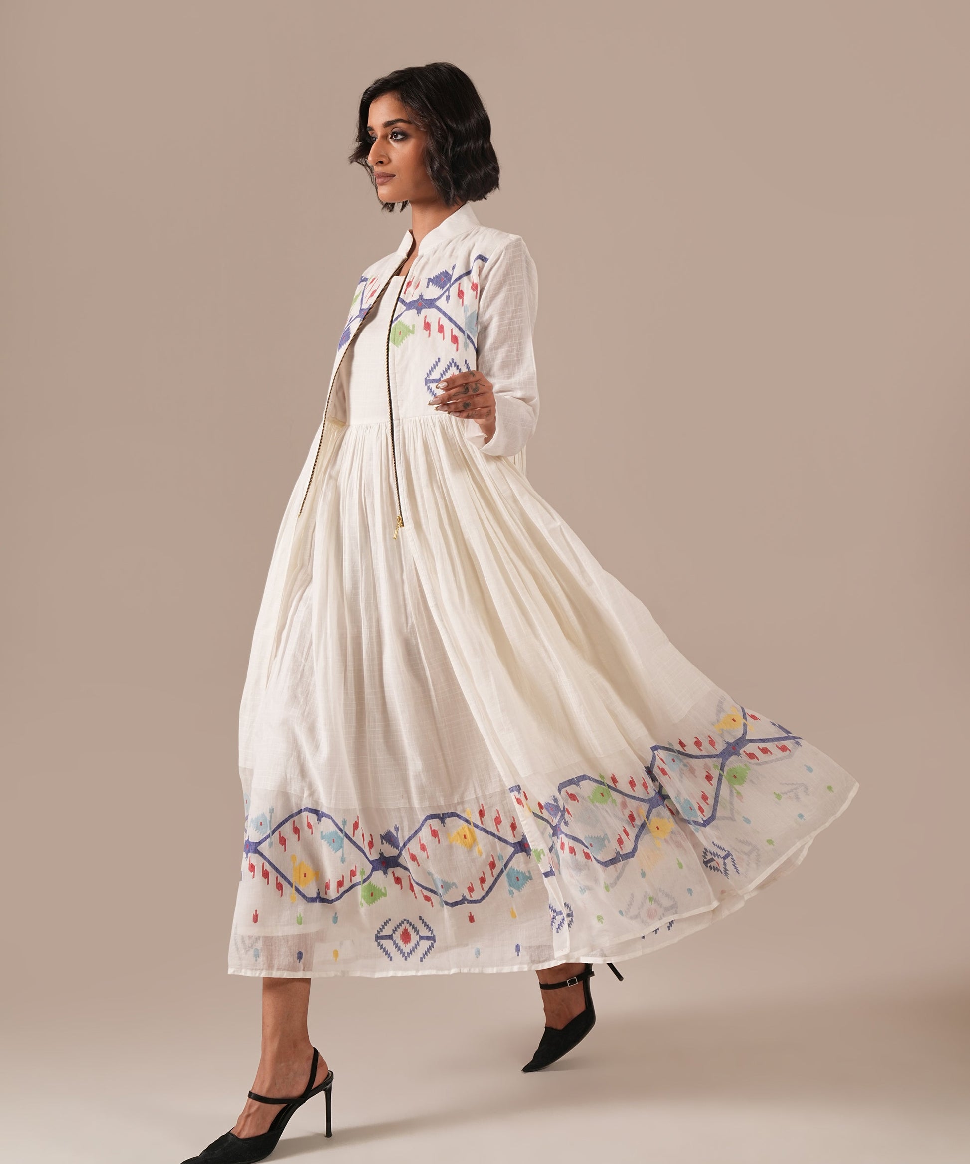 amdani over Jamdani. This masterpiece features an intricately woven gathered Jamdani dress paired with a matching Jamdani overlay with voluminous gathers, a quilted bodice, and front metal zipper fastening. A wearable work of art, it celebrates Indian crafts and is sure to turn heads wherever you go.