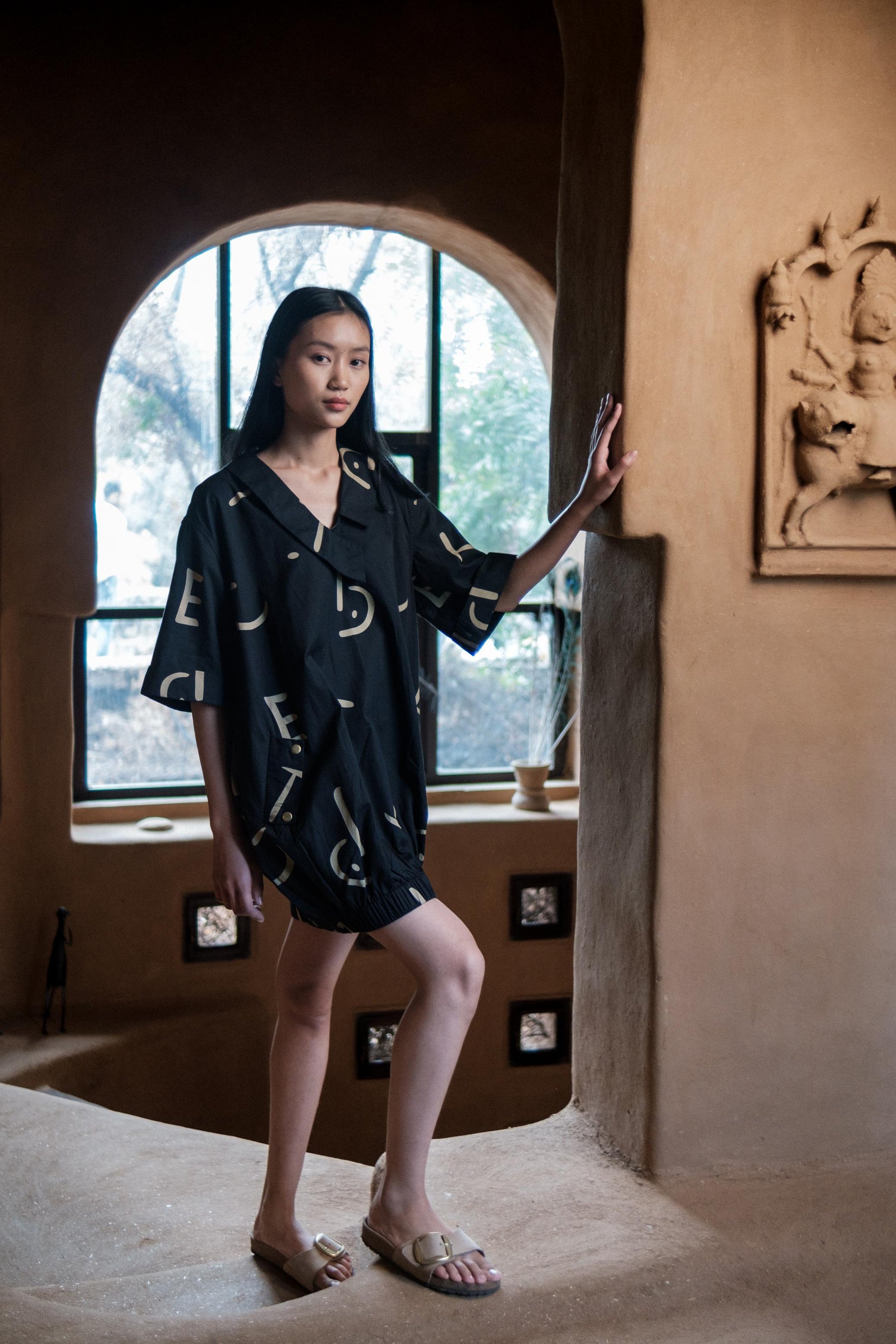 An oversized shift dress with elasticated hem detail , pockets and asymmetrical collar is the perfect defination of casual chic.